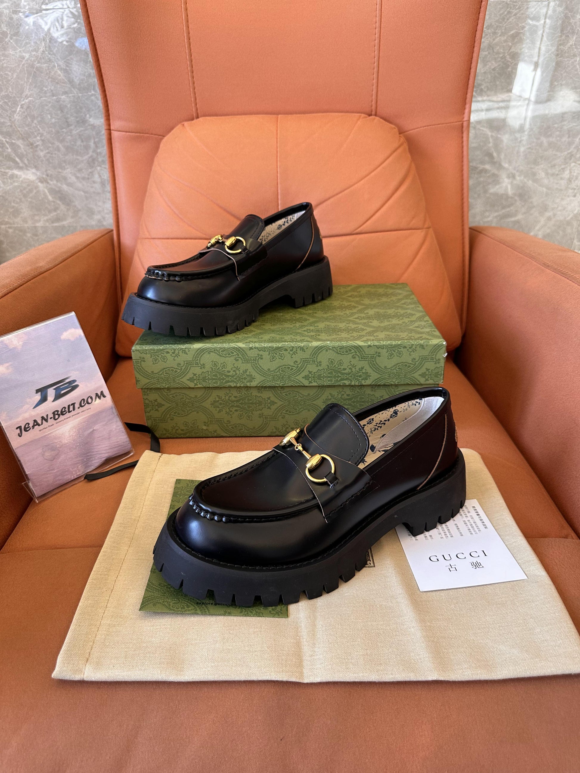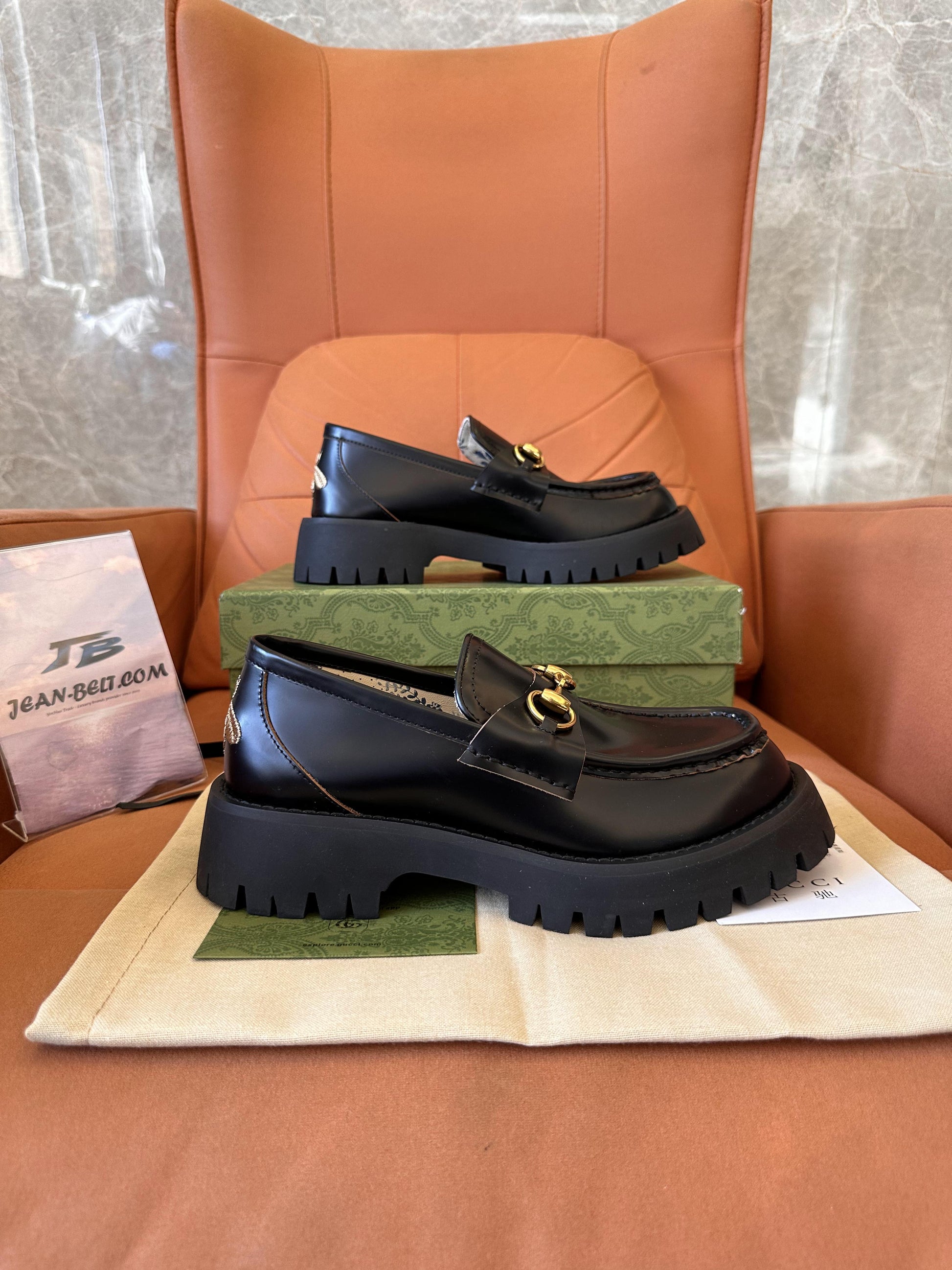 Mocasín Gucci de piel negra para mujer con suela gruesa y detalle de caballo dorado