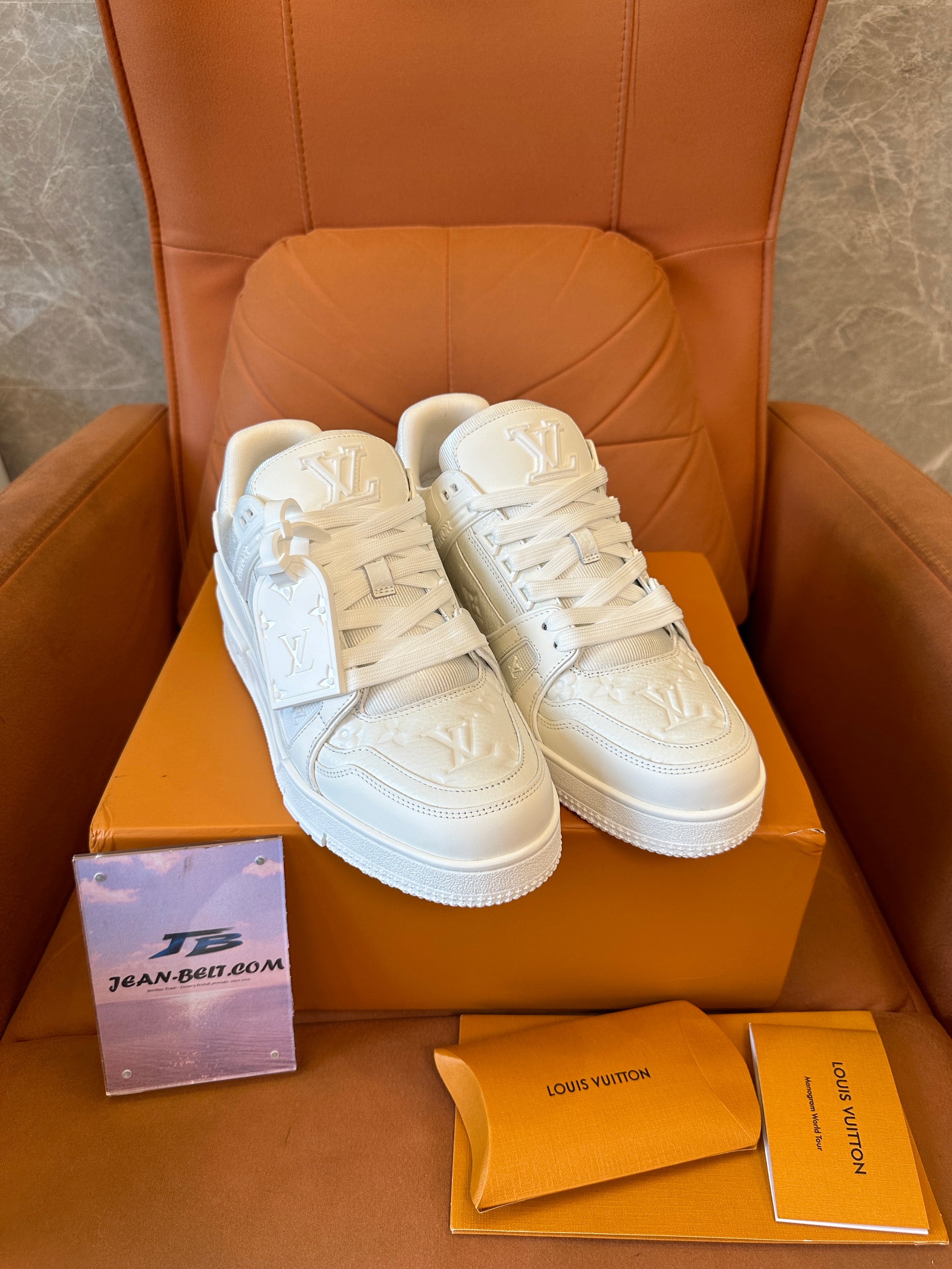 Step into luxury with the iconic Louis Vuitton Trainer sneaker in full white. Crafted from premium embossed calf leather, this low-top silhouette blends streetwear flair with timeless elegance. The signature LV monogram is subtly integrated into the upper for a refined yet recognizable finish. Featuring a cushioned sole, adjustable strap, and tonal laces, this sneaker delivers both comfort and high-end appeal. A must-have for collectors and style-forward individuals.