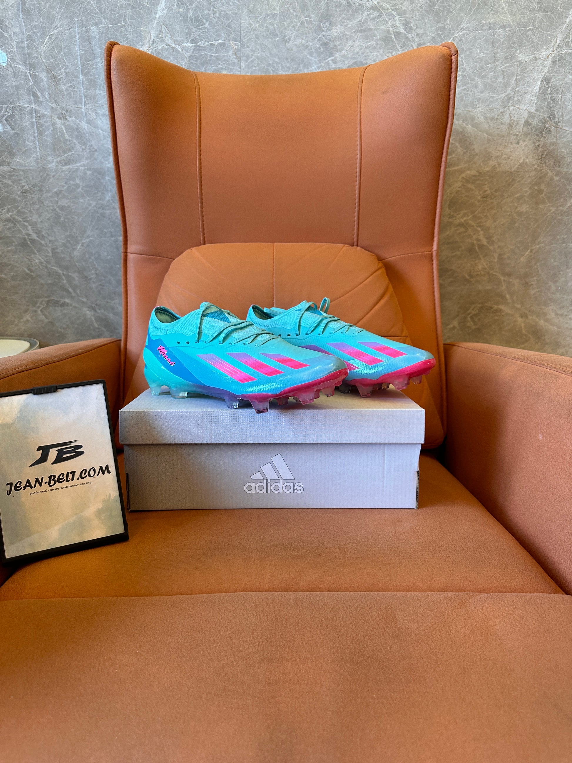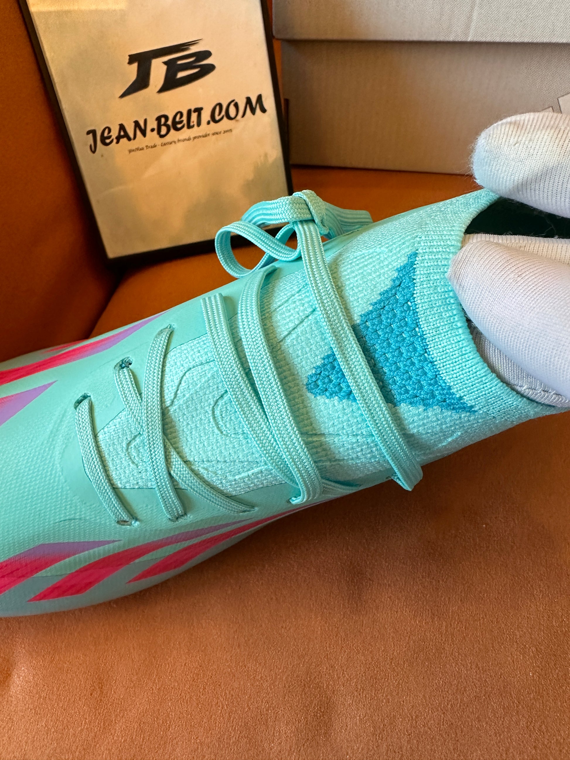 Dominate the game with the Adidas X Speedportal soccer cleats, designed for maximum speed and precision. These cleats feature a vibrant turquoise upper accented with bold pink Adidas stripes for a striking, modern look. Engineered with lightweight materials and a responsive outsole, they provide exceptional traction and agility on the field. Perfect for competitive players seeking top-tier performance and style. Elevate your game with the Adidas X Speedportal cleats!