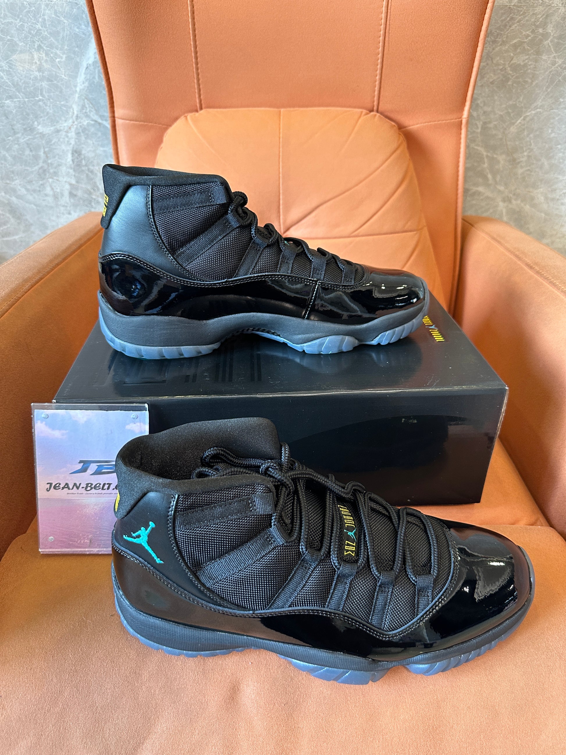 Step into premium style with the Air Jordan 11 Retro "Cap and Gown", a sleek all-black iteration of the iconic Jordan silhouette. Featuring glossy patent leather overlays paired with durable mesh uppers, this pair delivers a luxurious look while maintaining maximum comfort. The icy blue translucent outsole and embroidered Jumpman branding add a refined finish, making these sneakers perfect for both on-court performance and streetwear fashion.