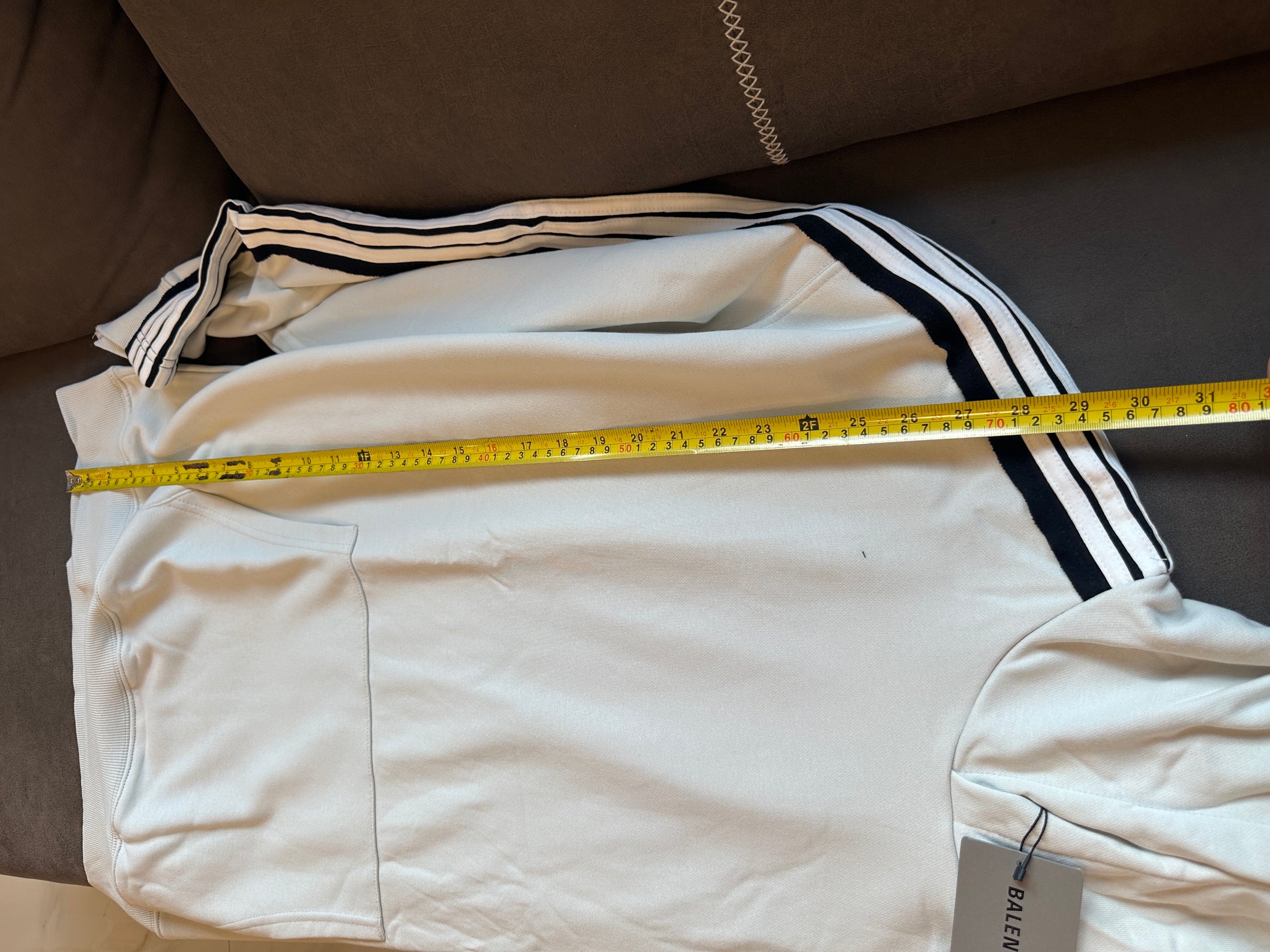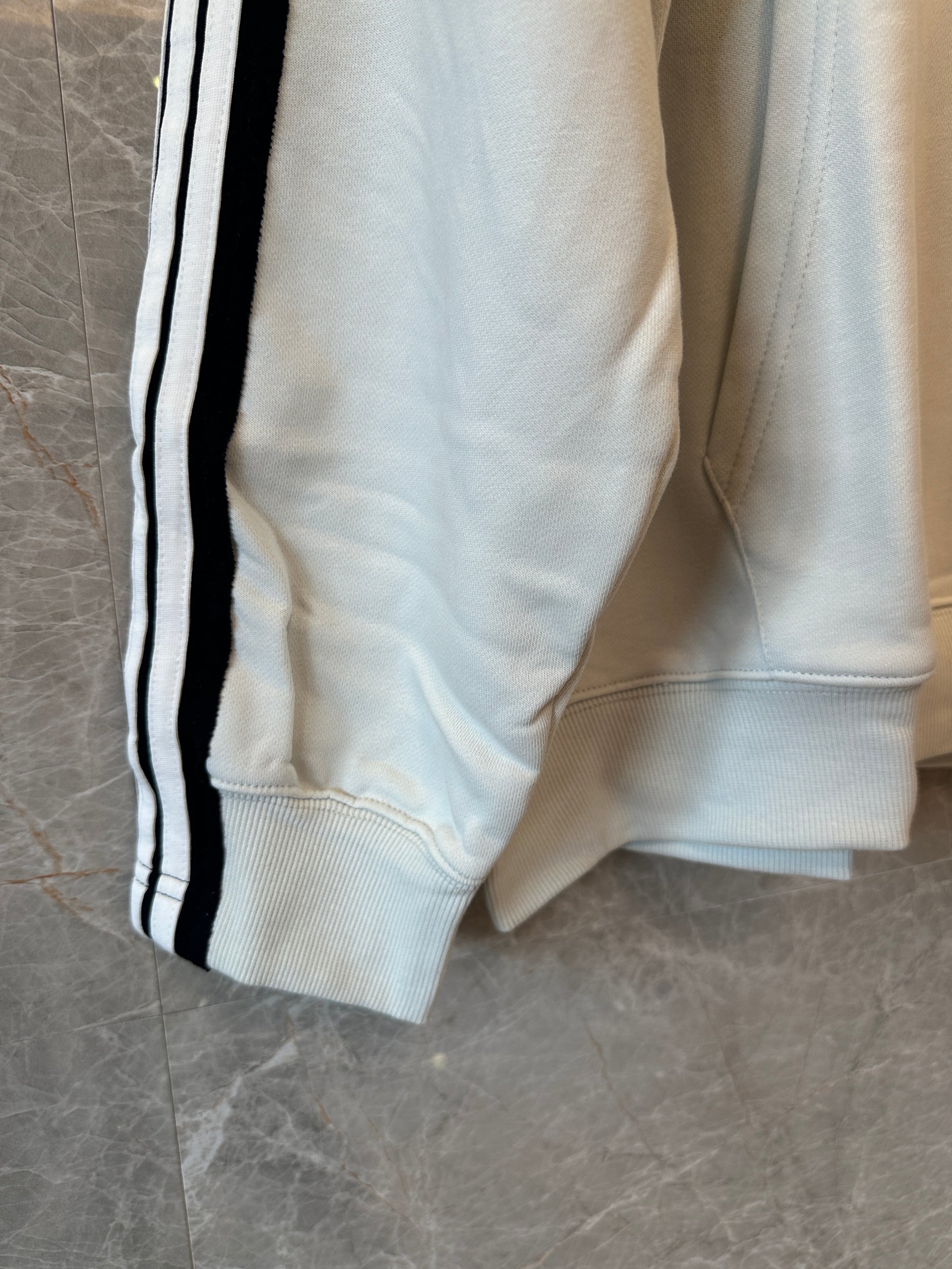 This Balenciaga hoodie combines modern streetwear vibes with premium comfort. Rendered in a light grey hue, it features black and white racing stripes down the sleeves and a bold “8 BALENCIAGA” logo on the chest. The oversized fit and kangaroo pocket complete its laid-back yet statement-making aesthetic.