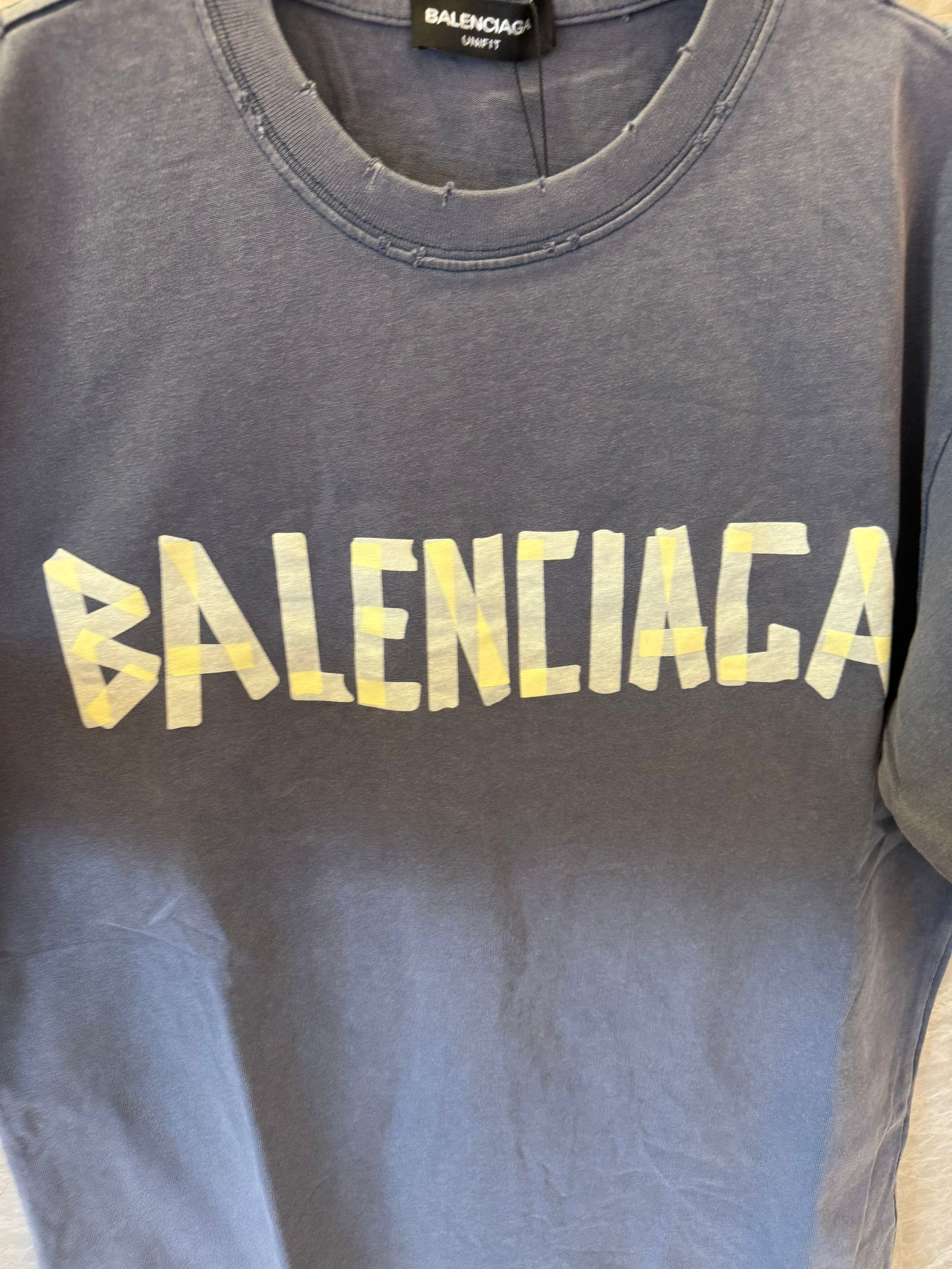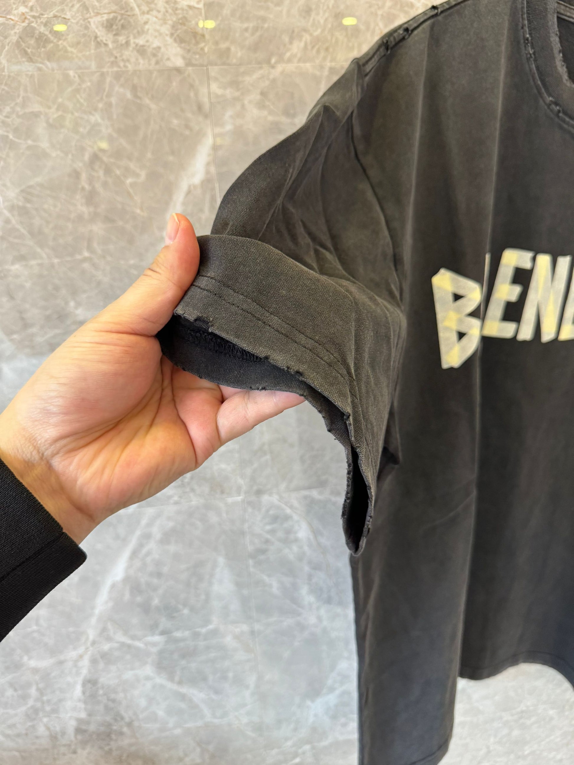 Balenciaga logo oversized T-shirts in a trendy vintage washed effect, offering a relaxed and fashionable style. Available in black and dark grey, these tees showcase a distressed neckline and hem for an edgy look. Perfect for casual and streetwear outfits.