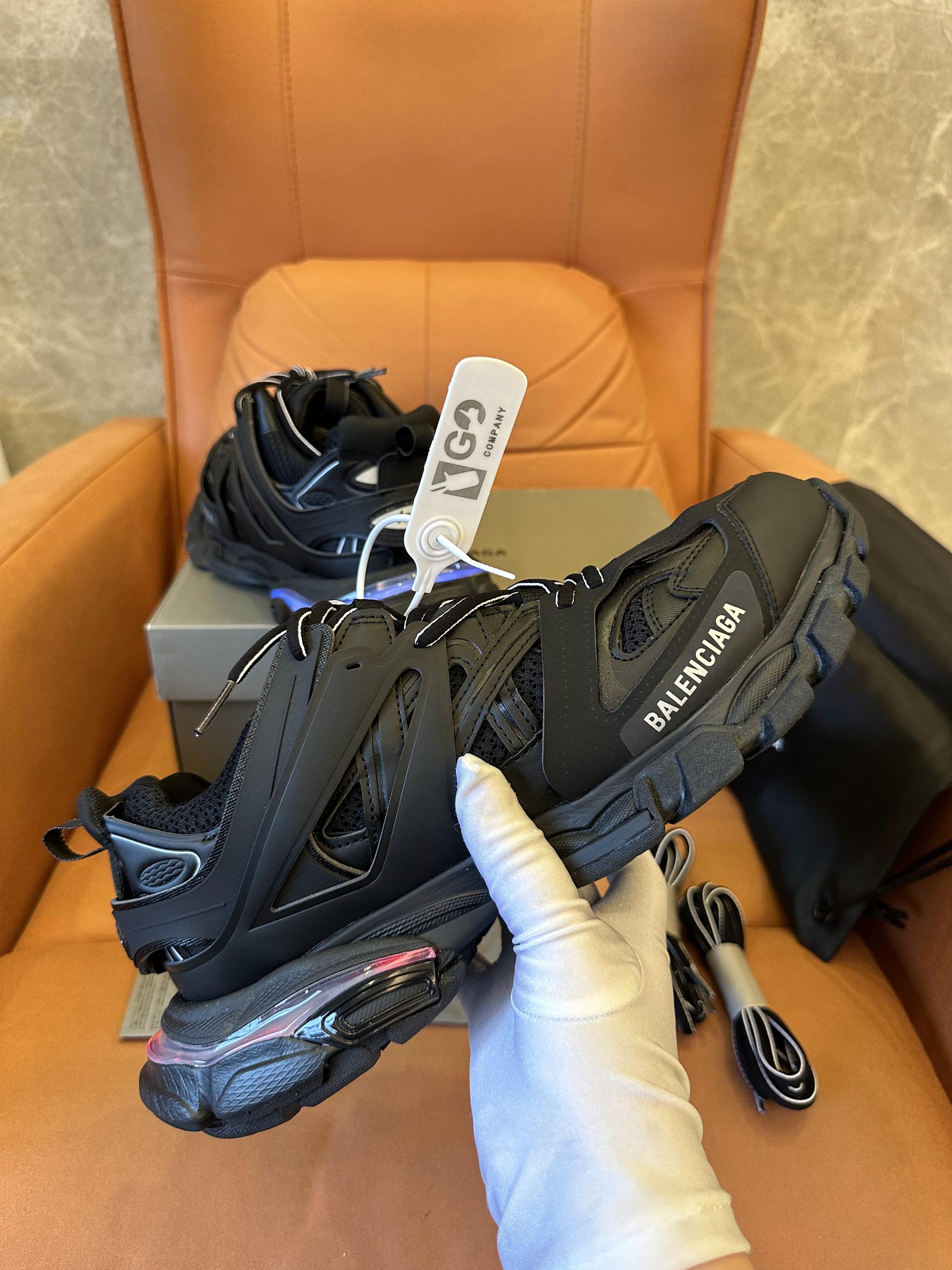 Experience the ultimate combination of style and comfort with the Balenciaga Track black sneakers. These expertly crafted sneakers feature a sleek, black design that will elevate any outfit. With precision engineering and top-notch materials, these sneakers provide unparalleled cushioning and support for all-day wear.