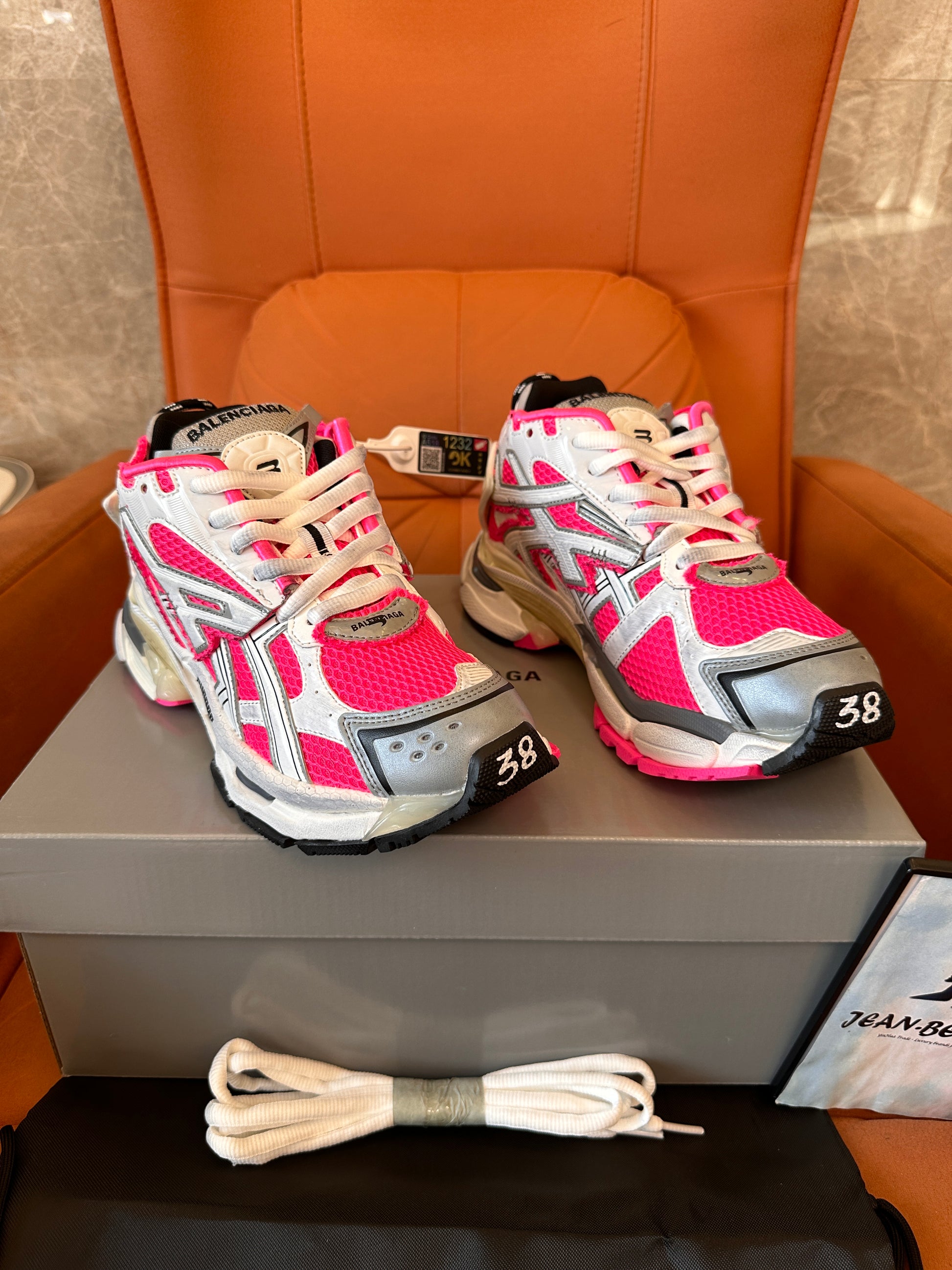 Add a pop of color to your sneaker collection with the Balenciaga Triple S sneakers in a bold pink, white, and silver design. Featuring a dynamic mesh and leather combination, these sneakers stand out with their chunky silhouette and eye-catching colors. The durable sole provides comfort and support, while the premium materials ensure long-lasting quality. Perfect for those who want to make a statement with high-fashion, functional footwear.