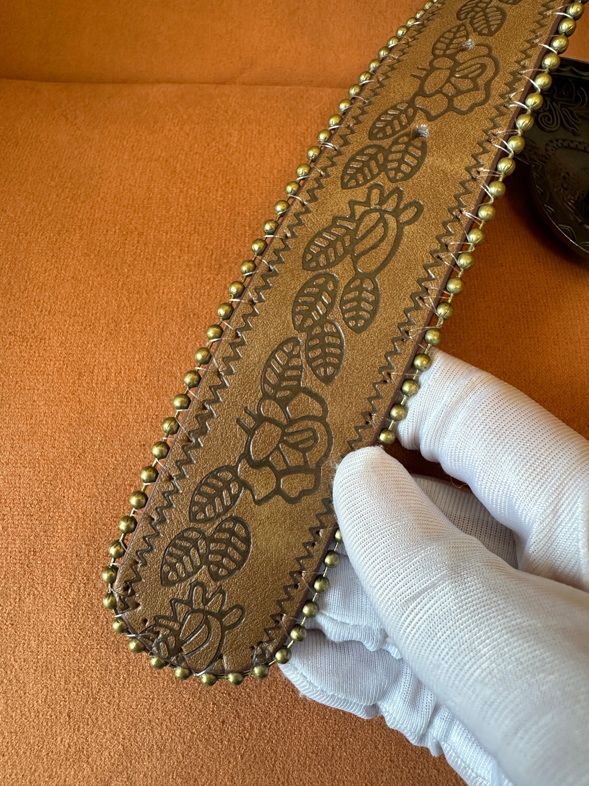 Crafted from high-quality brown leather, this vintage-inspired belt features intricate floral engravings and a bold heart-shaped metal buckle. The studded edges give it a distinctive look, adding a touch of luxury to any casual or semi-formal ensemble. The adjustable design ensures a perfect fit for any waistline.
