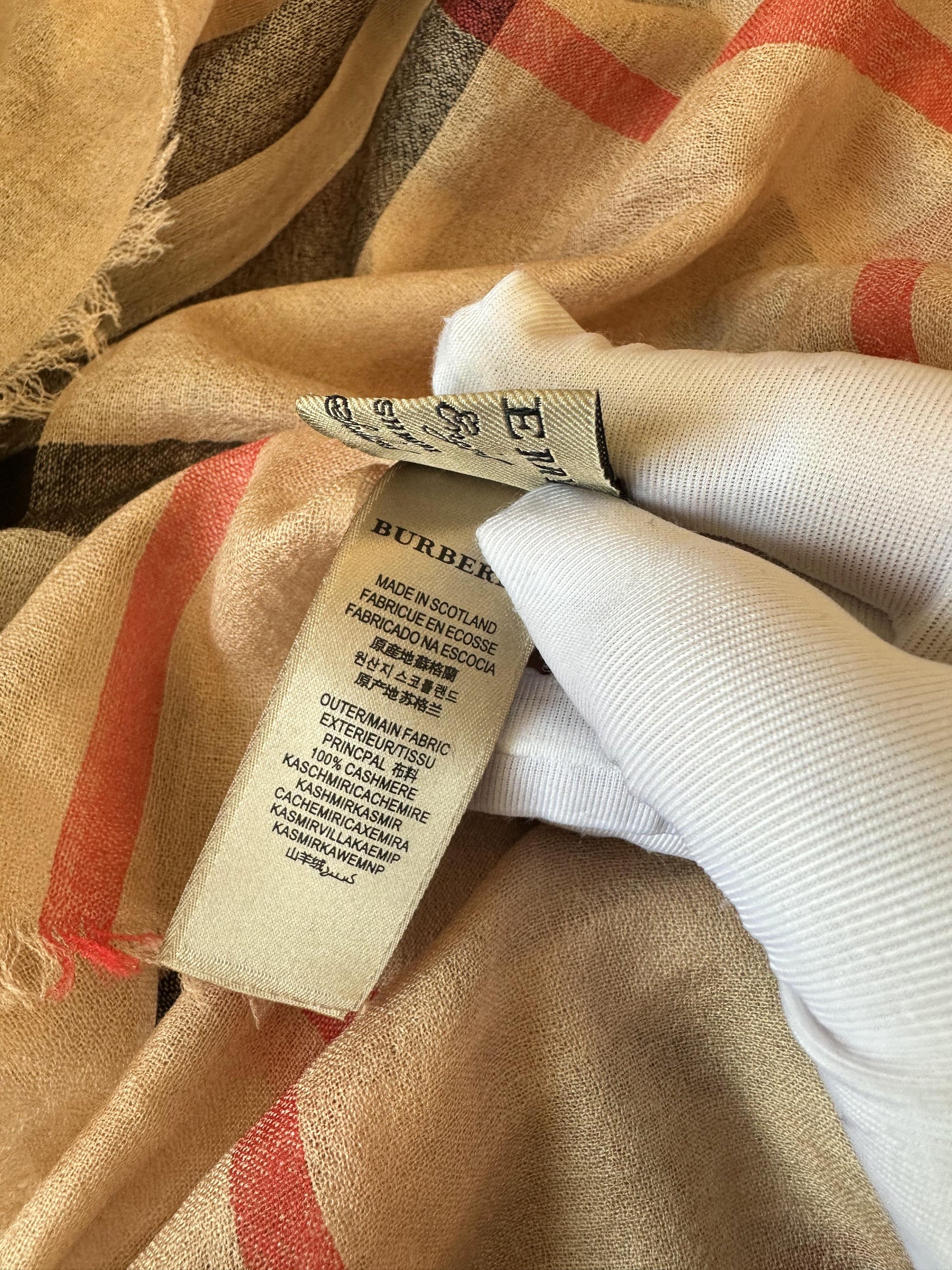 Wrap yourself in timeless elegance with this Burberry scarf, featuring the iconic check pattern in beige with accents of black and red. Crafted from lightweight, soft fabric, it’s perfect for adding a touch of sophistication to any outfit. Ideal for both casual and formal occasions.