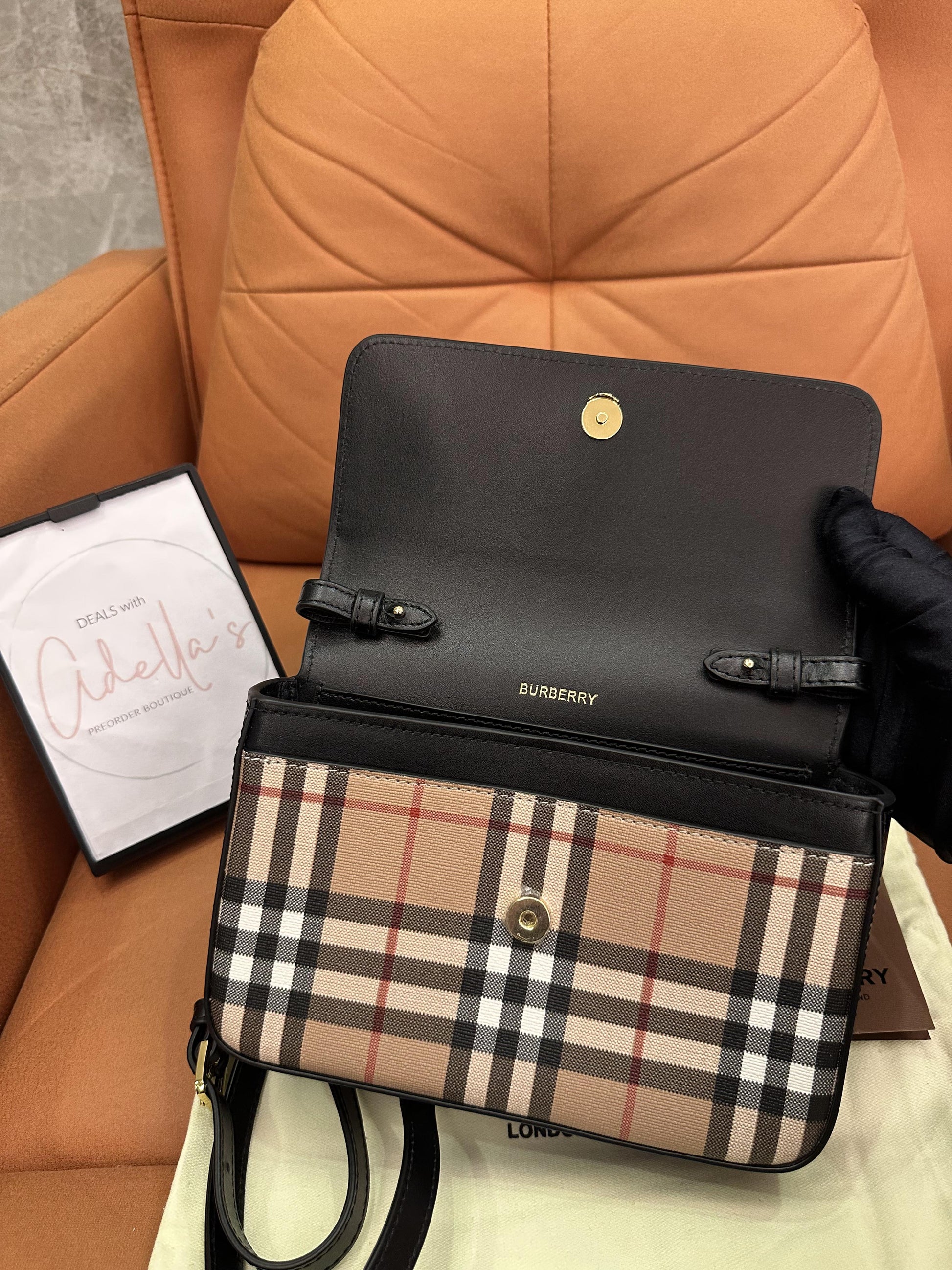 This exclusive Burberry enny handbag showcases a vintage checkered leather exterior, accented with gold hardware. The unique combination of imported calf leather and patterned fabric creates a soft and refined appearance. With precise craftsmanship and a size of 20cm*13.5cm*5cm, this versatile handbag delivers top-of-the-line quality.