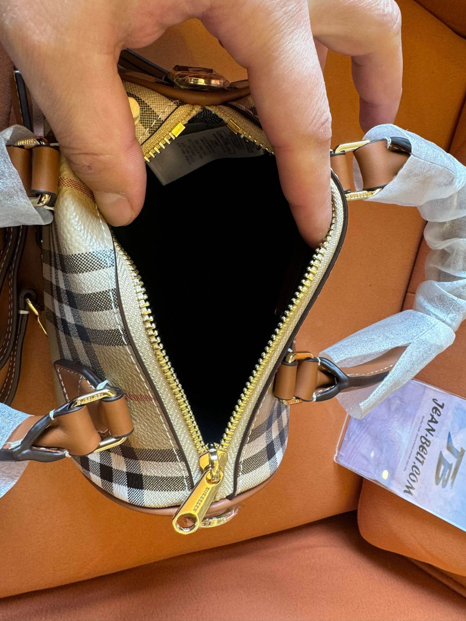 Compact and stylish, the Burberry mini check bowling bag is perfect for carrying your essentials on-the-go. Made with Burberry's iconic mini check design, this bag adds a touch of elegance to any outfit. Stay organized with its spacious interior and multiple pockets.