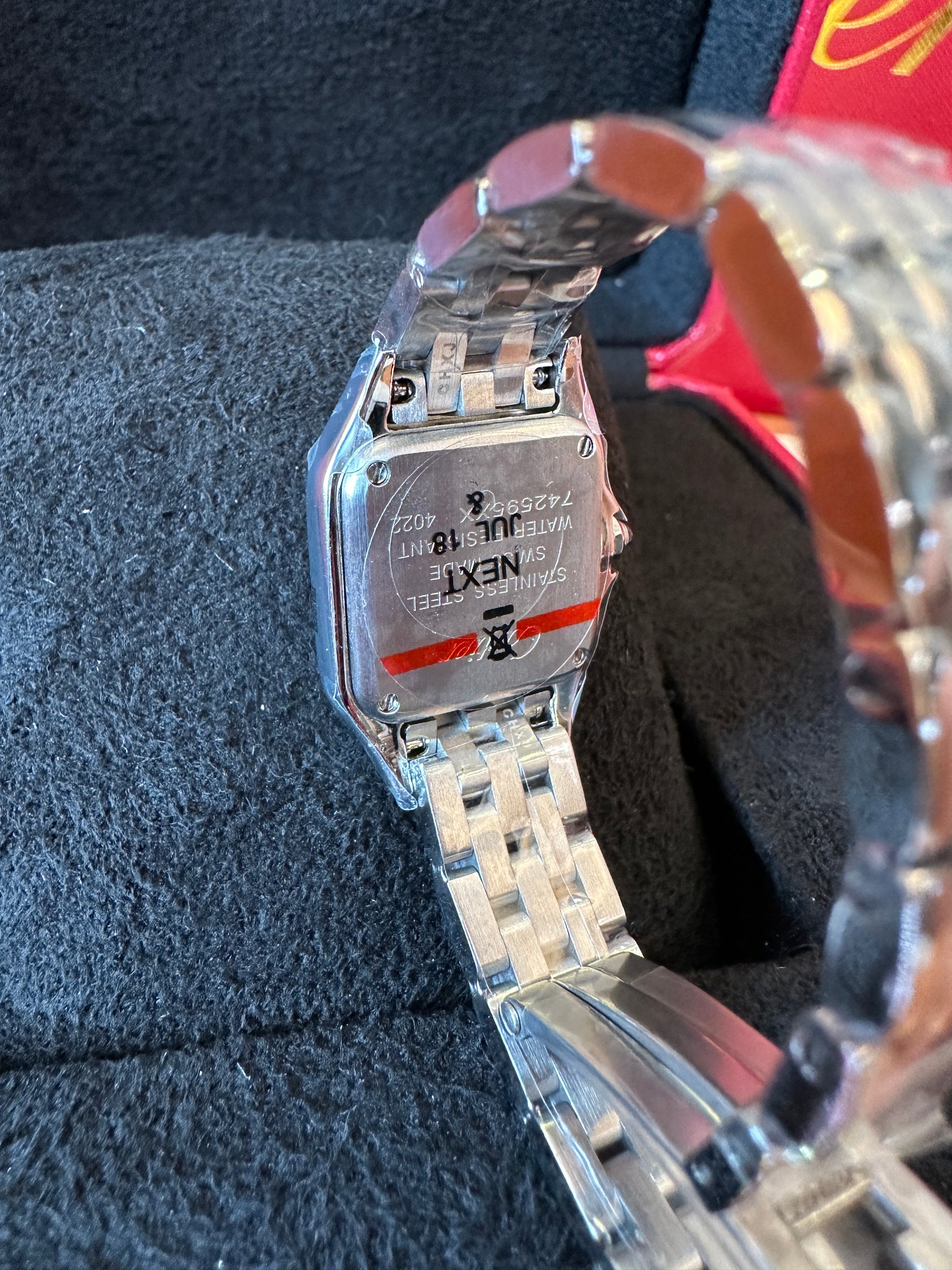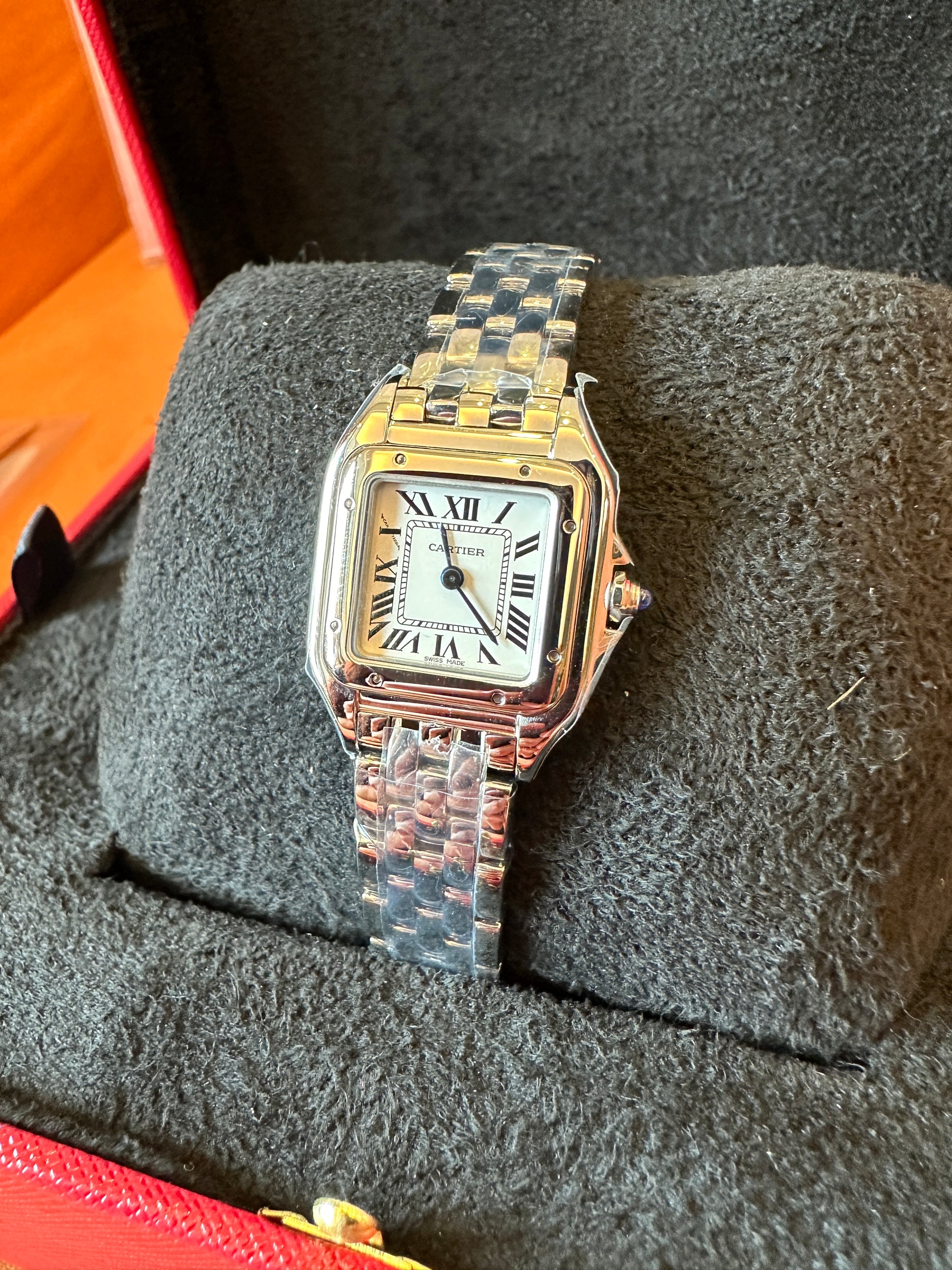 This elegant Cartier Tank Française watch showcases a timeless design with a rectangular stainless steel case and a clean, white dial adorned with classic Roman numerals. The watch is paired with a polished stainless steel bracelet that offers both durability and luxury. The signature blue sapphire crown adds a touch of refinement, and the watch is housed in its original Cartier box for a complete luxury experience. Known for its iconic shape and unparalleled craftsmanship, this Cartier watch is the perfect accessory for any formal or casual occasion.