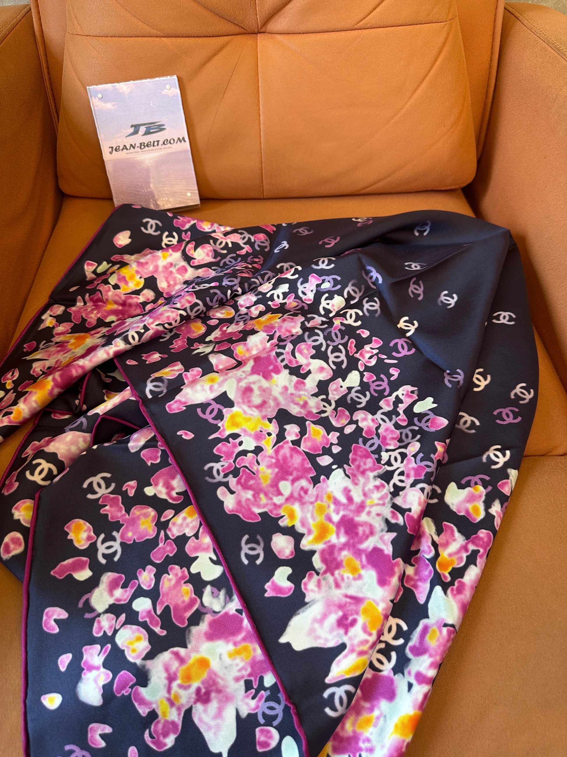 This luxurious Chanel floral print silk scarf features an elegant blend of navy, pink, yellow, and white hues, adorned with the iconic interlocking "CC" logo throughout. Perfect for adding a touch of sophistication to any outfit, it’s crafted from high-quality silk, ensuring a soft and smooth feel. The vibrant floral design, combined with the classic Chanel branding, makes it a timeless piece for any fashion-forward individual. Ideal for both casual and formal wear, this scarf offers versatility and elegance in one stylish accessory.