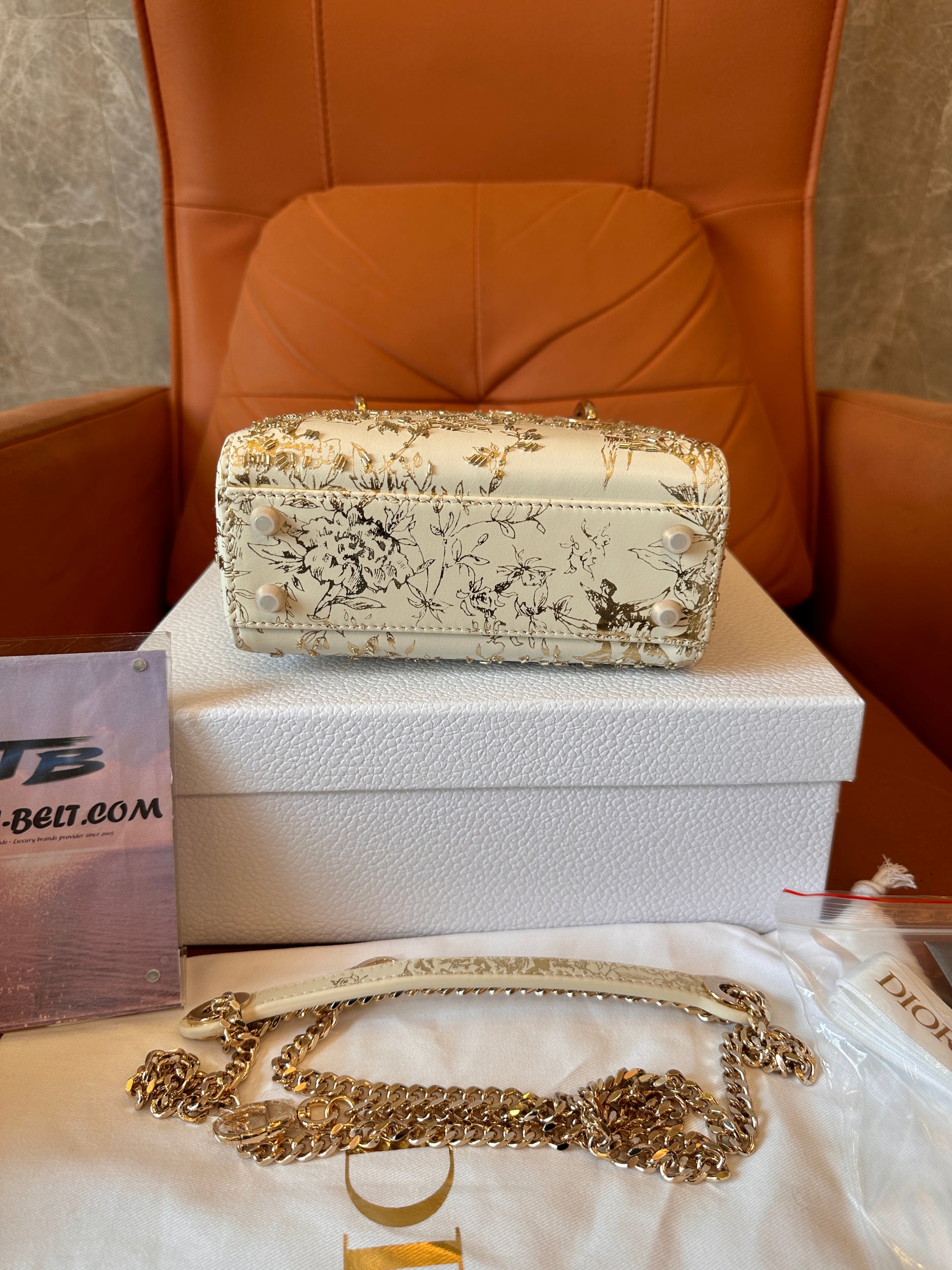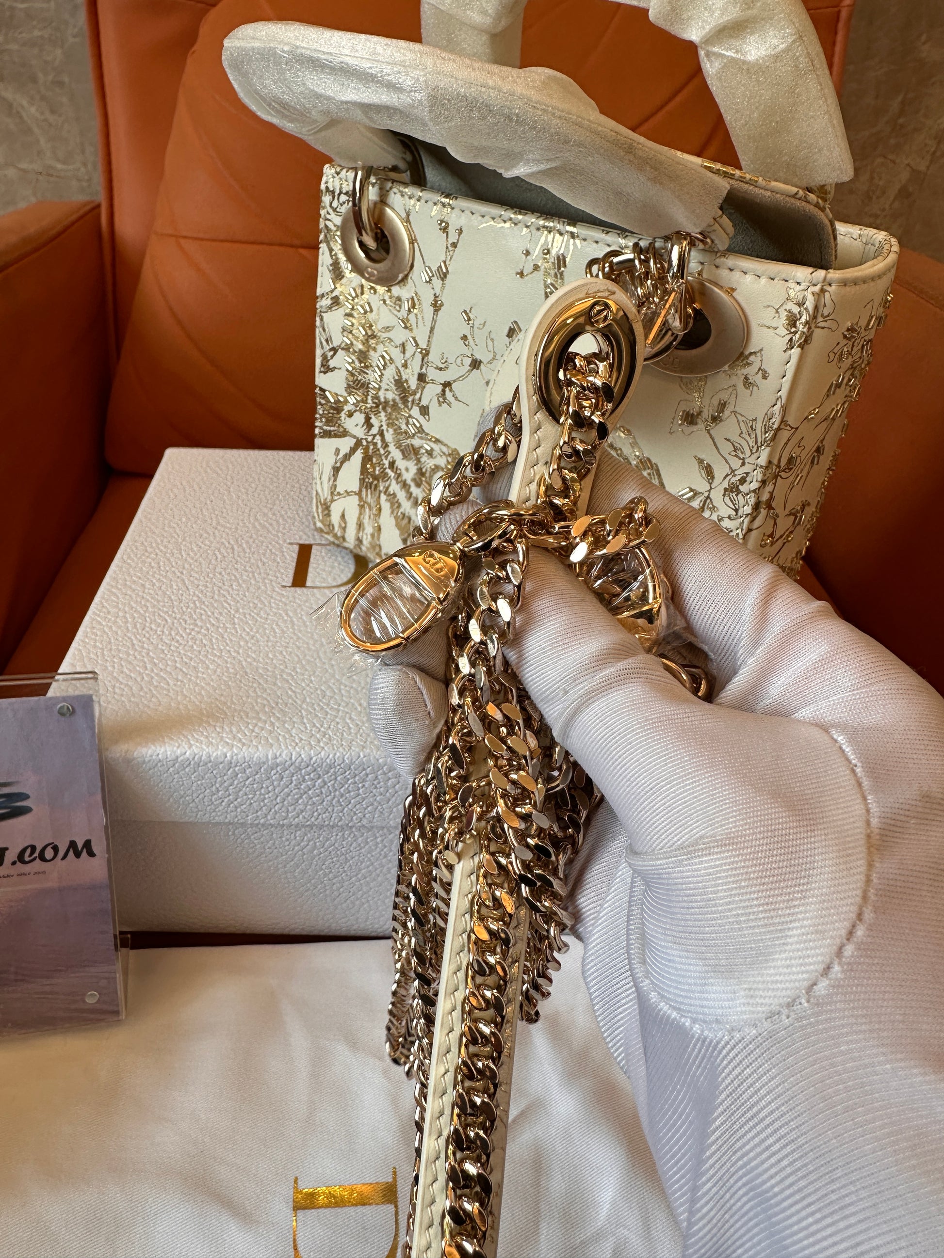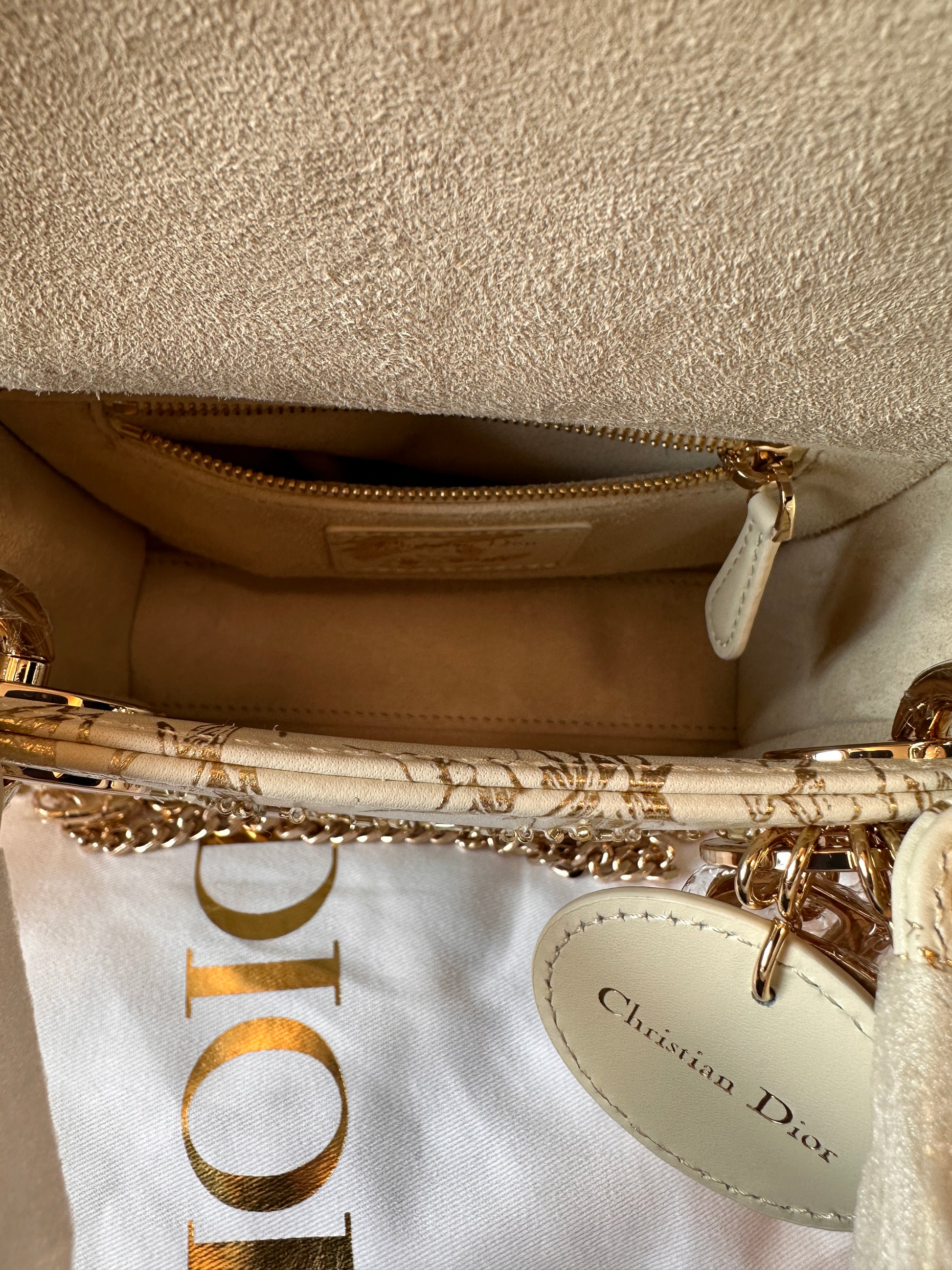 Experience timeless elegance with this exquisite Christian Dior Lady Dior Mini Bag, crafted in a luxurious ivory canvas and adorned with intricate gold embroidery. This limited edition design features detailed floral and bird motifs, complemented by gold-tone hardware and the iconic Dior charm tag. The top handle is wrapped for pristine presentation, and it includes a detachable gold chain strap for versatile carrying. A must-have for any Dior collector or luxury fashion lover, this piece comes complete with its original box, dust bag, and authenticity card.