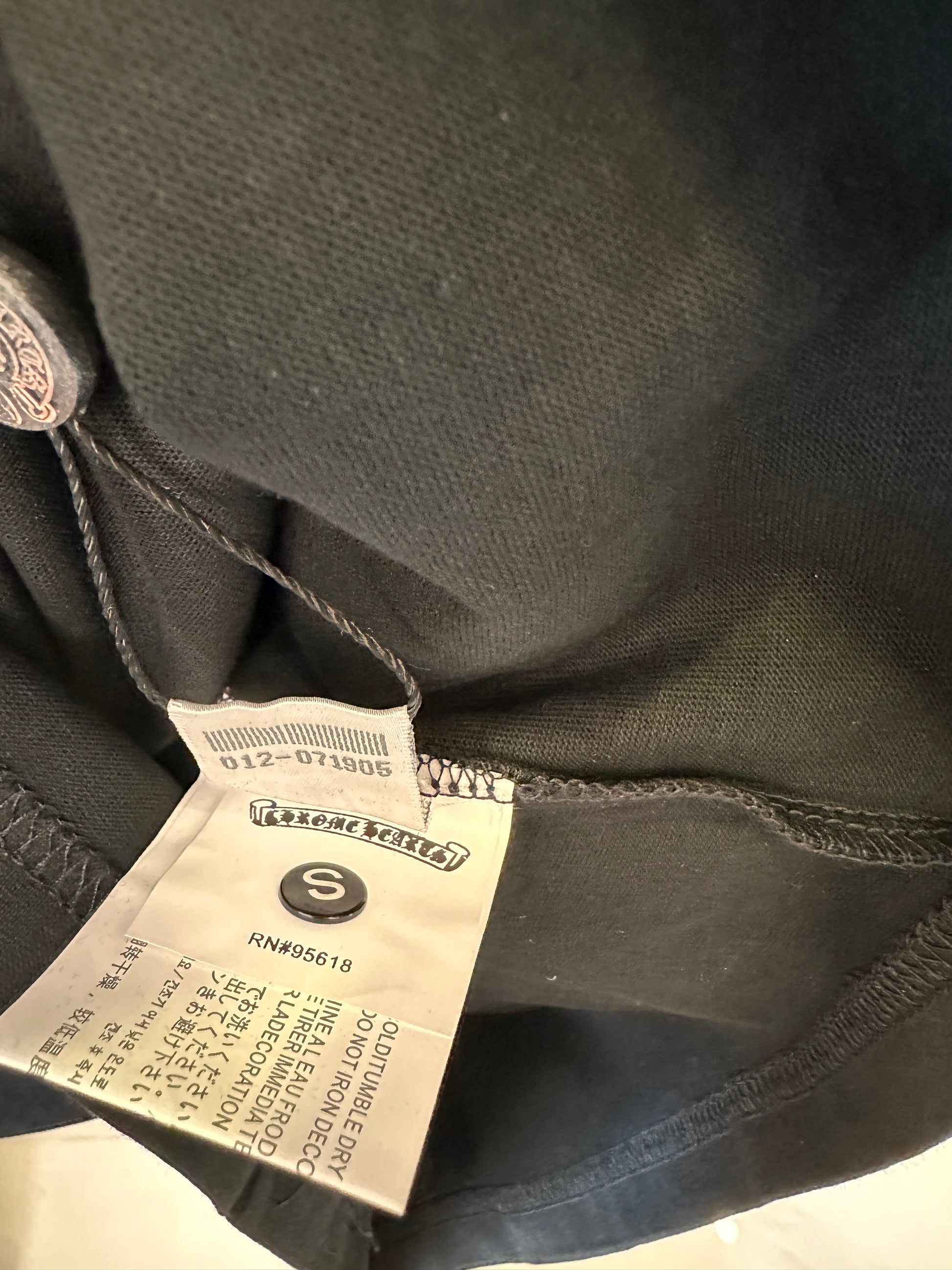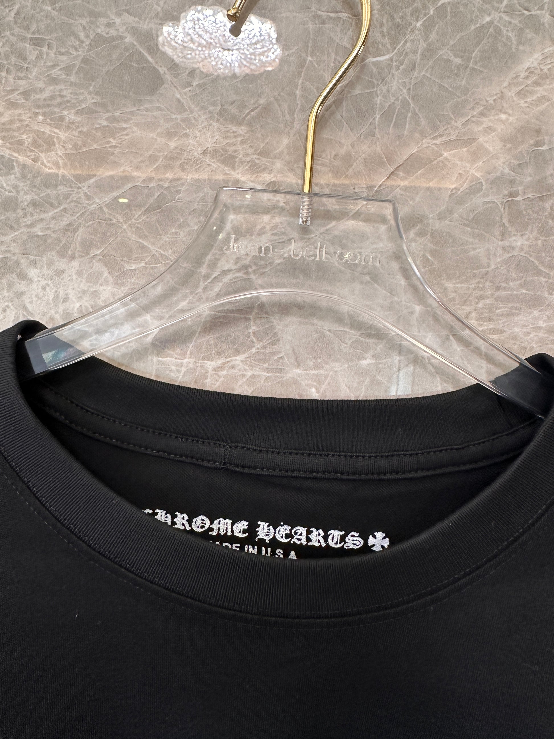This Chrome Hearts black long-sleeve shirt features the brand's iconic aesthetic with a bold circular logo on the chest and detailed white floral graphics along the sleeves. The design combines minimalist style with artistic elements, making it a standout piece for those who appreciate streetwear and luxury fashion.