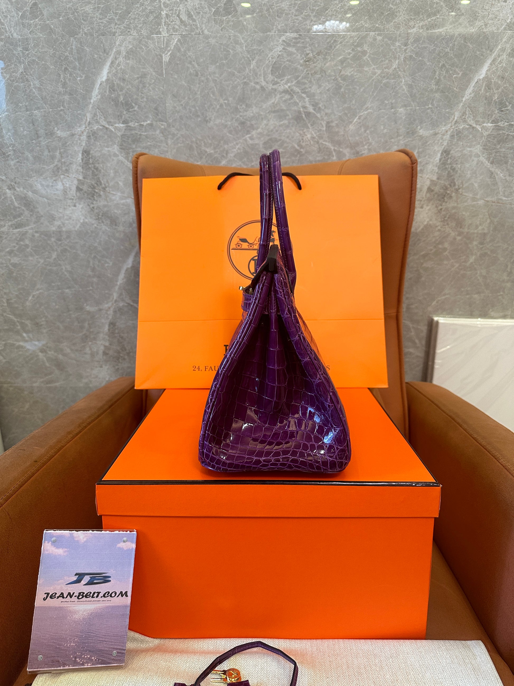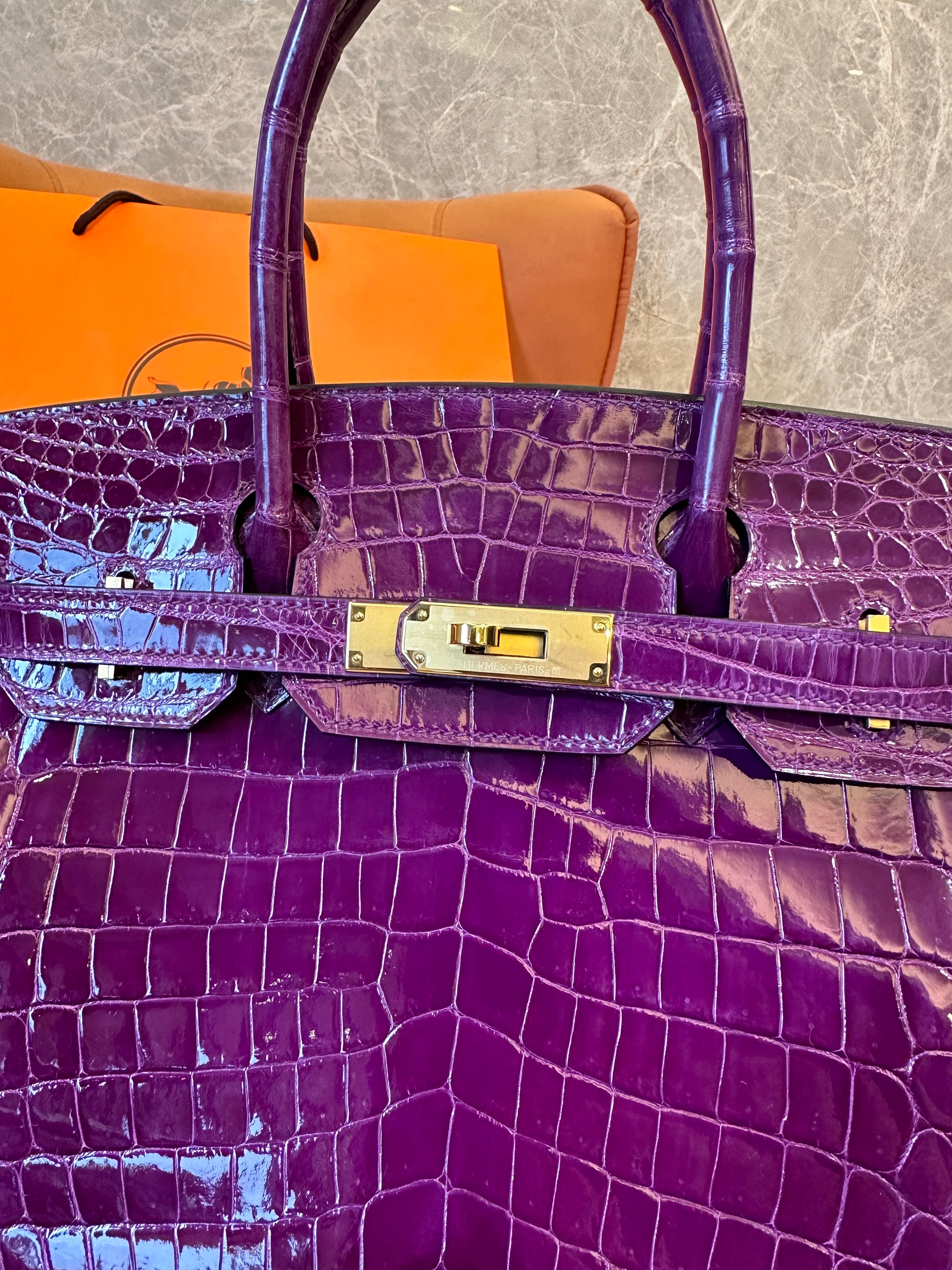 The bag features a rich purple tone, offering a bold yet sophisticated statement suitable for both formal occasions and elevated daily styling. It is completed with a signature gold-tone turn-lock closure, sturdy top handles, and premium hardware, embodying the timeless elegance of the Birkin line.