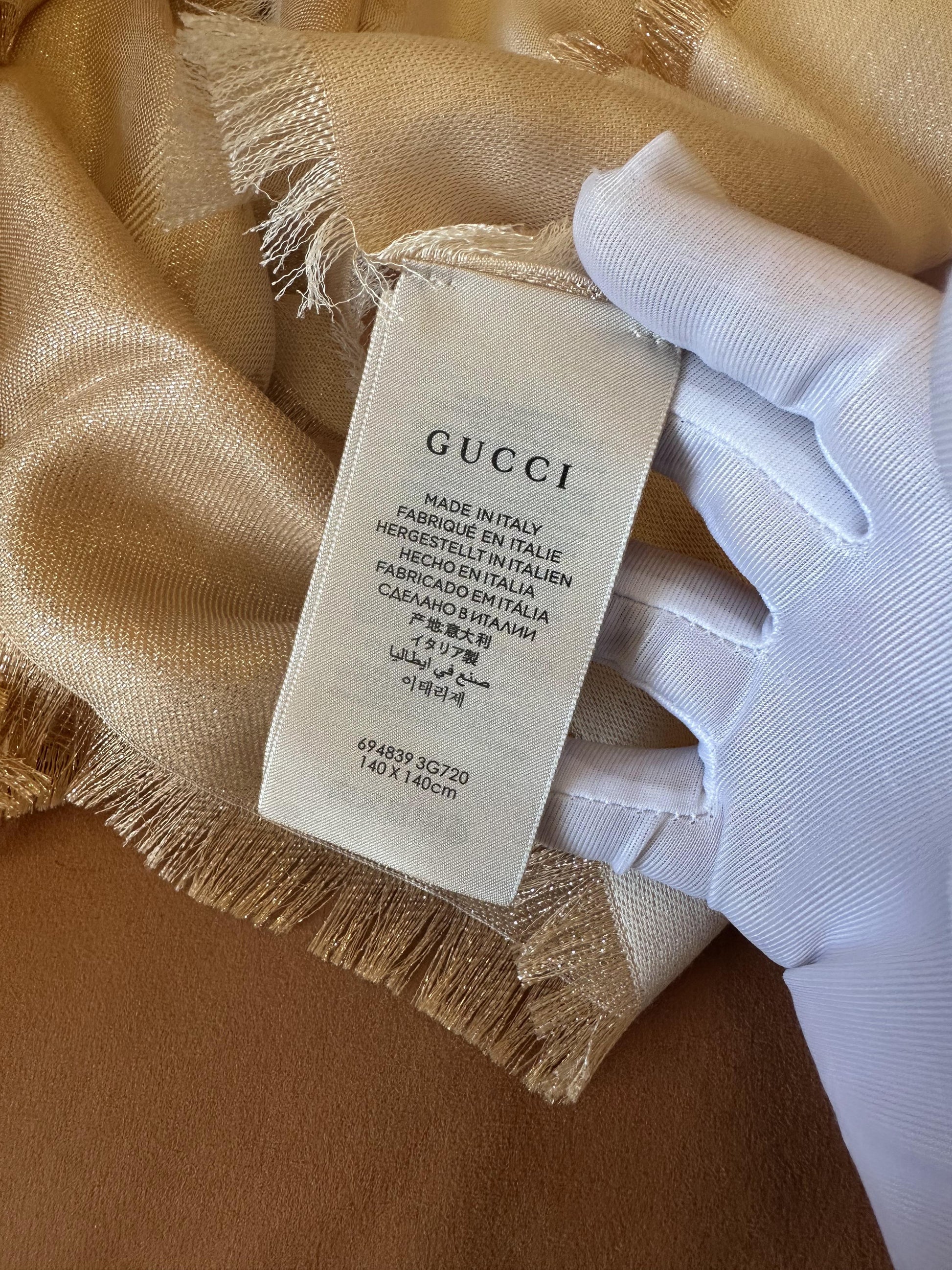 This Gucci scarf in a delicate beige hue features the iconic GG jacquard pattern, exuding timeless sophistication and luxury. Crafted from a premium silk blend, it offers a soft, lightweight feel with a subtle shimmer that enhances its elegance. The fringed edges add a refined touch, making it a versatile accessory for any occasion. Perfect for both casual and formal outfits, this scarf embodies Gucci's signature style and impeccable craftsmanship.