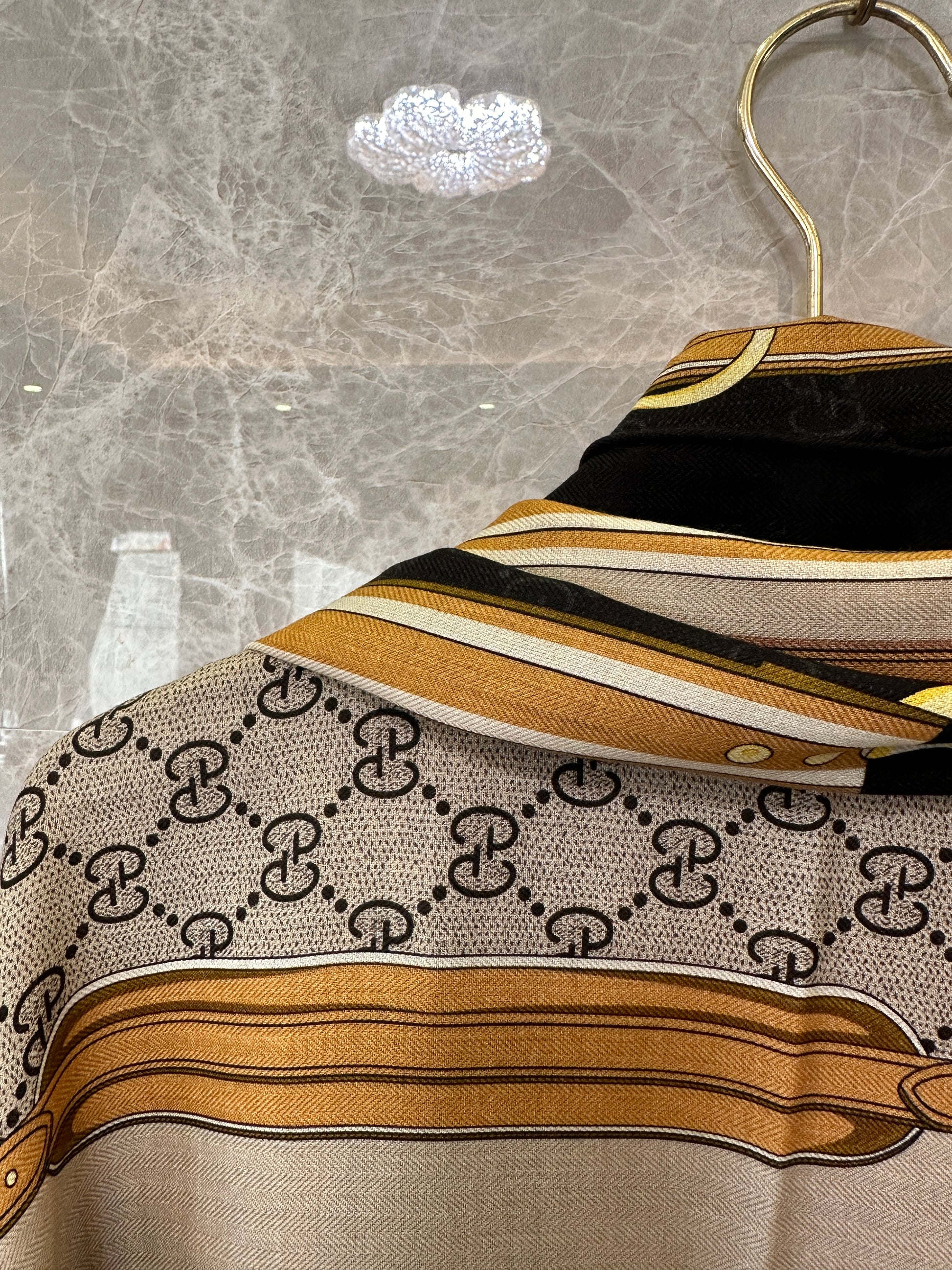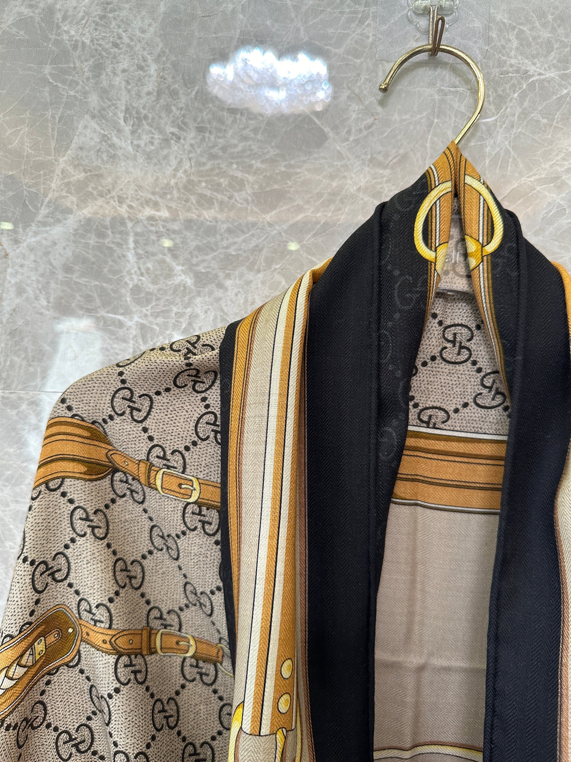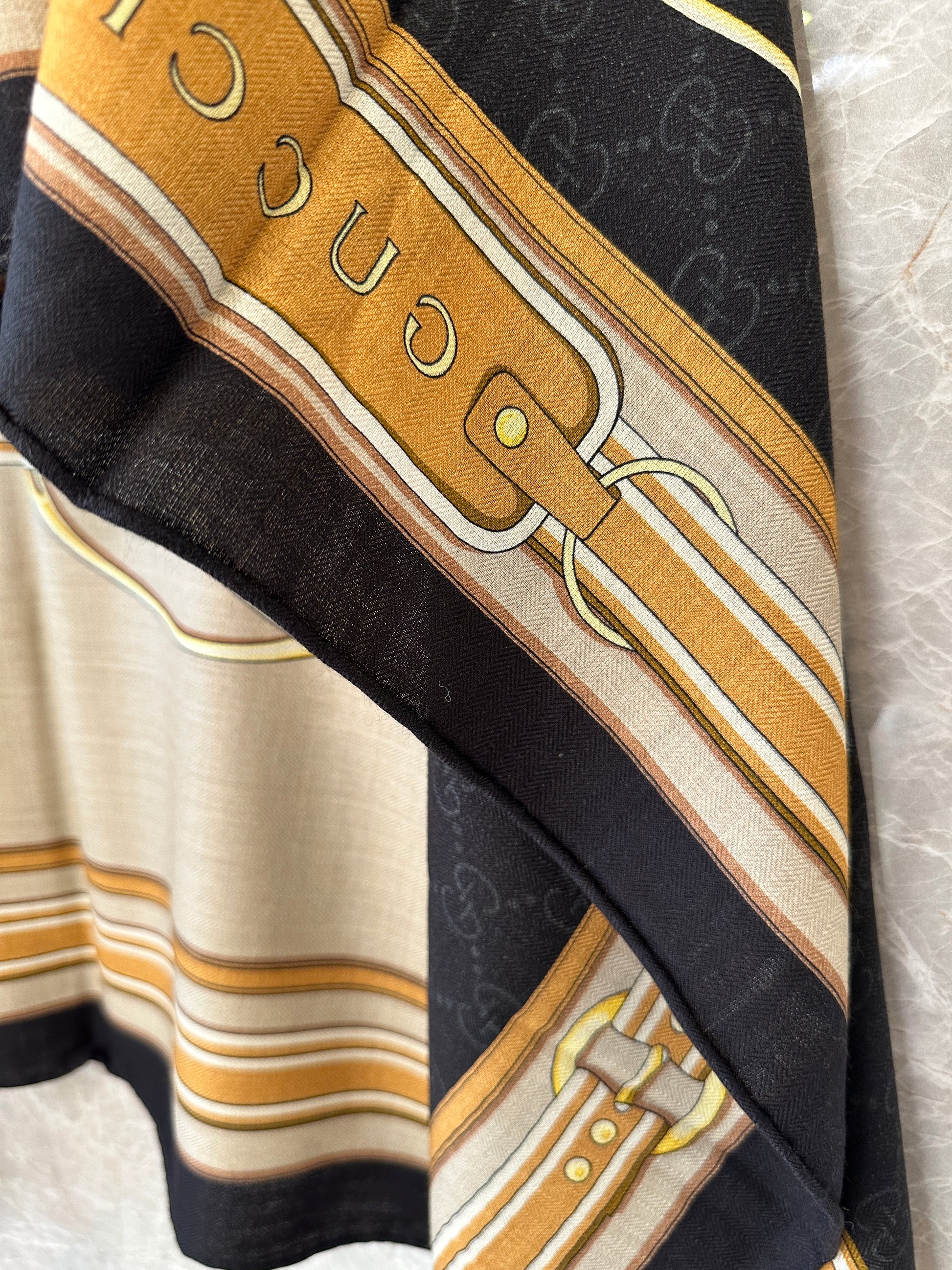 This Gucci silk scarf showcases the signature GG monogram paired with an elegant belt-inspired print in gold, beige, and black. Crafted from smooth, lightweight silk, it offers a soft drape and vibrant color expression. The generous size allows for multiple styling options — wear it around the neck, over the shoulders, as a headscarf, or tied onto a handbag. A refined accessory that adds a statement Gucci touch to any outfit.