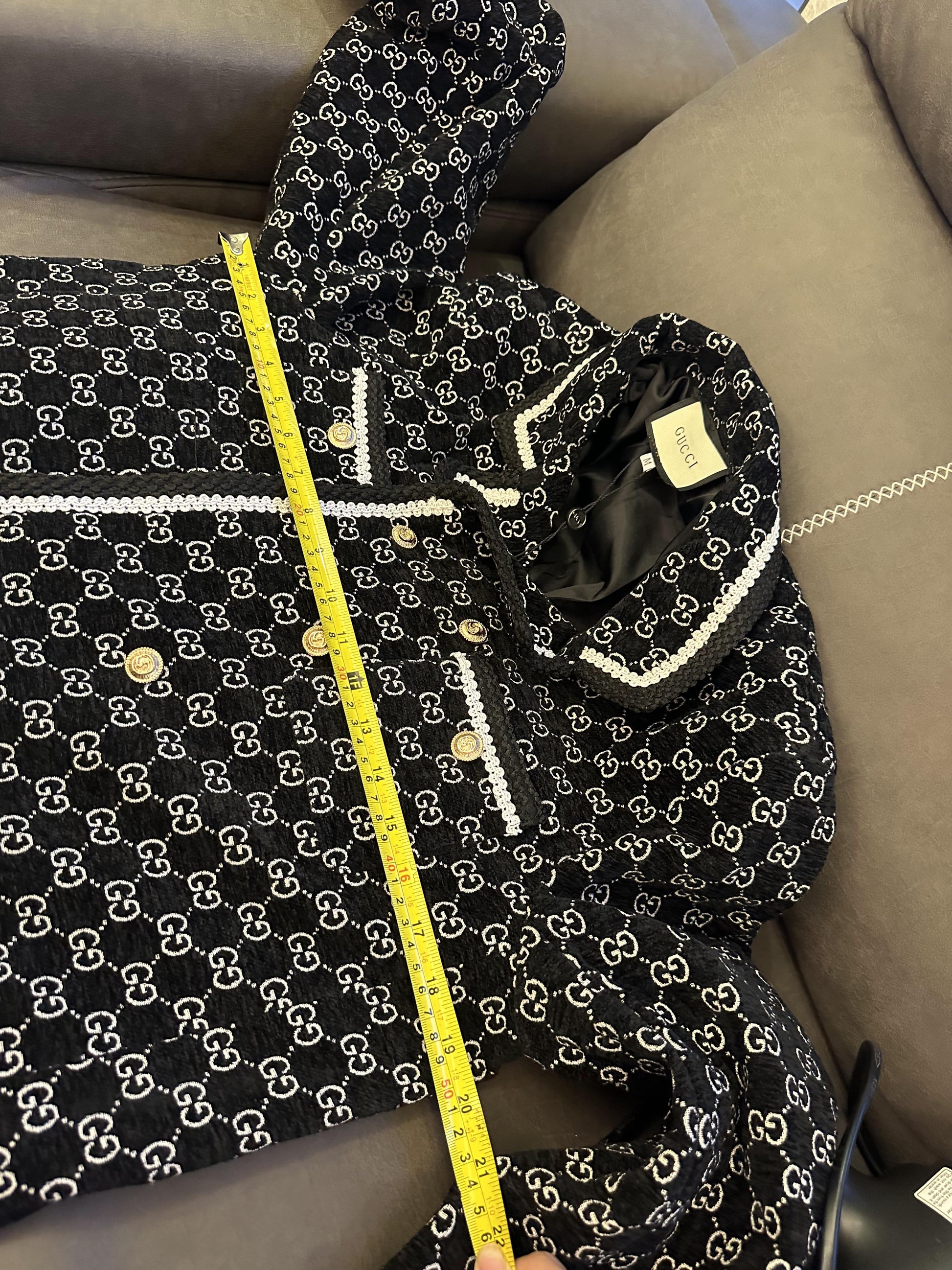 Elevate your outerwear collection with this stunning Gucci Double G Monogram Coat, crafted from premium materials and designed with meticulous attention to detail. This coat features an all-over black and white double G monogram pattern that showcases Gucci's iconic branding, enhanced by elegant white trim along the edges for a refined contrast. The front is adorned with gold-tone buttons, adding a touch of luxury and sophistication. With its structured silhouette and tailored fit, this coat is perfect for making a bold style statement while keeping warm in cooler seasons. Ideal for both casual and formal occasions, this Gucci coat effortlessly combines timeless style with modern elegance.