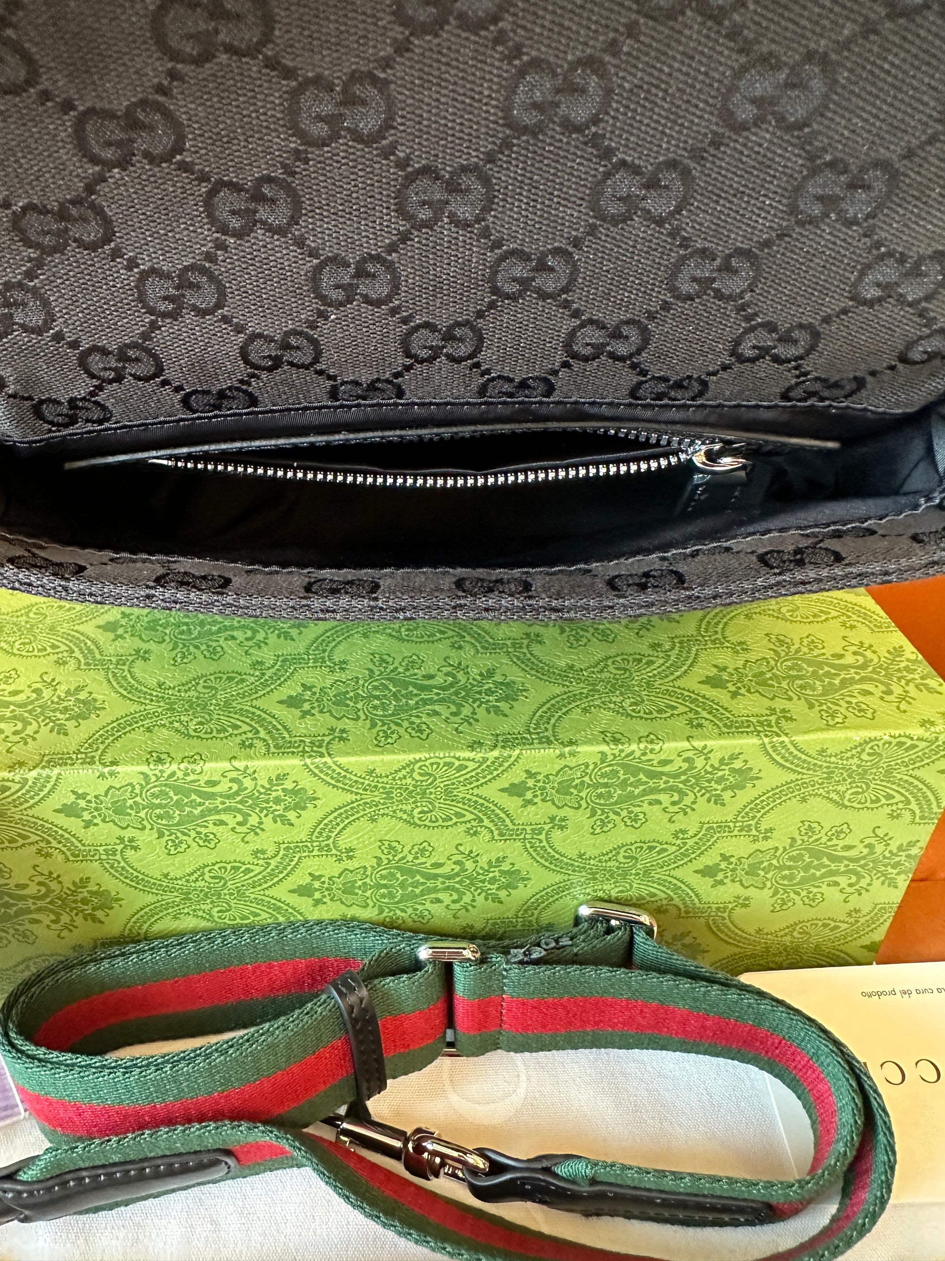 Discover iconic Italian craftsmanship with the GUCCI 702833 GG Black Canvas Messenger Bag. This sleek crossbody bag features the signature GG monogram canvas in an all-black finish, complemented by a leather patch logo on the front and matching black leather trim. Designed with versatility in mind, it includes a detachable and adjustable Web strap in green and red for a classic GUCCI look, as well as a solid black leather strap for more refined styling. Ideal for everyday wear, this messenger bag offers both fashion and function in a timeless silhouette.