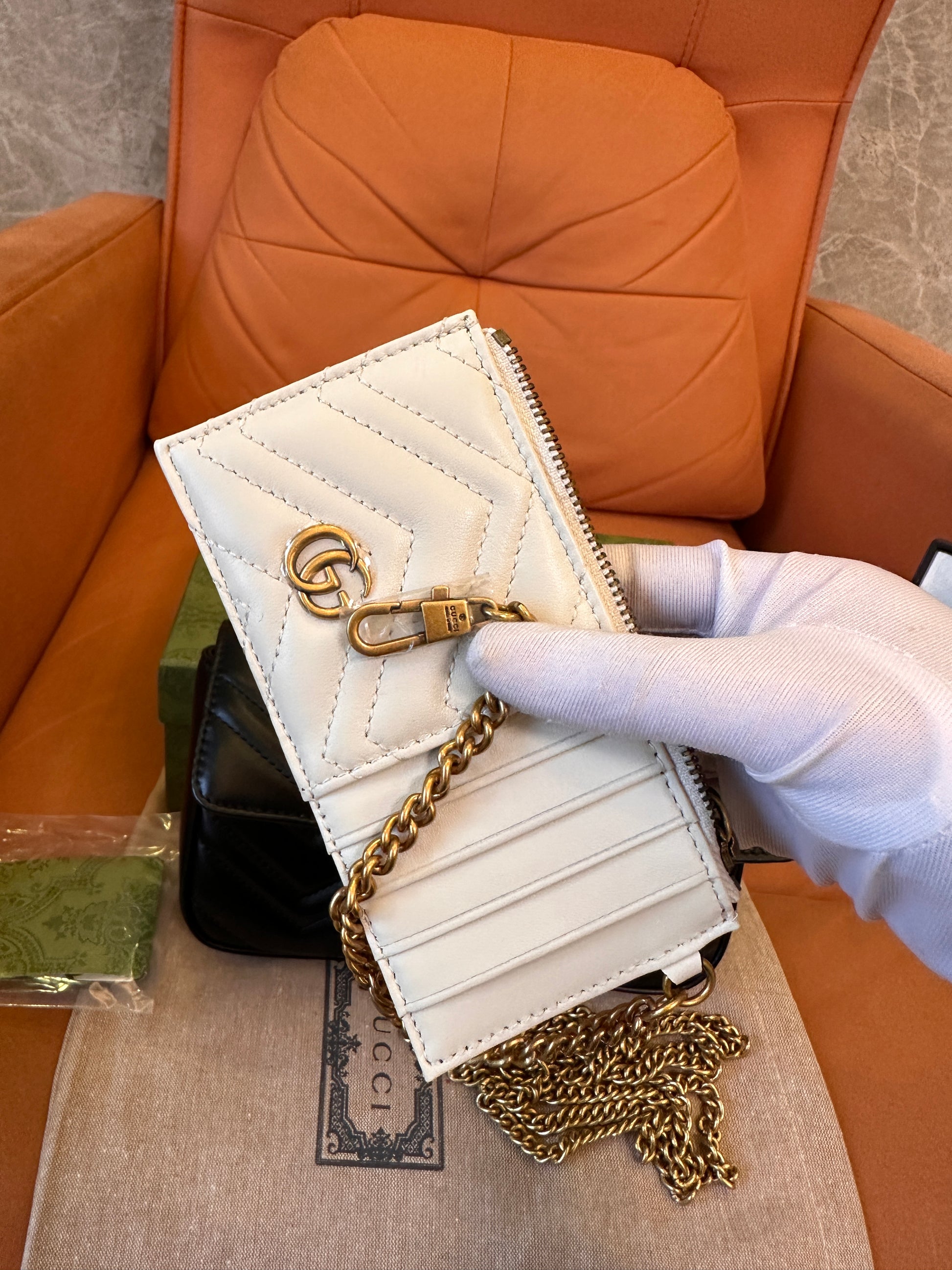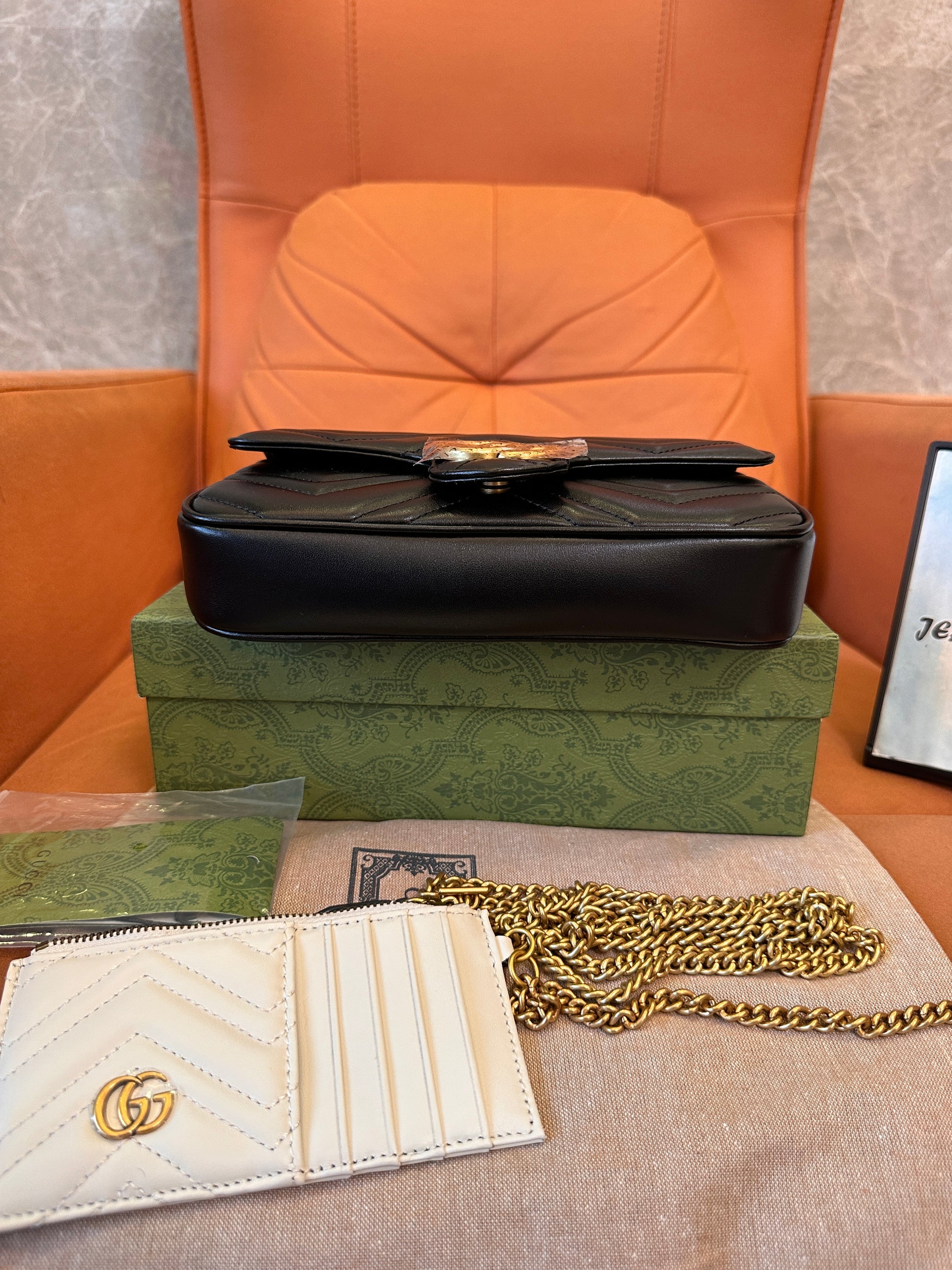 The Gucci GG Marmont Matelassé Mini Shoulder Bag is a timeless expression of luxury and sophistication. Crafted from premium black matelassé leather, it features the iconic chevron quilting and the signature Double G logo in an elegant gold-tone finish. Designed with versatility in mind, this compact bag comes with a sleek chain strap, allowing it to be worn crossbody or over the shoulder. The interior is perfectly sized to carry daily essentials, while the structured silhouette adds a polished touch to any outfit. Whether for a casual day out or a special evening, this piece epitomizes modern glamour with a classic Gucci appeal.