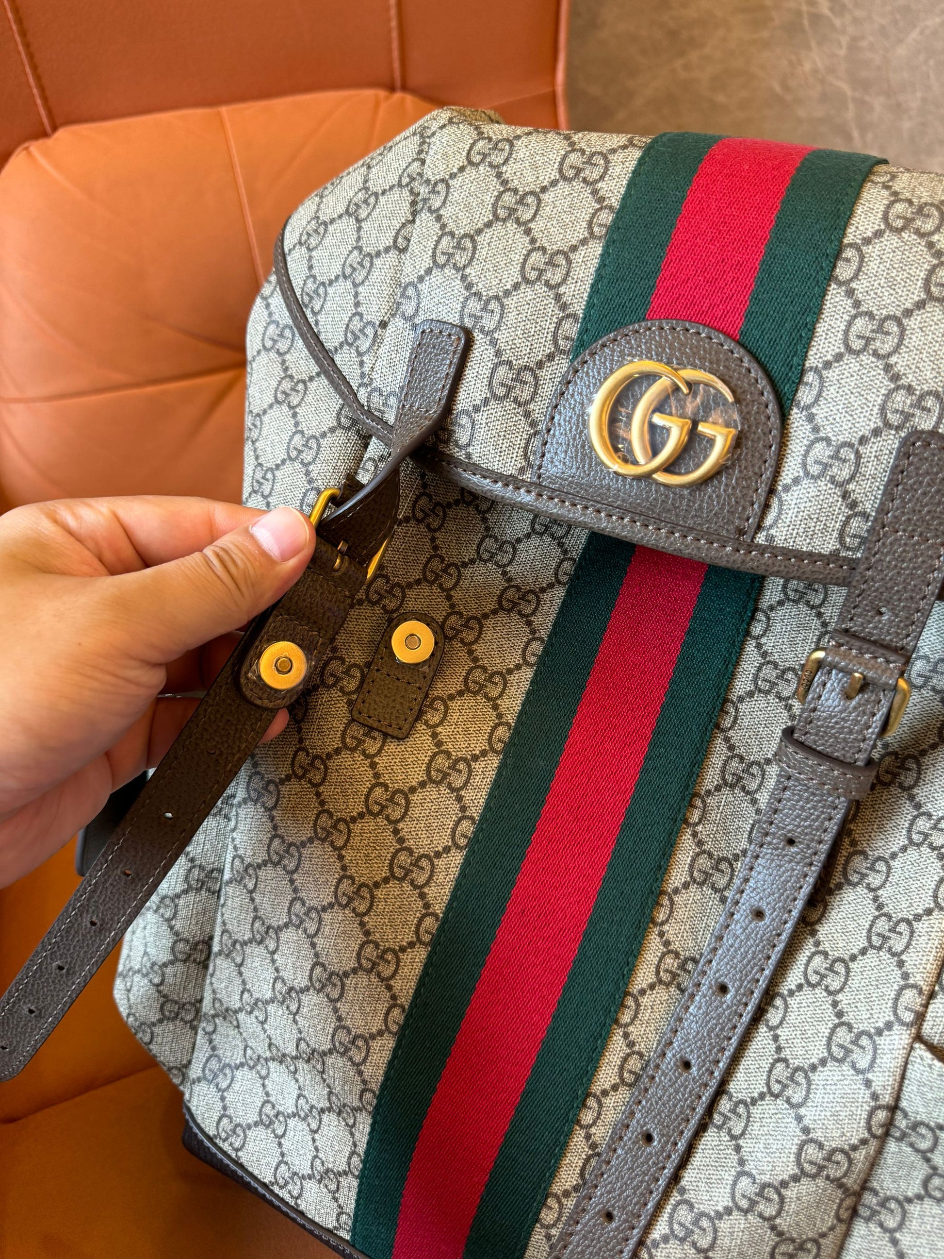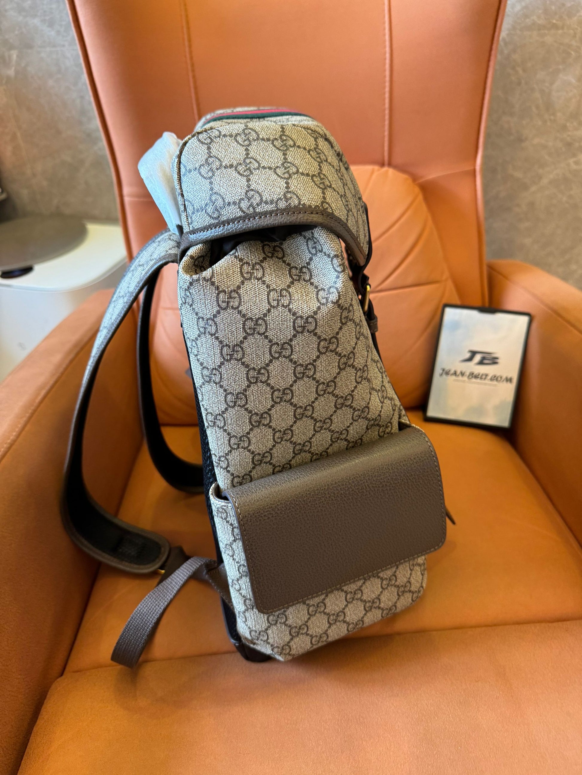Discover the elegance and functionality of the Gucci GG Supreme Canvas Backpack. Crafted from durable GG Supreme canvas in classic beige and ebony, this backpack features Gucci's iconic red and green Web stripe at the center, exuding timeless style. The backpack is equipped with adjustable shoulder straps, a flap top with double buckle closure, and gold-tone GG hardware, adding a luxurious touch. With spacious side pockets and a drawstring interior, this backpack offers ample storage for everyday essentials, making it both stylish and practical for urban explorers or travelers.