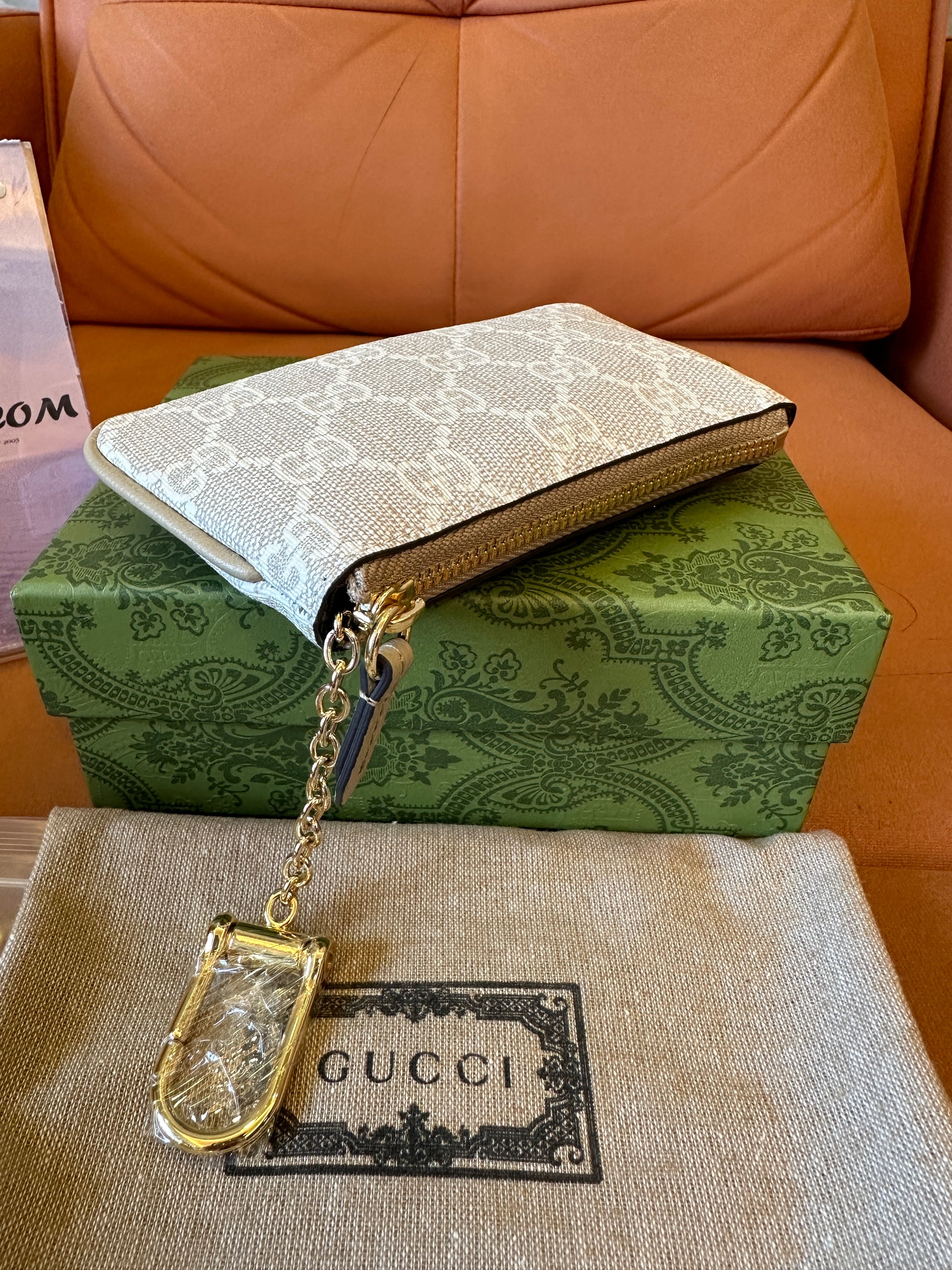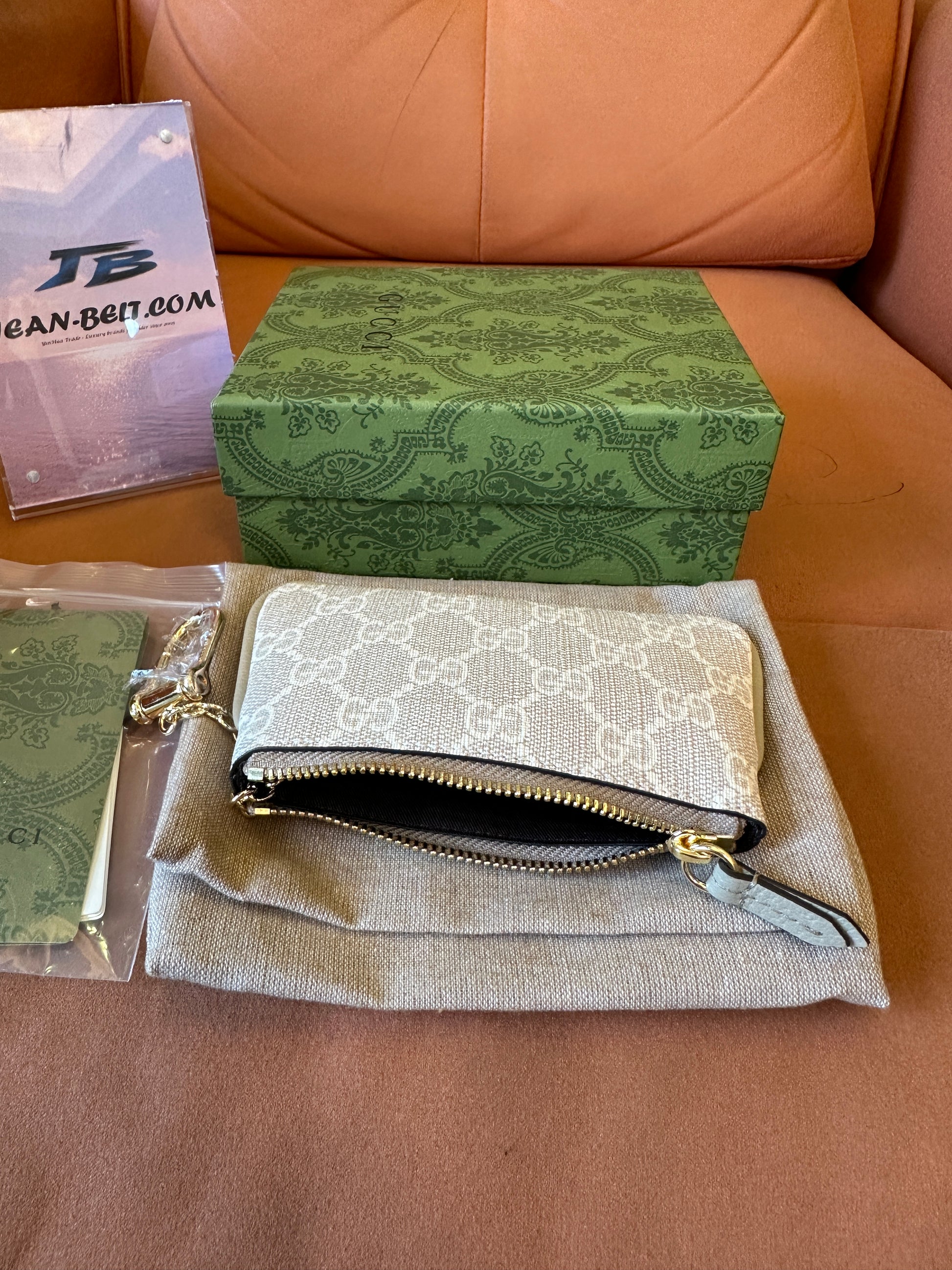 Elevate your essentials with this Gucci GG Supreme key pouch, crafted from durable beige canvas and trimmed with smooth leather. The classic monogram pattern lends timeless elegance, while the polished gold-tone hardware adds a refined touch. This compact pouch features a secure zip closure and an attached keychain clip, making it ideal for carrying cards, cash, or keys on the go. Perfect for slipping into your handbag or attaching to a tote or belt loop.