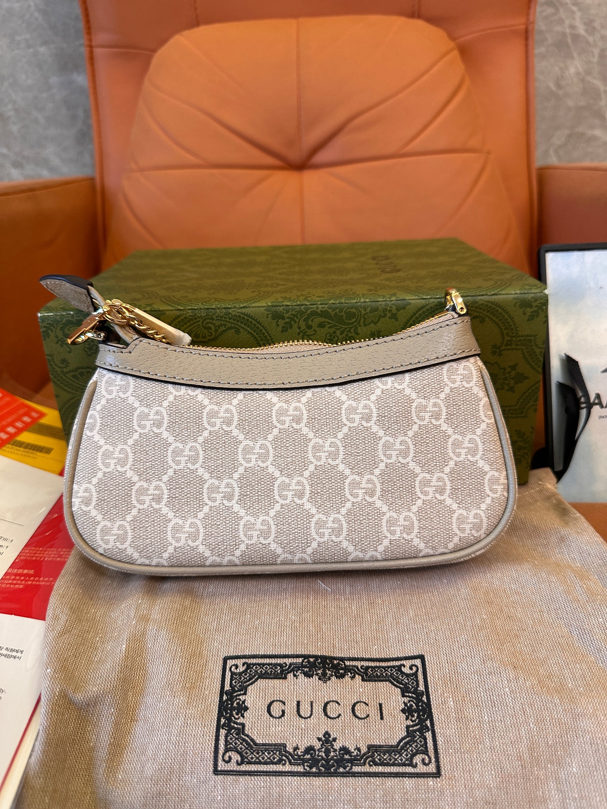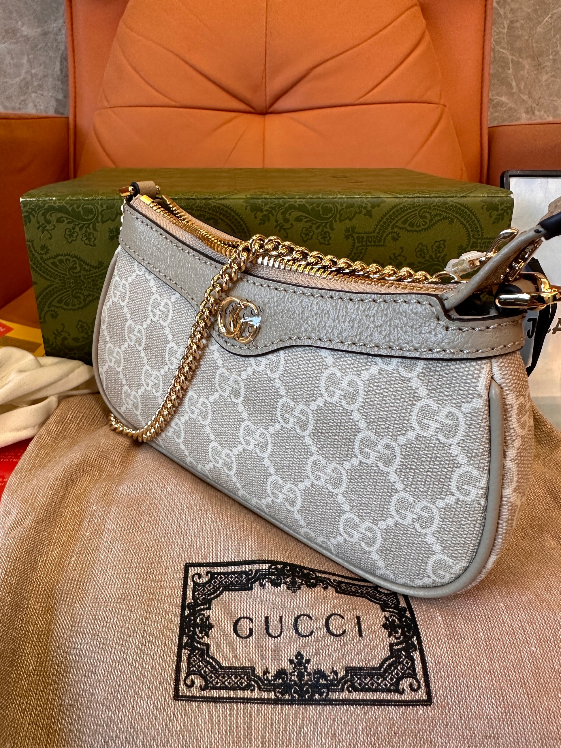 The Gucci GG Supreme Ophidia Mini Shoulder Bag is an elegant and versatile accessory, perfect for any occasion. Crafted from Gucci's signature GG Supreme canvas in a beige and ivory colorway, this bag features a compact design enhanced by a gold-toned Double G logo and a chic chain strap. Its zip-top closure ensures practicality while maintaining a sophisticated appearance. With its timeless design and luxurious details, this bag is ideal for elevating both casual and formal outfits. Complete with its original dust bag and box, this piece guarantees authenticity and enduring style.
