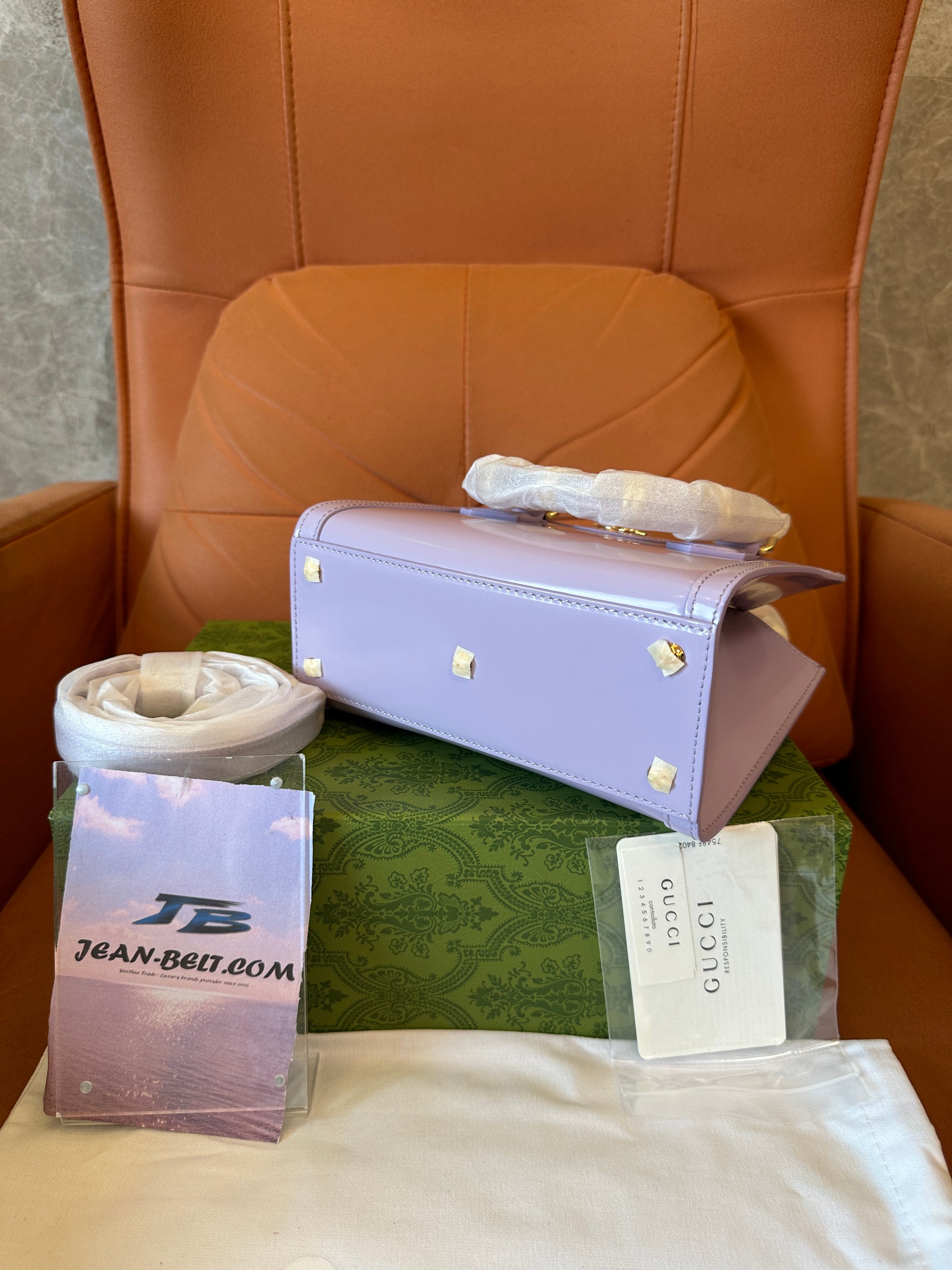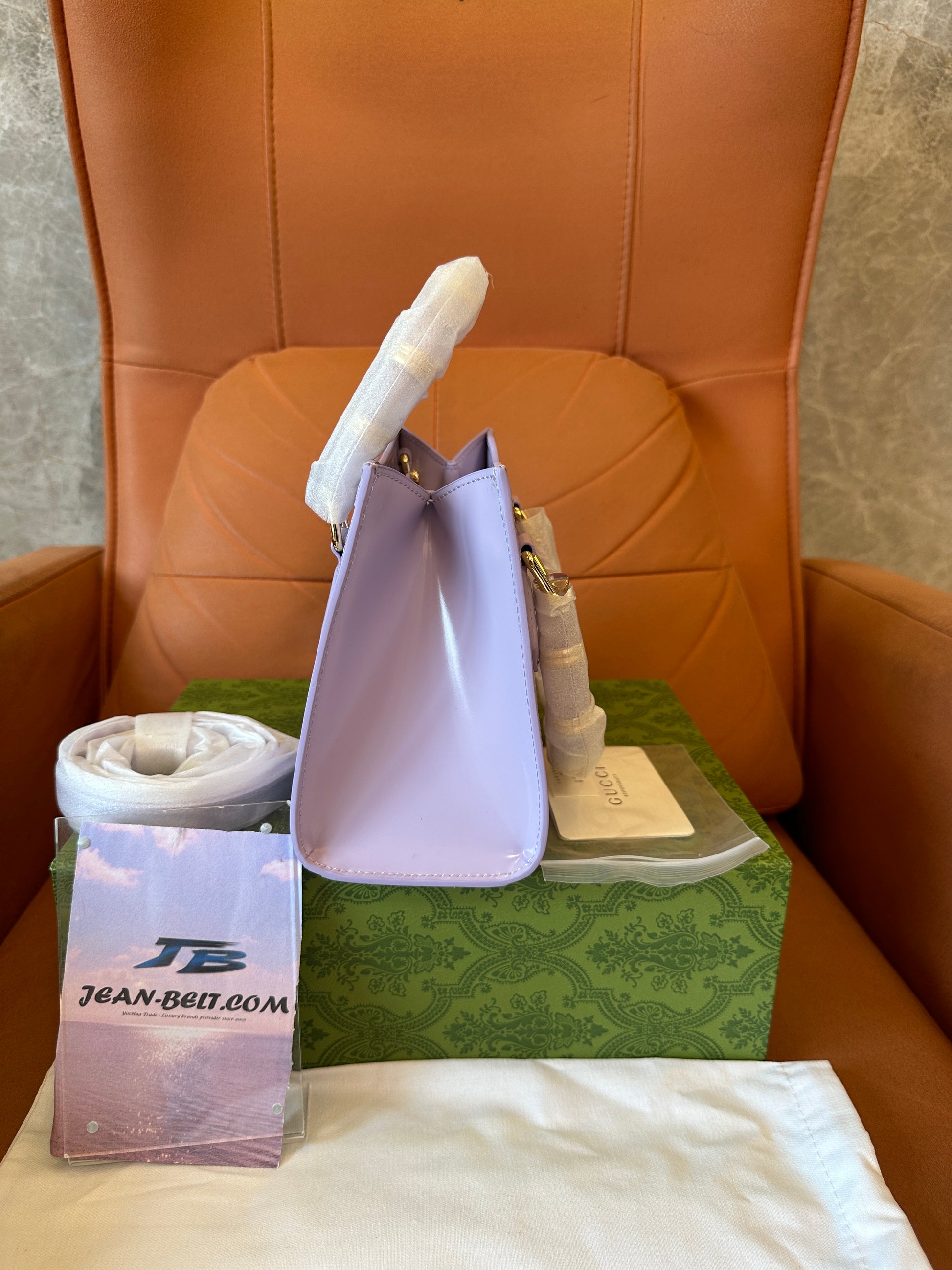 This elegant Gucci tote bag is crafted from glossy lilac patent leather and adorned with the signature gold GG logo at the front. Featuring structured top handles and a compact silhouette, this small-sized tote is perfect for adding a pop of color to your outfit while maintaining luxury appeal. Includes original packaging, adjustable shoulder strap, and authenticity card.