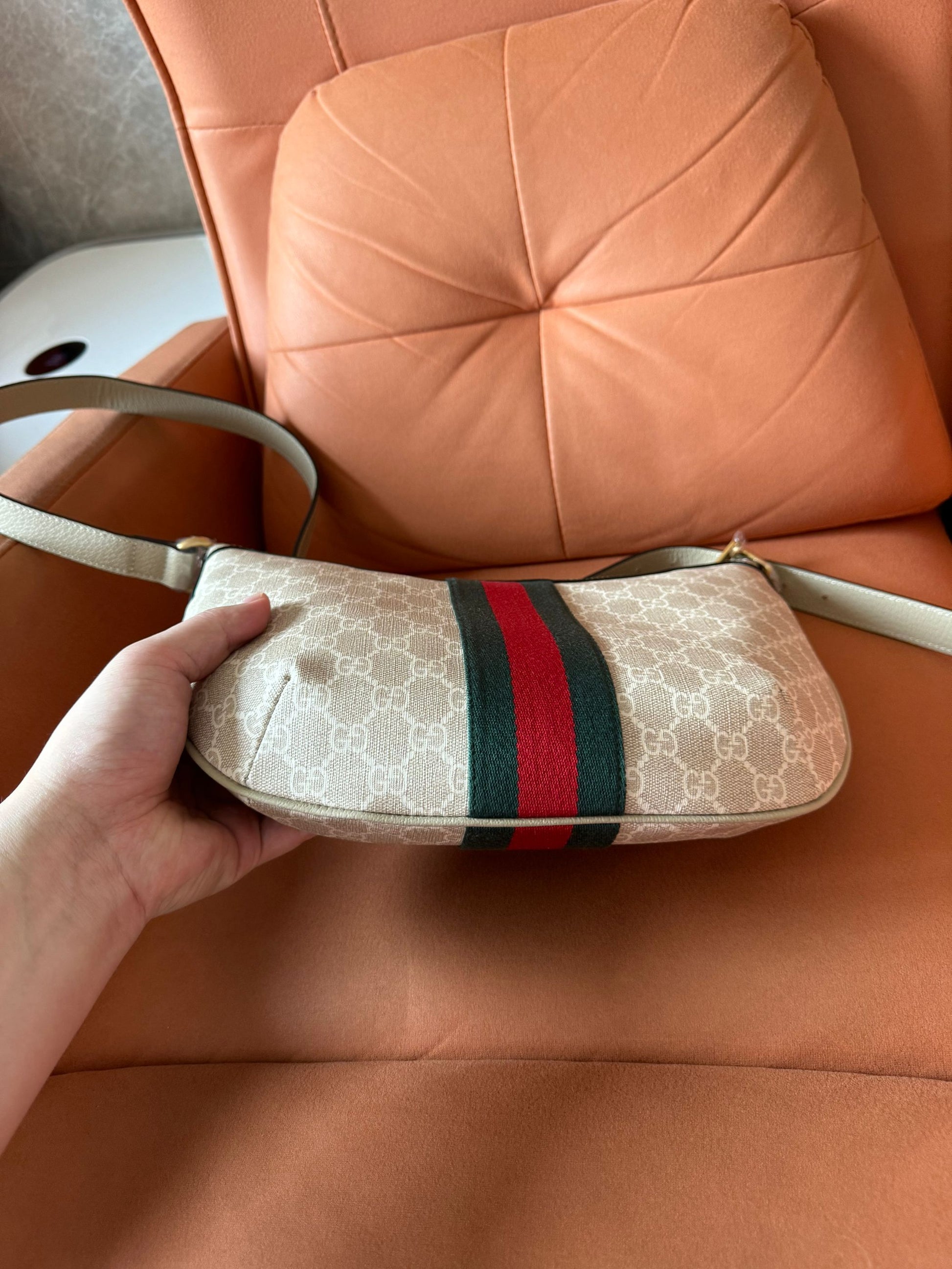 Compact and stylish, the Gucci Ophidia Half Moon Hobo bag in GG coated small canvas is the perfect accessory for any outfit. With a sleek design and durable material, it exudes luxury while providing functionality. The half moon shape adds a unique touch and the spacious interior can hold all your essentials.