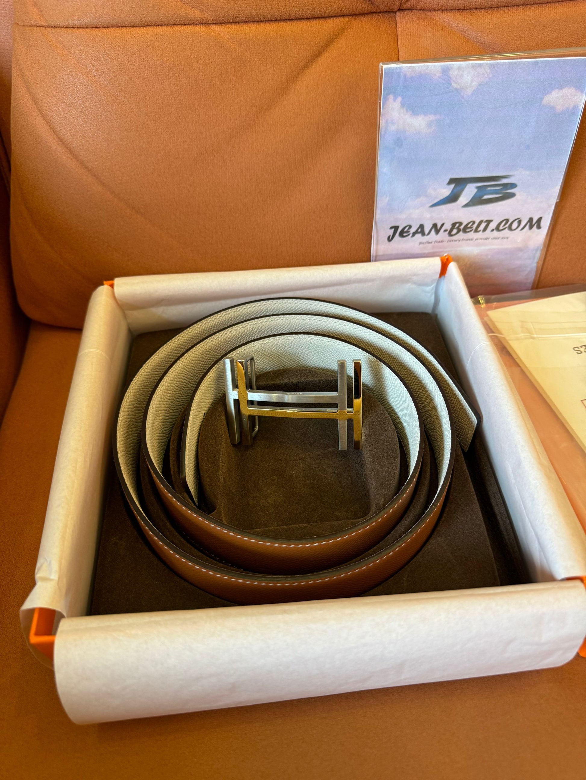 Experience timeless luxury with this Hermès reversible leather belt. Featuring a dual-tone strap, this belt offers versatile styling options with one side in classic tan and the other in modern white. Accentuated by the iconic "H" buckle in polished silver, this accessory is a symbol of elegance and sophistication. Perfect for both formal and casual occasions, it pairs seamlessly with any wardrobe. Comes with original Hermès packaging, including a box, dust bag, and authenticity materials.