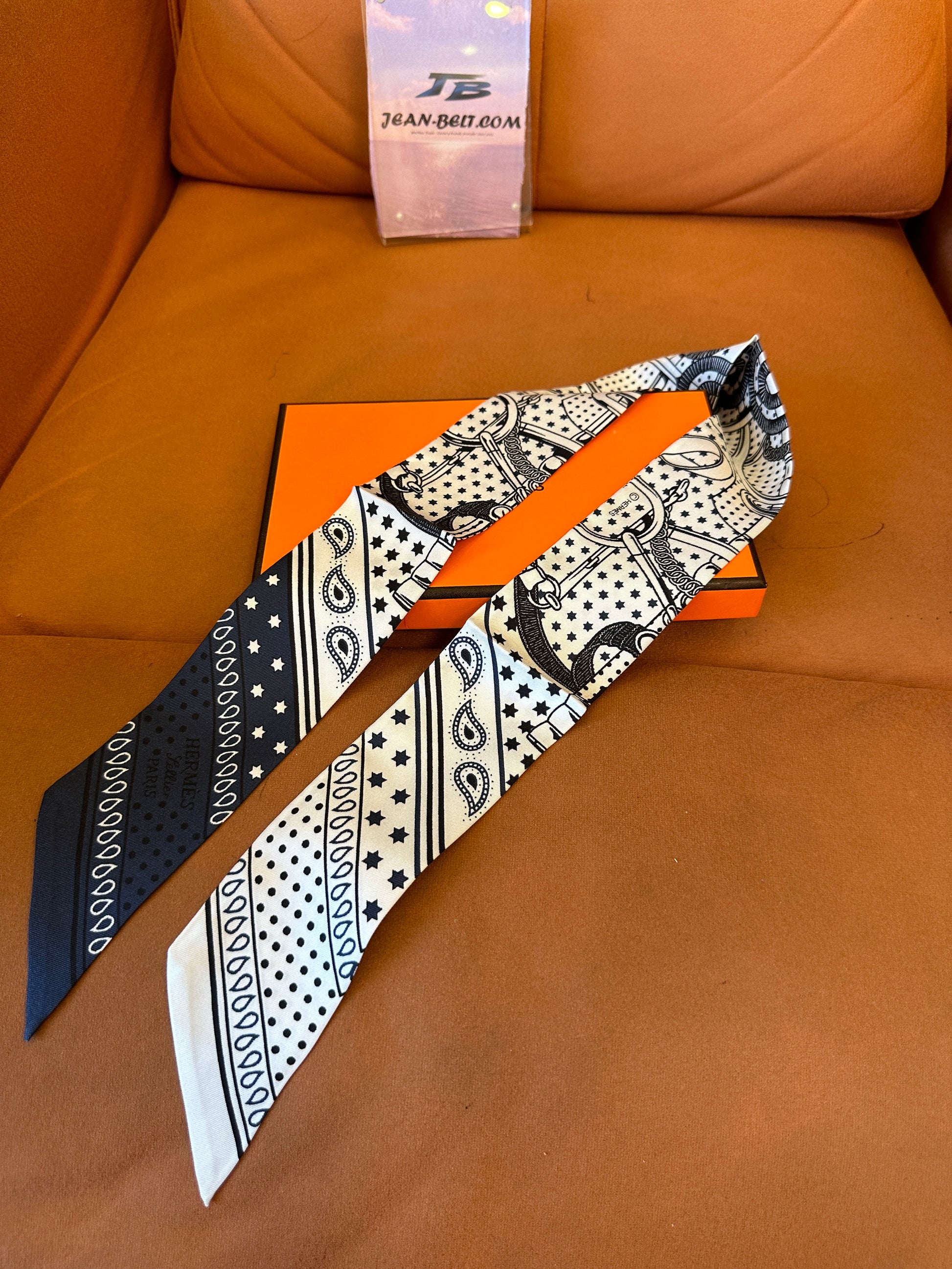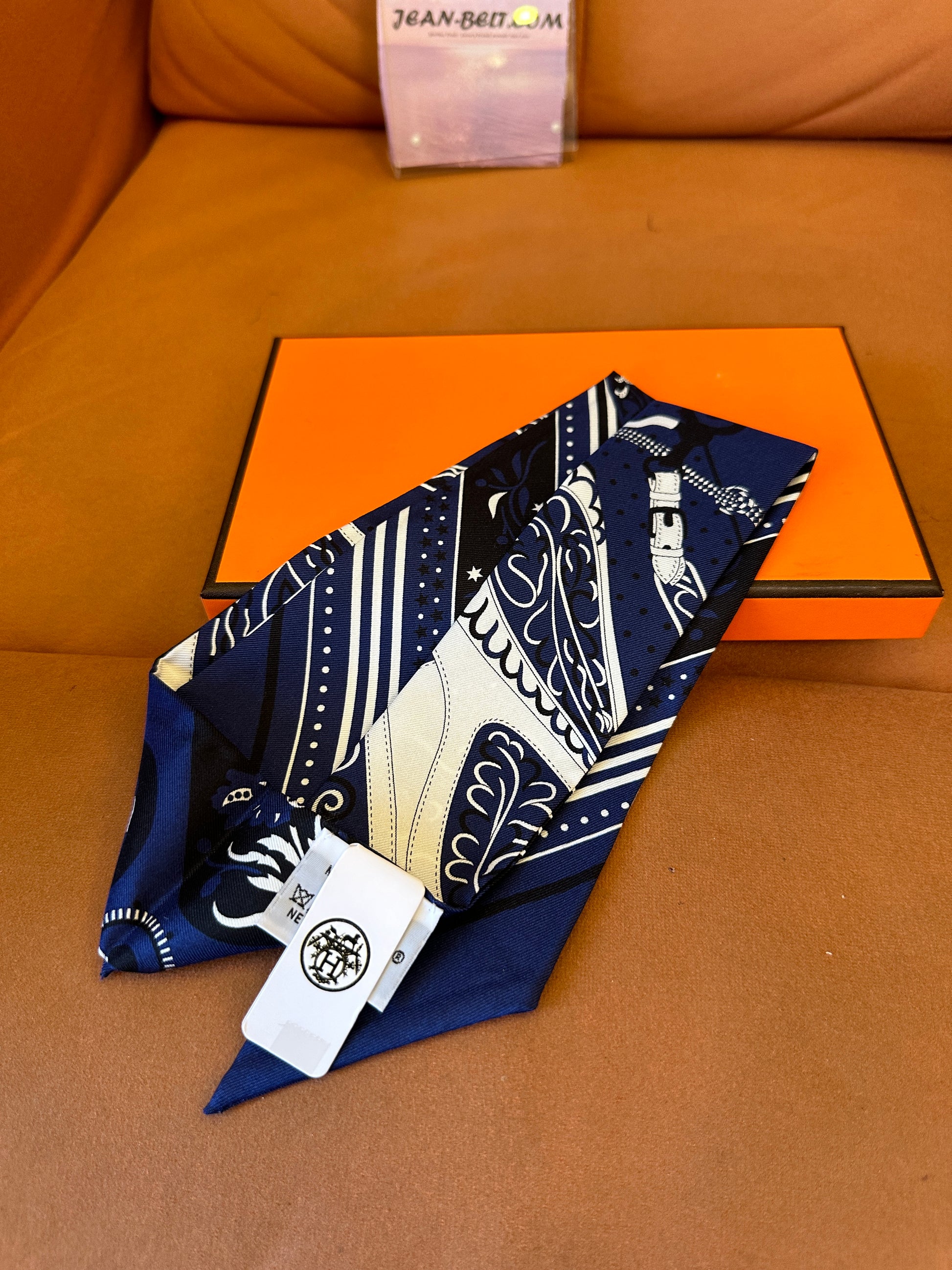Elevate your accessories collection with this stunning Hermès Twilly silk scarf, featuring intricate chain and medallion motifs in a refined palette of blue, navy, and cream. Made from 100% silk, this versatile piece can be tied around the neck, wrist, bag handle, or hair for a chic Parisian touch. A signature orange Hermès box is included, making it a perfect gift for luxury lovers.