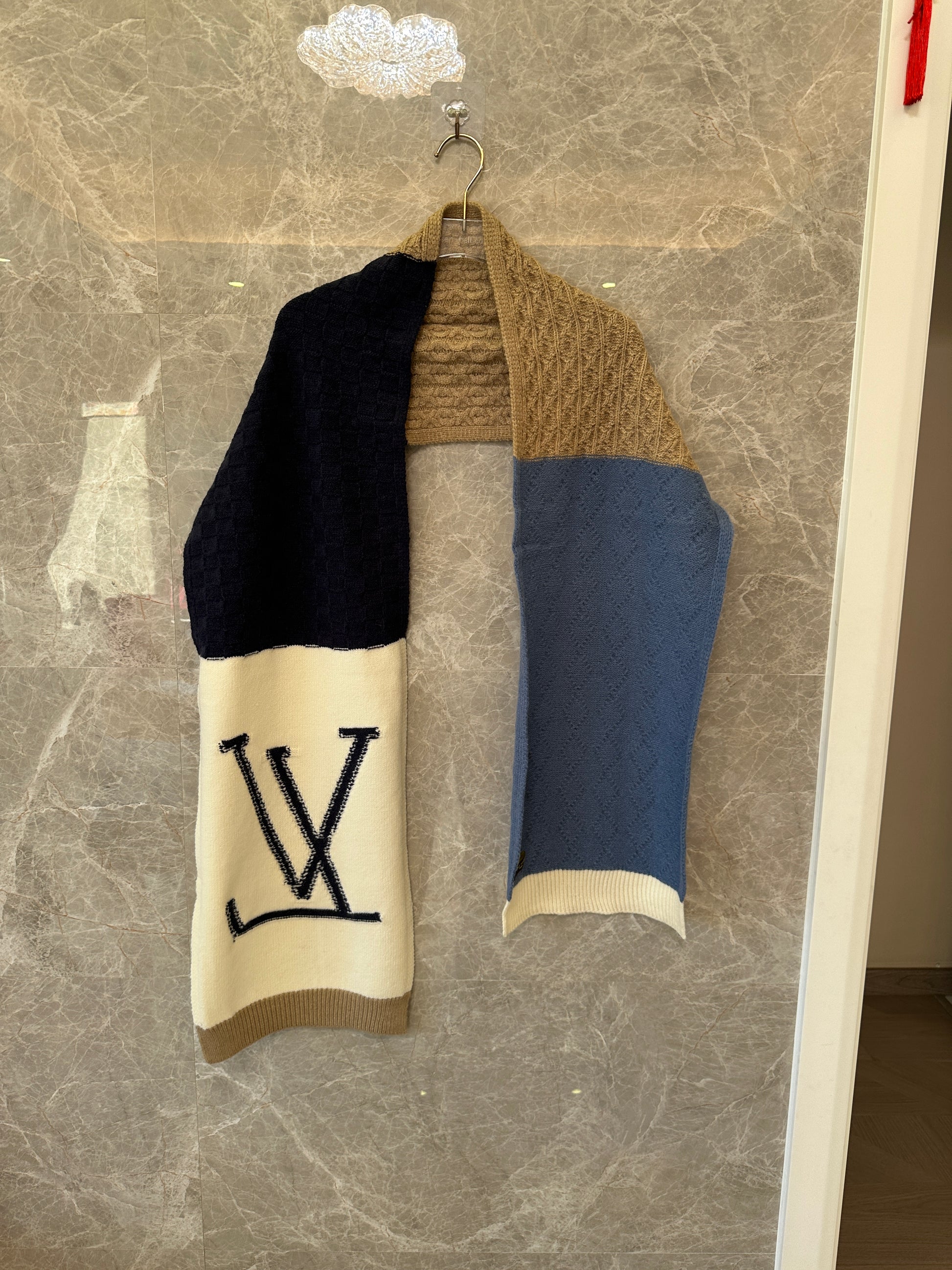 Louis Vuitton Color-Block Wool Scarf – Navy, Camel & Blue Knit with LV Logo