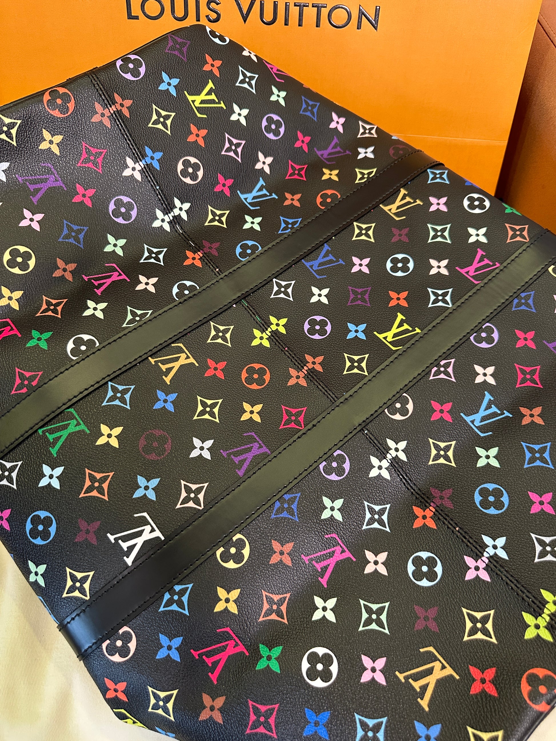 The Louis Vuitton Keepall 50 in Monogram Multicolor canvas is a bold and spacious travel companion. Crafted from durable coated canvas with a black background, this piece showcases the vibrant LV multicolored monogram designed by Takashi Murakami. Black leather trim and silver-tone hardware add refined accents, while the roomy 50cm size makes it perfect for weekend getaways and short trips. Combining practicality with iconic luxury, this duffle bag is both functional and stylish.