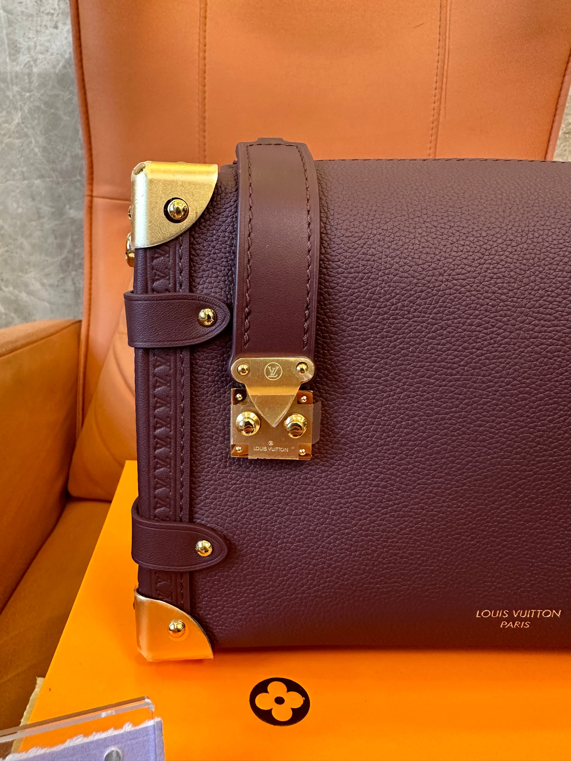 The Louis Vuitton Petite Malle Souple Bordeaux Leather Bag (Model M25659) is a refined reinterpretation of the Maison’s iconic trunk-making heritage. Crafted from Monogram Empreinte grained calf leather, this elegant creation reflects Louis Vuitton’s craftsmanship and Parisian sophistication. The rich Bordeaux hue is enhanced by gold-tone metal corners and an engraved S-lock, echoing the signature design of Louis Vuitton’s historic trunks.