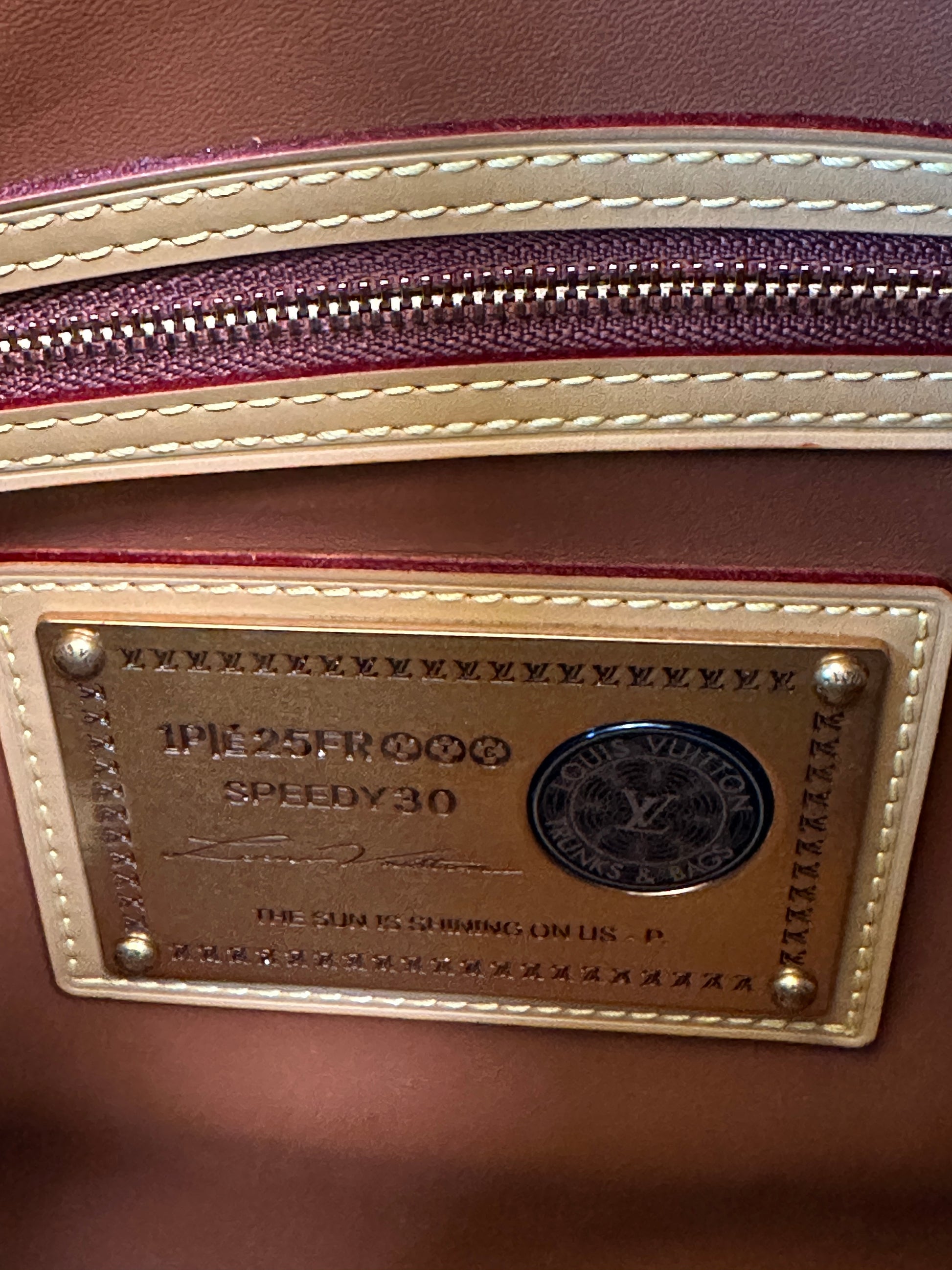 Inside, the bag reveals a spacious compartment with a leather tag engraved “1PIE25FR / Speedy 30”, celebrating Louis Vuitton’s craftsmanship and heritage. Perfect for both travel and everyday use, this set captures luxury and practicality in one.