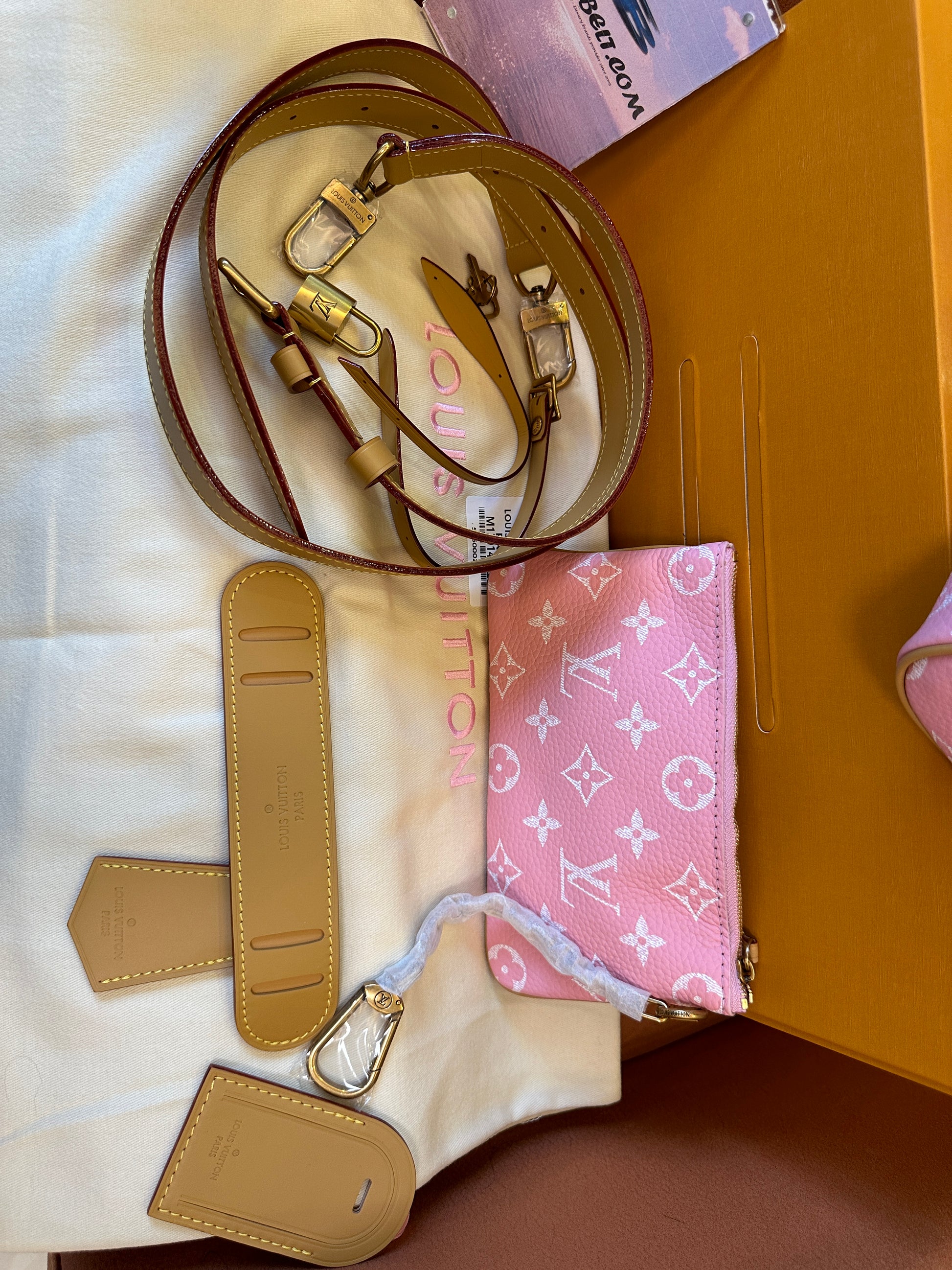 This Louis Vuitton Speedy 30 set brings a playful yet elegant charm with its exclusive pink Monogram canvas. Featuring the iconic Speedy silhouette, the bag is crafted in coated canvas with natural cowhide leather trims and gold-tone hardware. The soft pink hue adds a feminine touch, while the detachable strap and matching mini pouch provide versatile styling options.