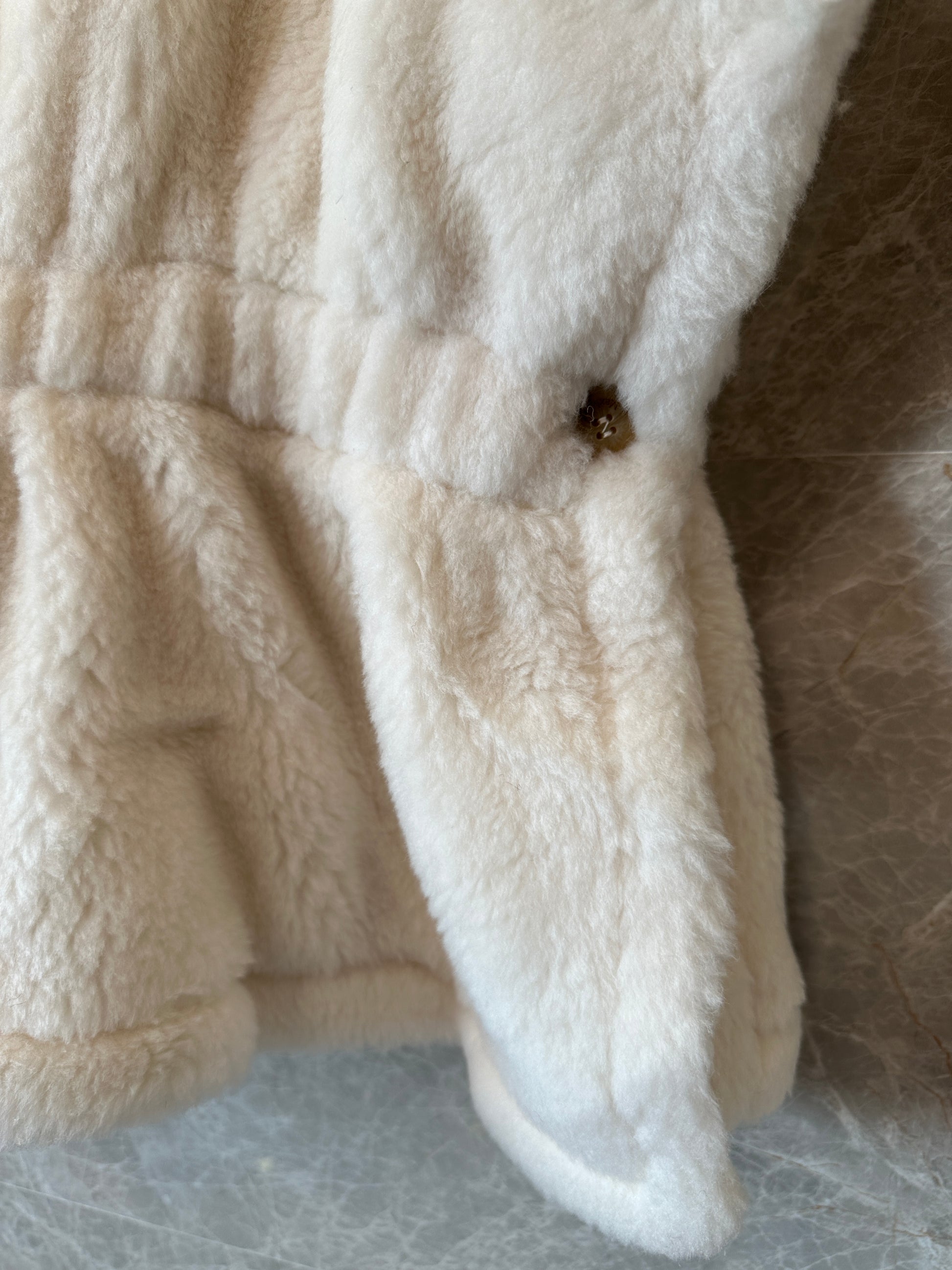 This Max Mara sleeveless vest is crafted from premium faux fur, offering a soft, plush texture with a refined, structured appearance. The ivory tone enhances its clean and elegant look, making it an ideal layering piece for fall and winter styling.