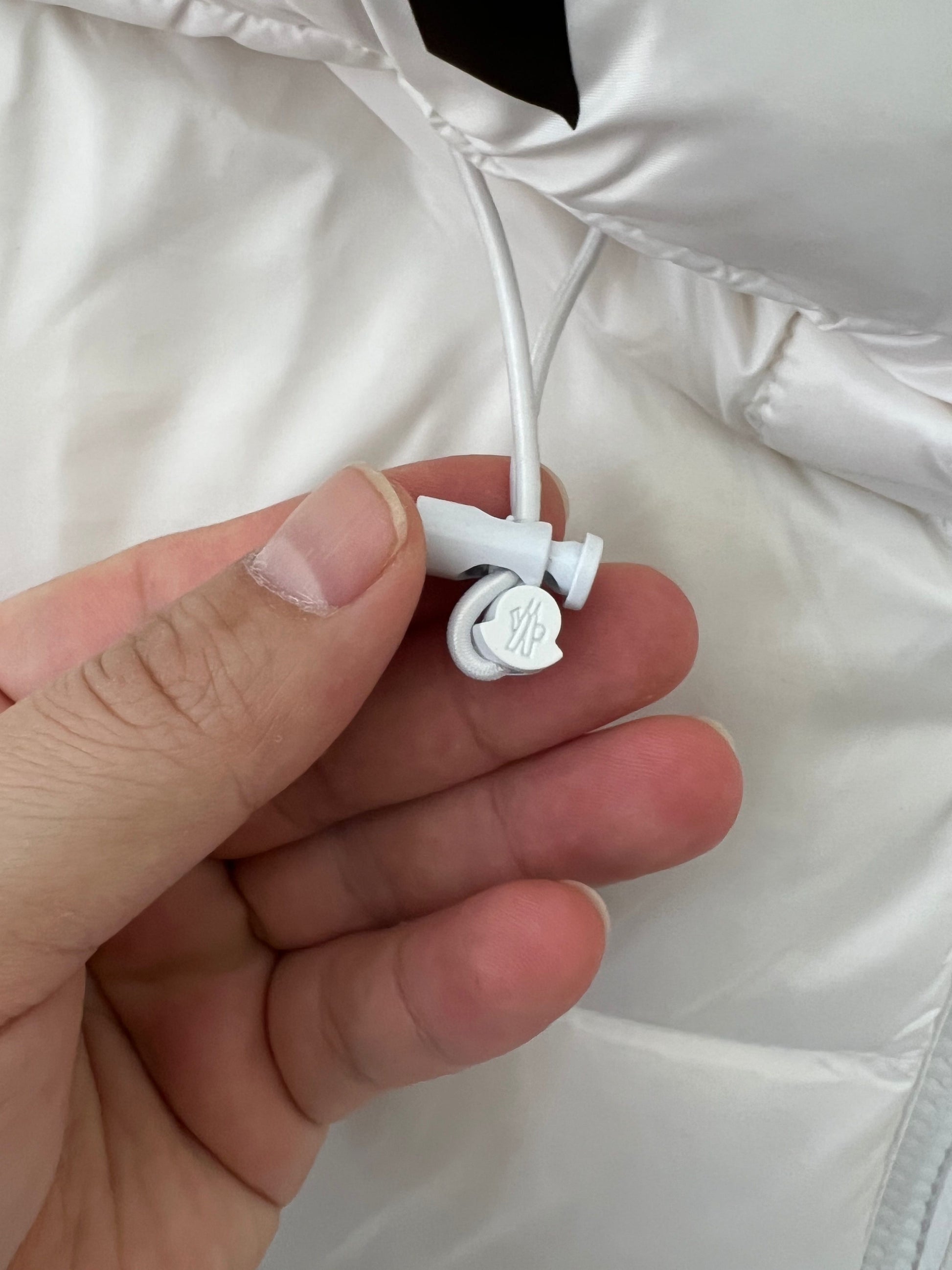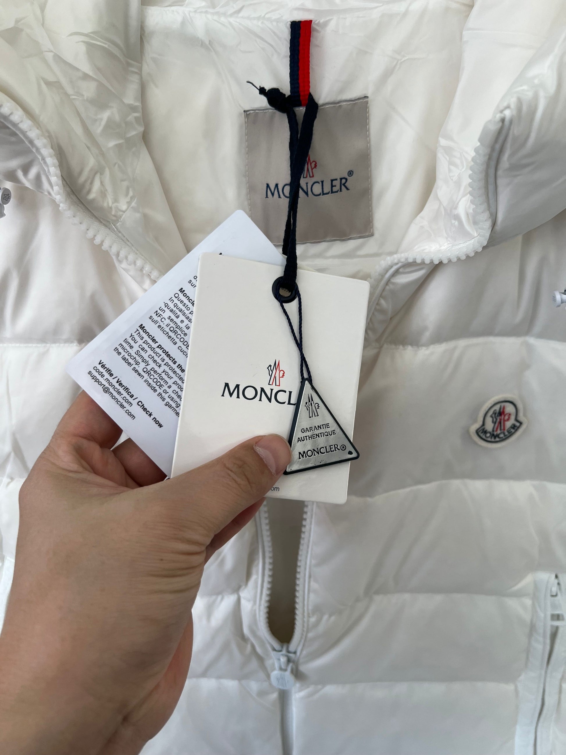 This white down vest from the renowned luxury brand Moncler combines elegance with functionality. Filled with premium down, it offers exceptional warmth while remaining lightweight and comfortable. The front features the iconic Moncler logo patch, and the back showcases bold logo lettering, adding a touch of distinctive style. Designed with a hood for added protection in cold weather and zippered side pockets for practicality, this vest is perfect for outdoor activities or casual wear. A flawless blend of fashion and function, it's an essential addition to your winter wardrobe.