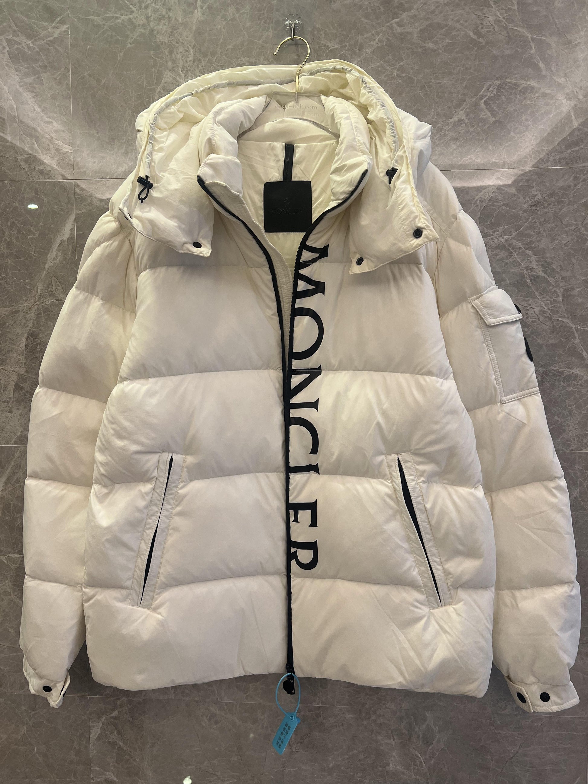 Step into winter with confidence and elegance wearing this Moncler white puffer jacket, featuring bold logo detailing along the zipper. Made with premium down filling, this jacket ensures exceptional warmth and comfort in chilly conditions. The detachable hood and zippered pockets add practicality, while the clean white color offers a sophisticated touch to your cold-weather wardrobe. Perfect for casual outings or alpine adventures, this jacket combines luxury and functionality seamlessly.
