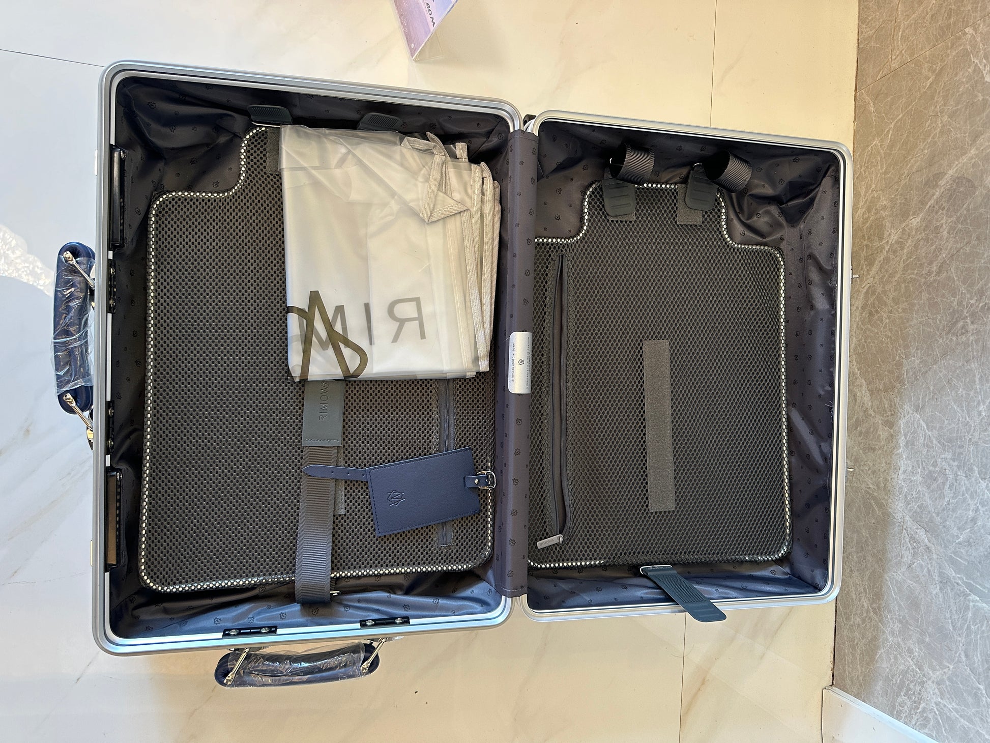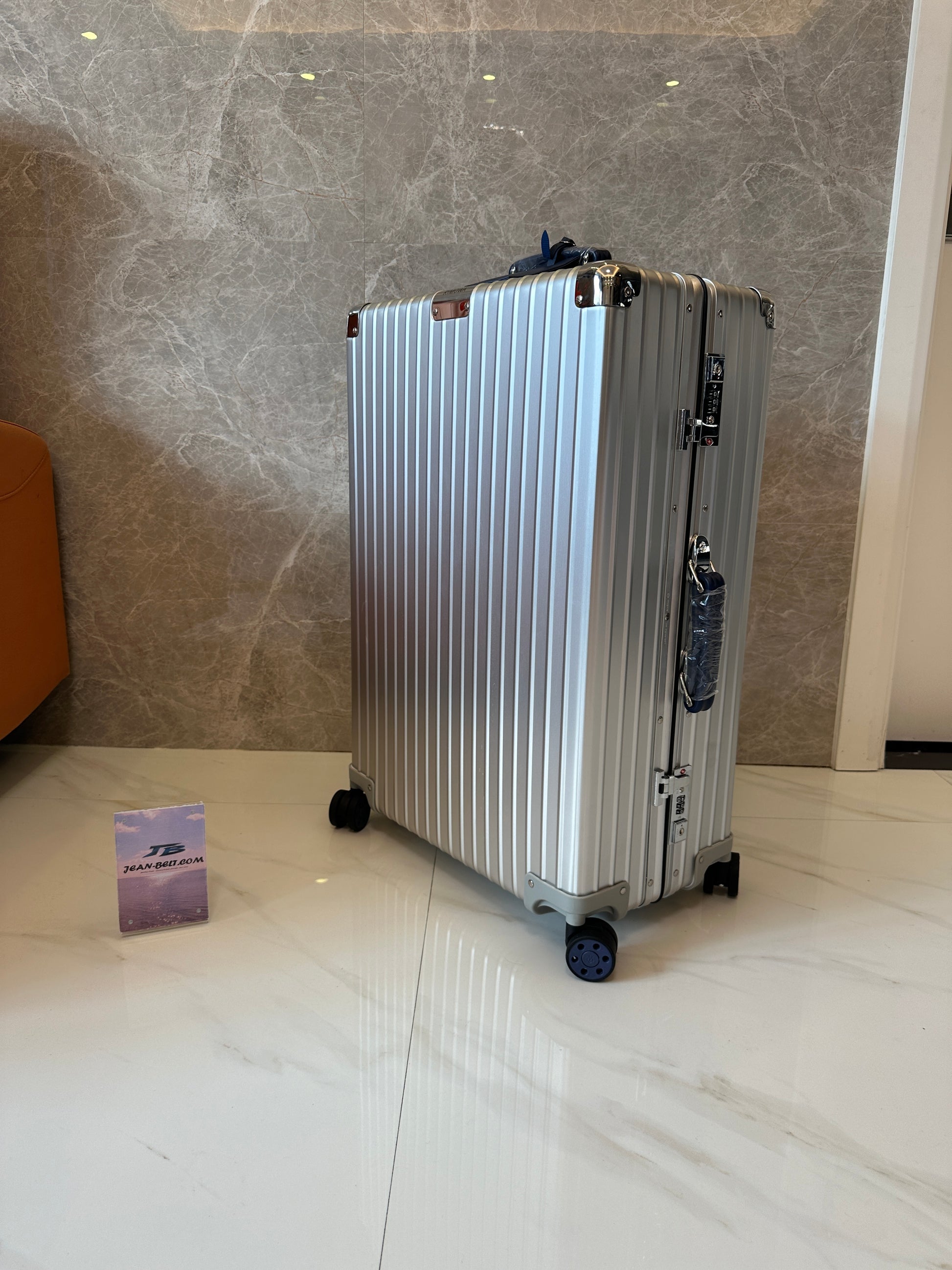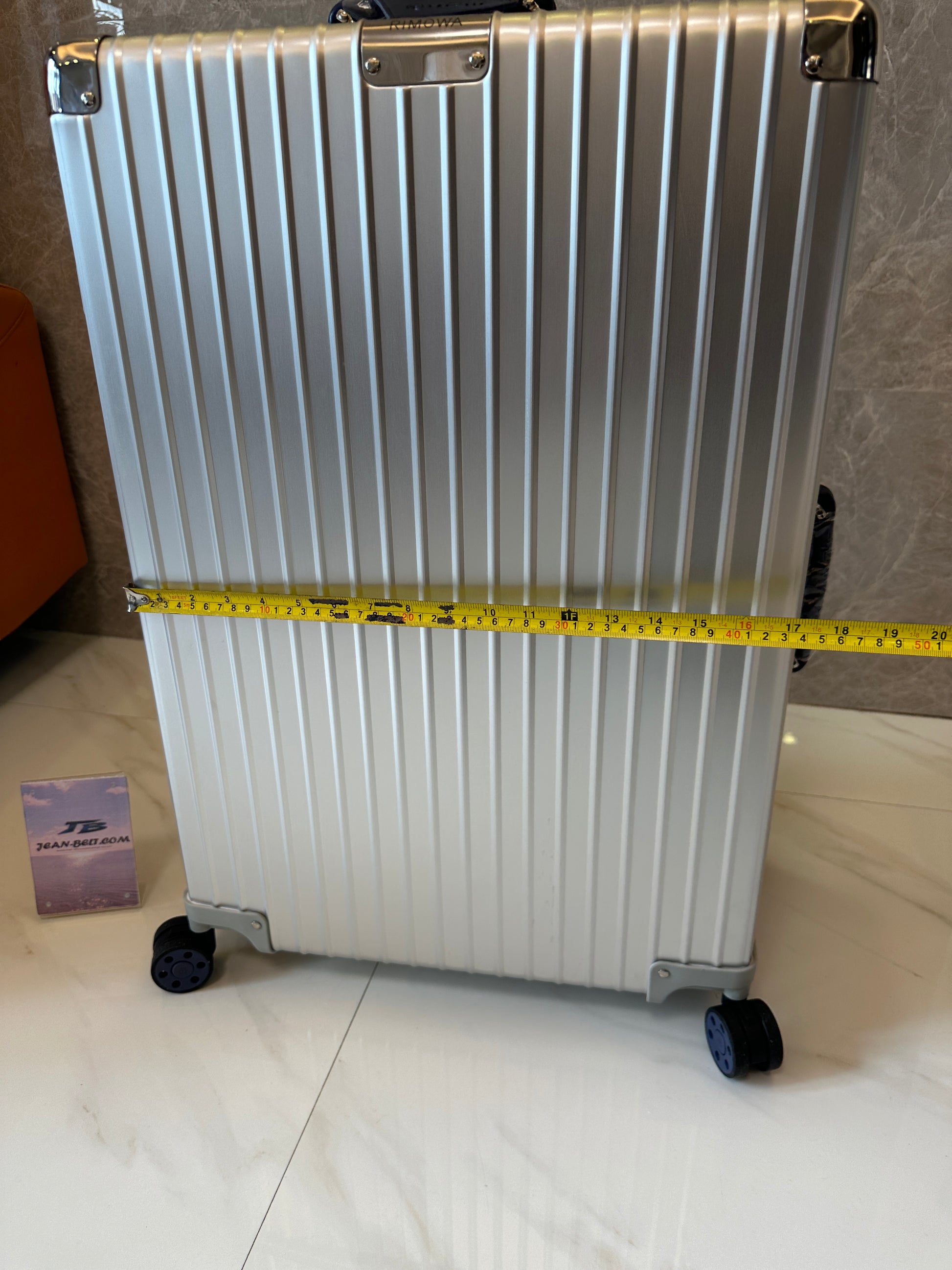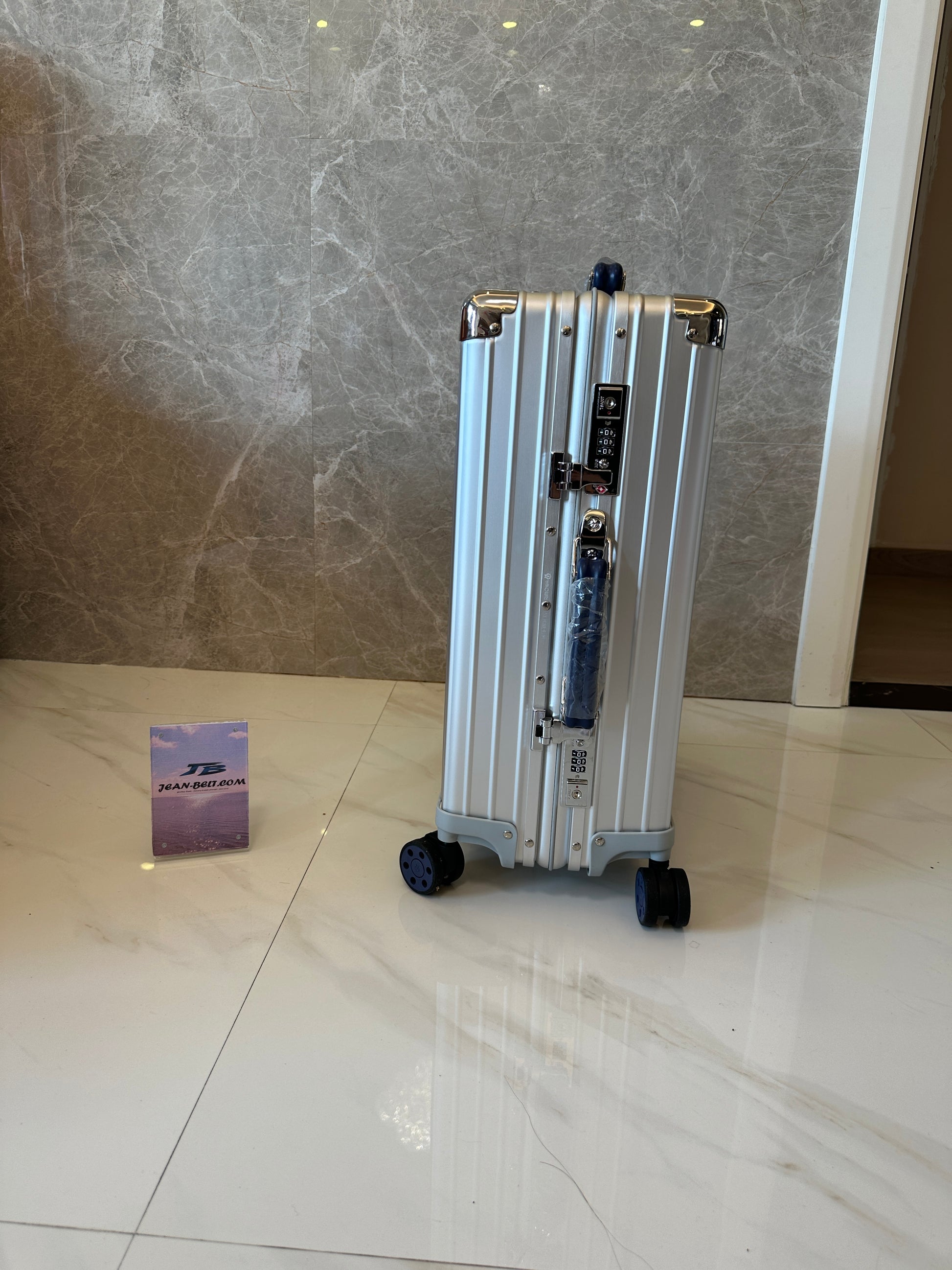This RIMOWA silver spinner suitcase features a clean, structured design with signature vertical grooves, offering a refined and professional travel appearance. Built for both short and long trips, it combines smooth mobility with reliable security.