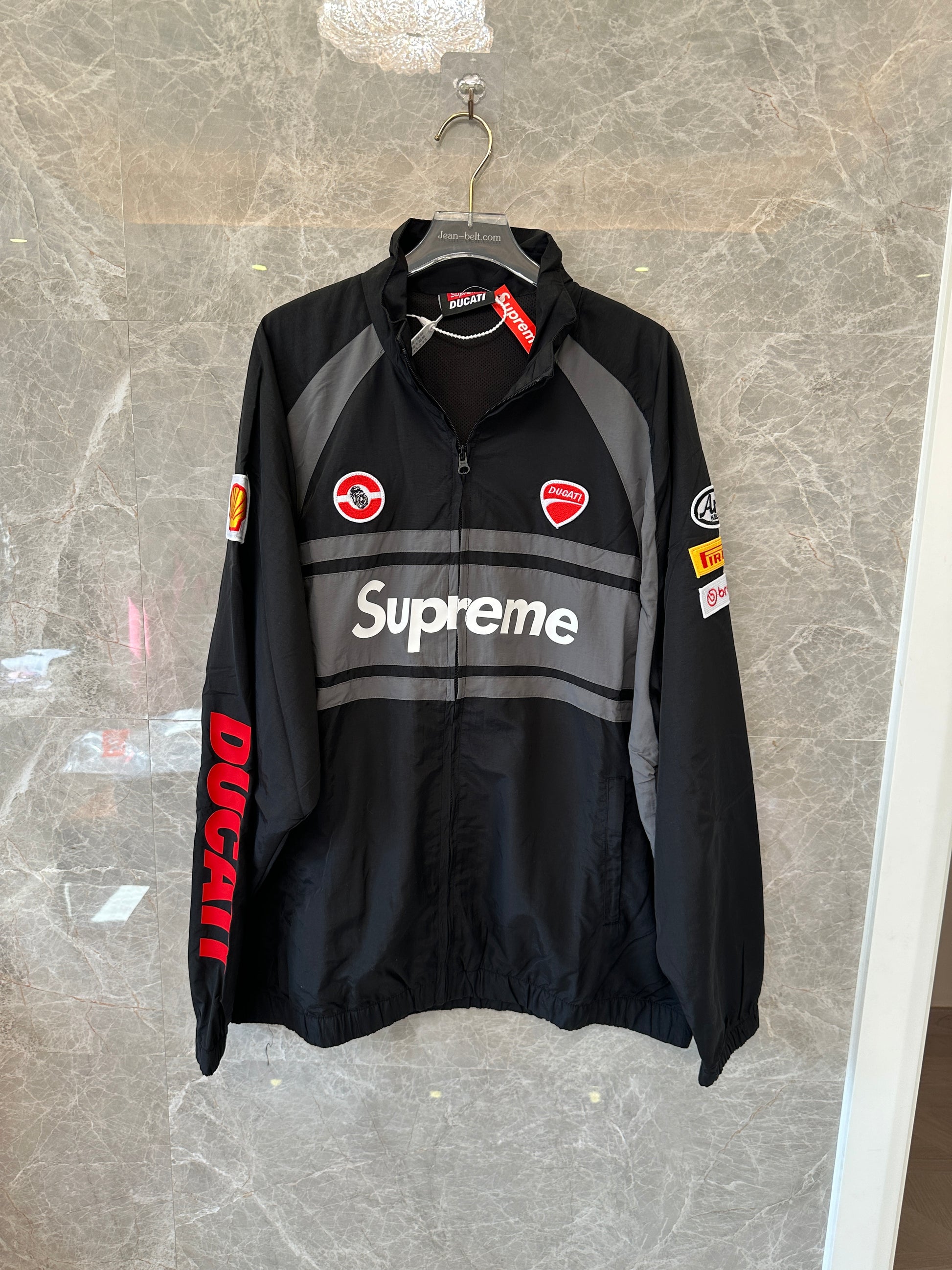Details: Embroidered Supreme & Ducati logos, sponsor patches, zip closure