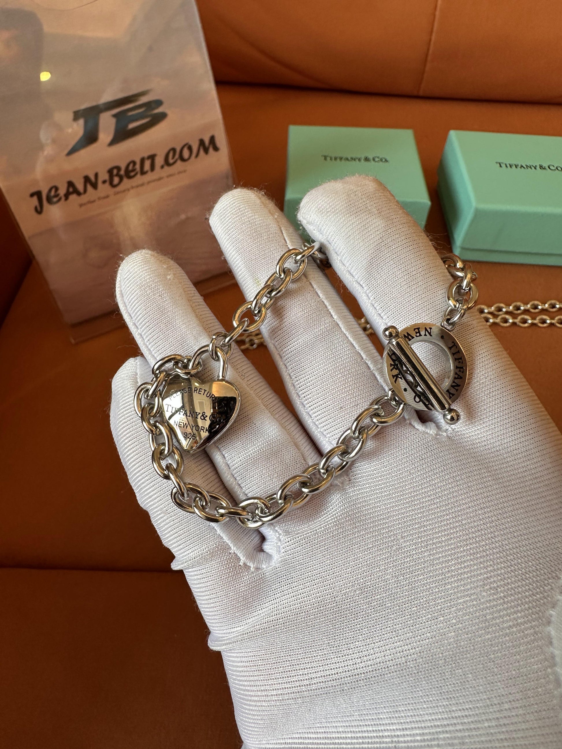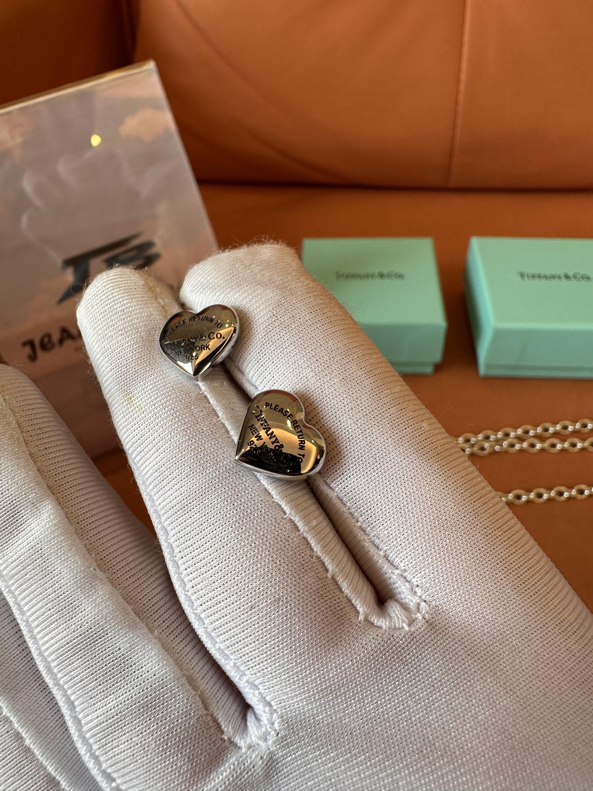 This exquisite Tiffany & Co. Heart and Circle Charm Set includes a bracelet, necklace, and earrings, each crafted from high-quality sterling silver for a timeless look. The bracelet features interlocking links with a charm that combines a heart and circle, symbolizing love and unity. The necklace continues this theme with a similar charm, offering an elegant, minimalistic design that complements the bracelet perfectly. The earrings showcase heart-shaped studs, adding a delicate yet bold finishing touch. All pieces are presented in Tiffany's signature blue boxes, making this set an ideal gift for a special occasion or a cherished addition to your personal jewelry collection.