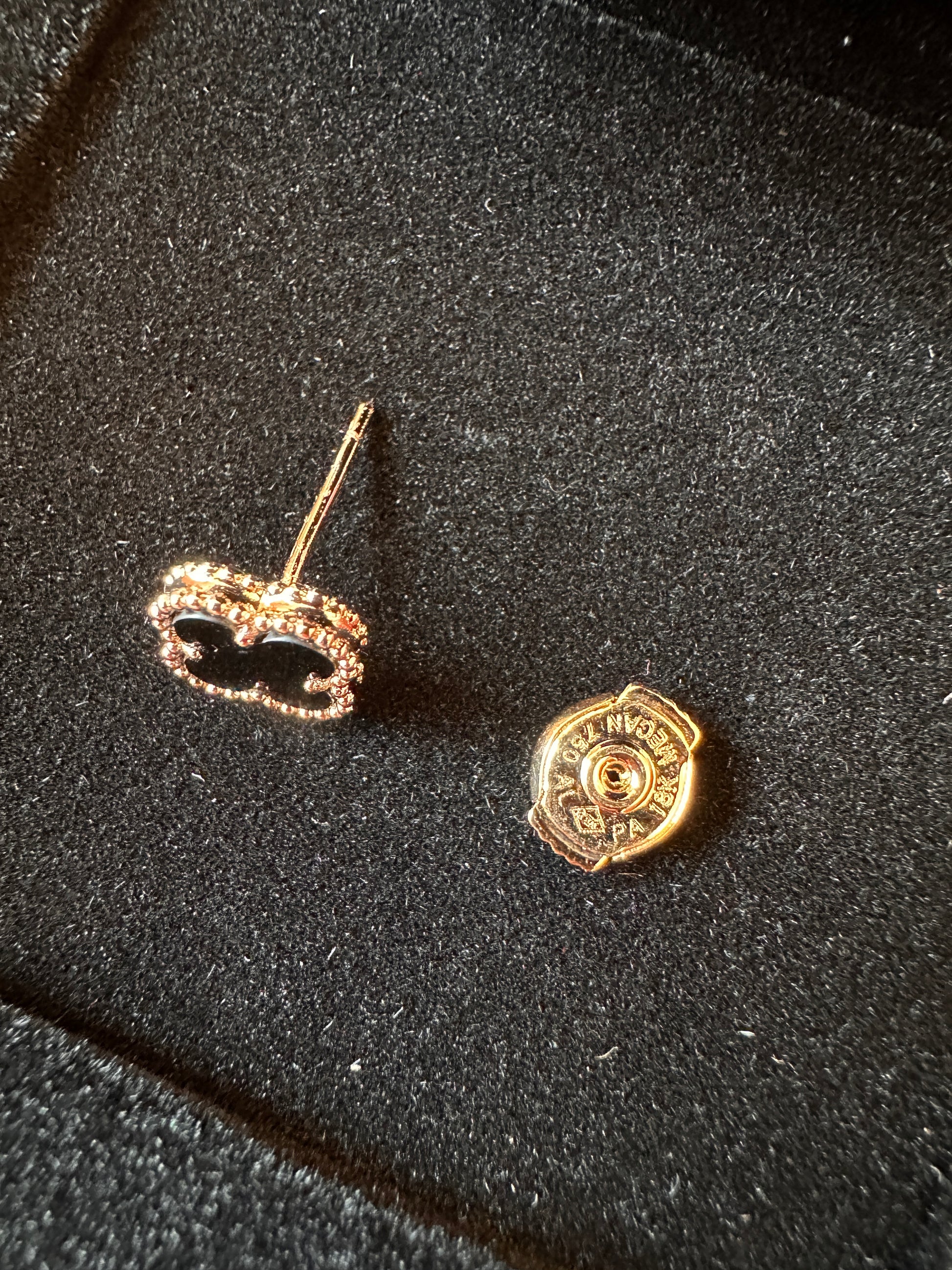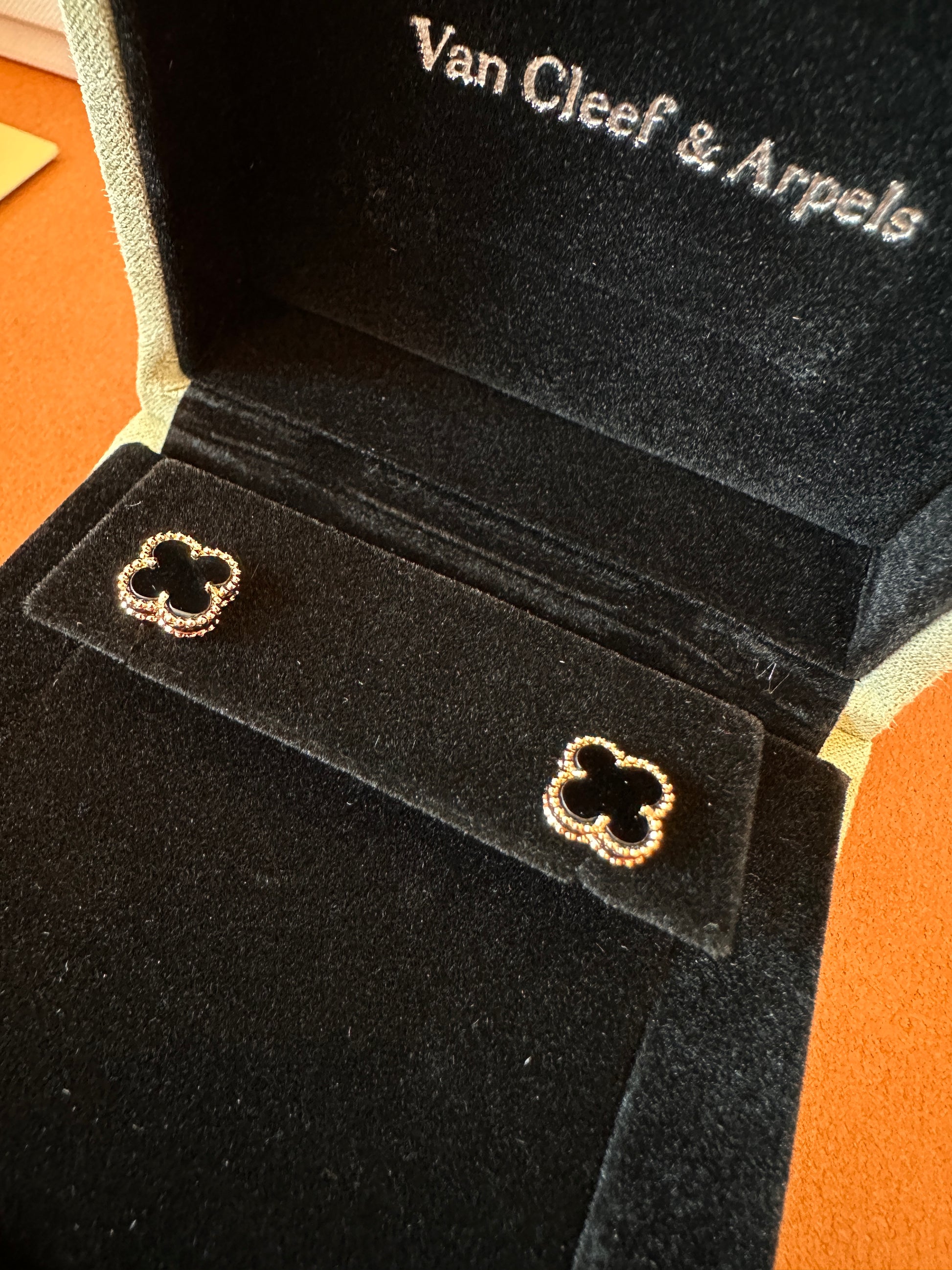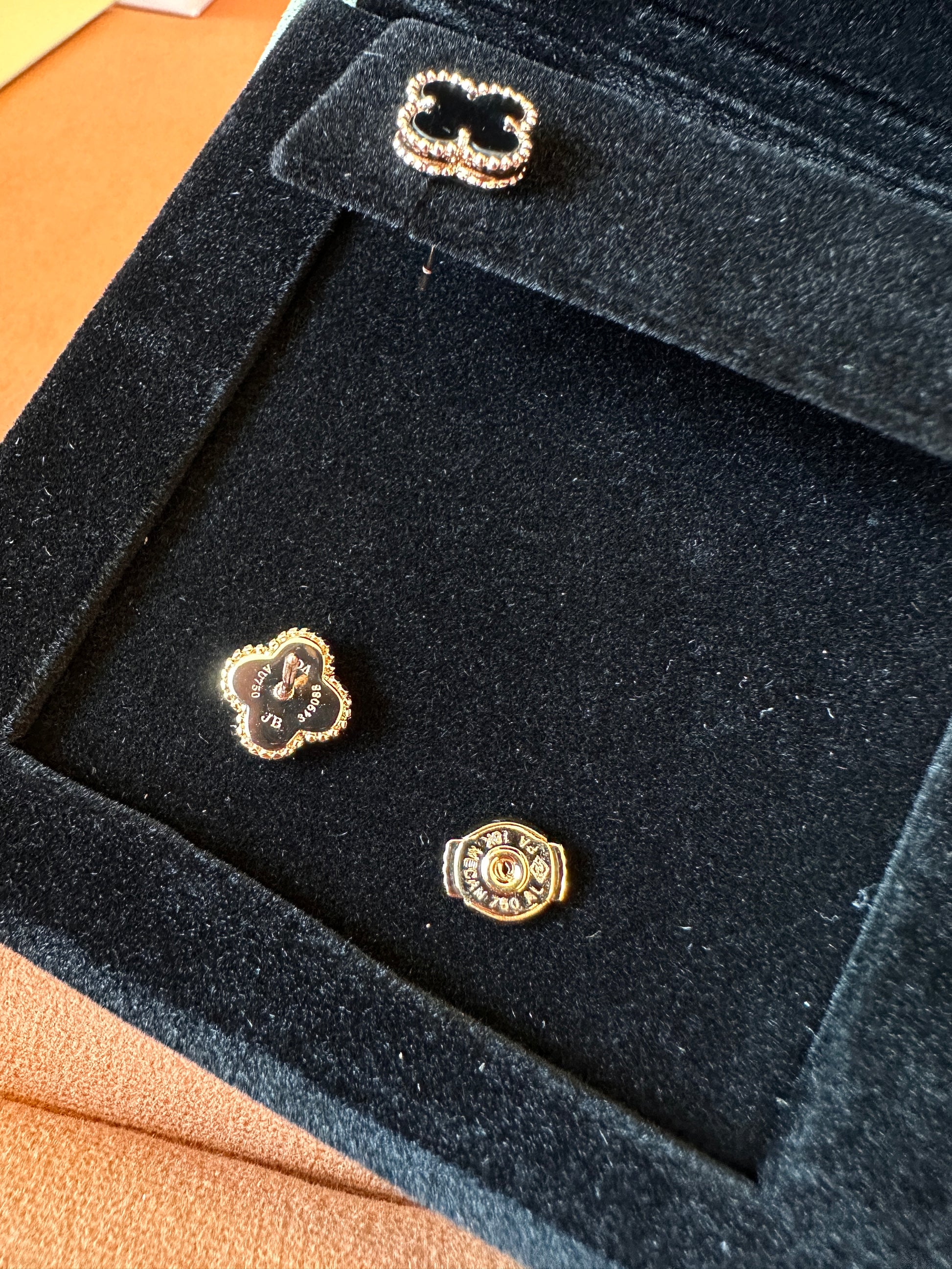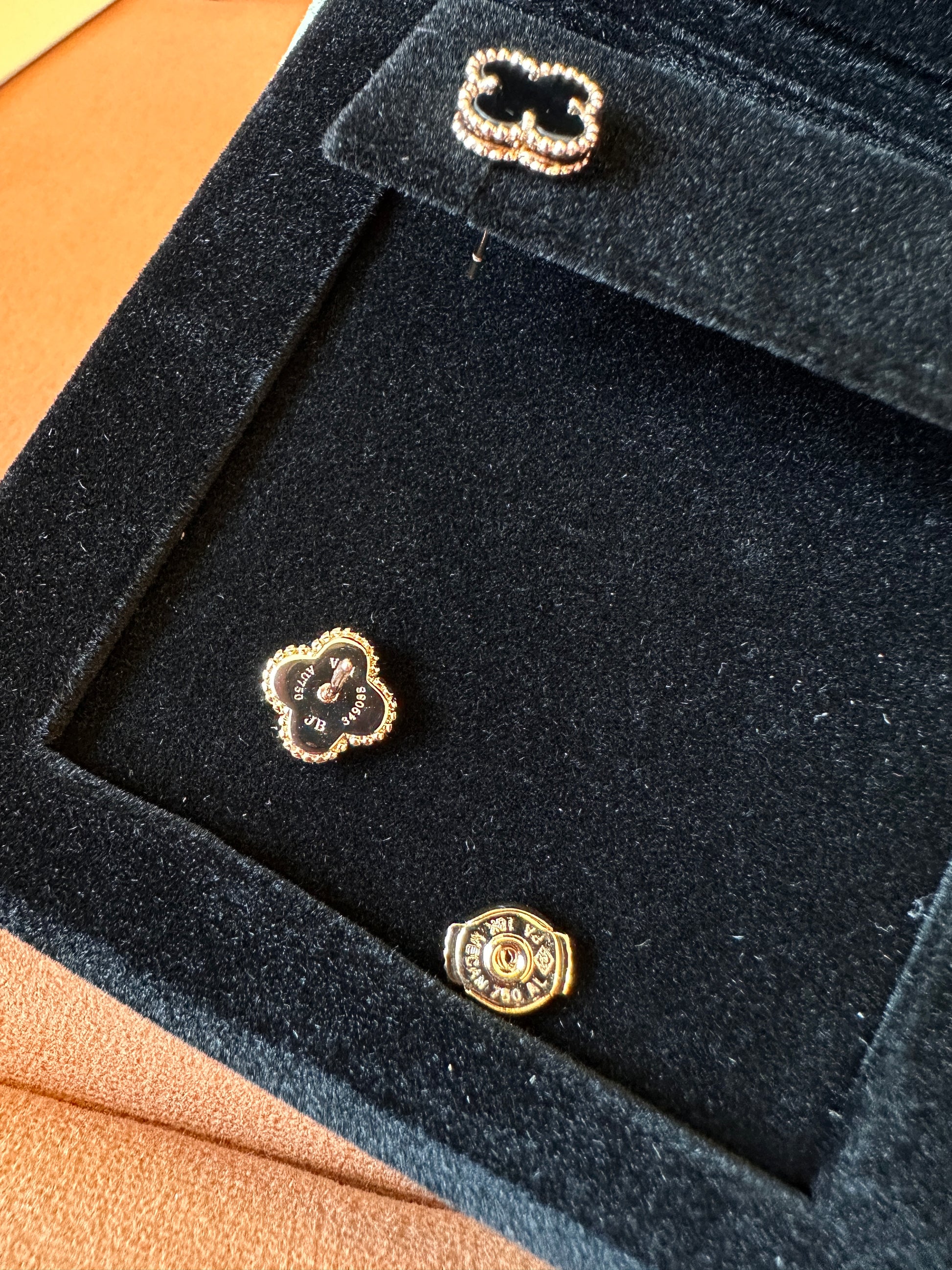 These exquisite earrings from Van Cleef & Arpels are part of the renowned Alhambra collection. Crafted with a luxurious gold frame, each earring features a black onyx inlay, shaped into the iconic four-leaf clover design. Known for their timeless elegance, these earrings offer a sophisticated yet versatile accessory for any occasion. The Van Cleef & Arpels signature is embroidered inside the velvet box, showcasing the high-quality craftsmanship and attention to detail. Perfect for those who appreciate fine jewelry, these earrings embody both classic luxury and modern charm.