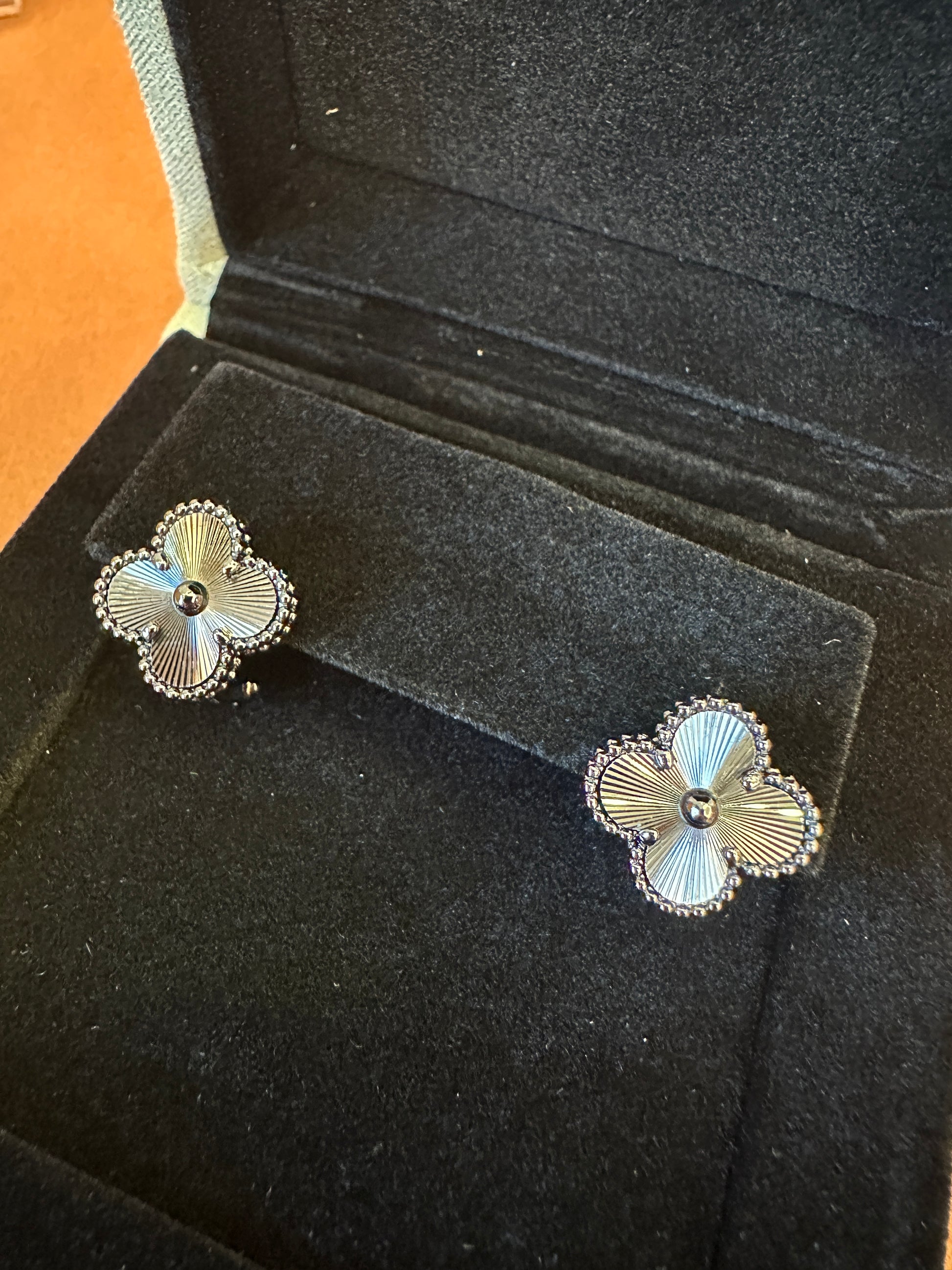 These Van Cleef & Arpels Vintage Alhambra earrings are a stunning reinterpretation of the Maison’s iconic four-leaf clover motif, symbolizing luck, love, health, and fortune. Crafted from 18K white gold, each clover features a guilloché sunburst engraving that reflects light with every movement. The edges are framed by the signature beaded contour, adding depth and texture to the radiant design.