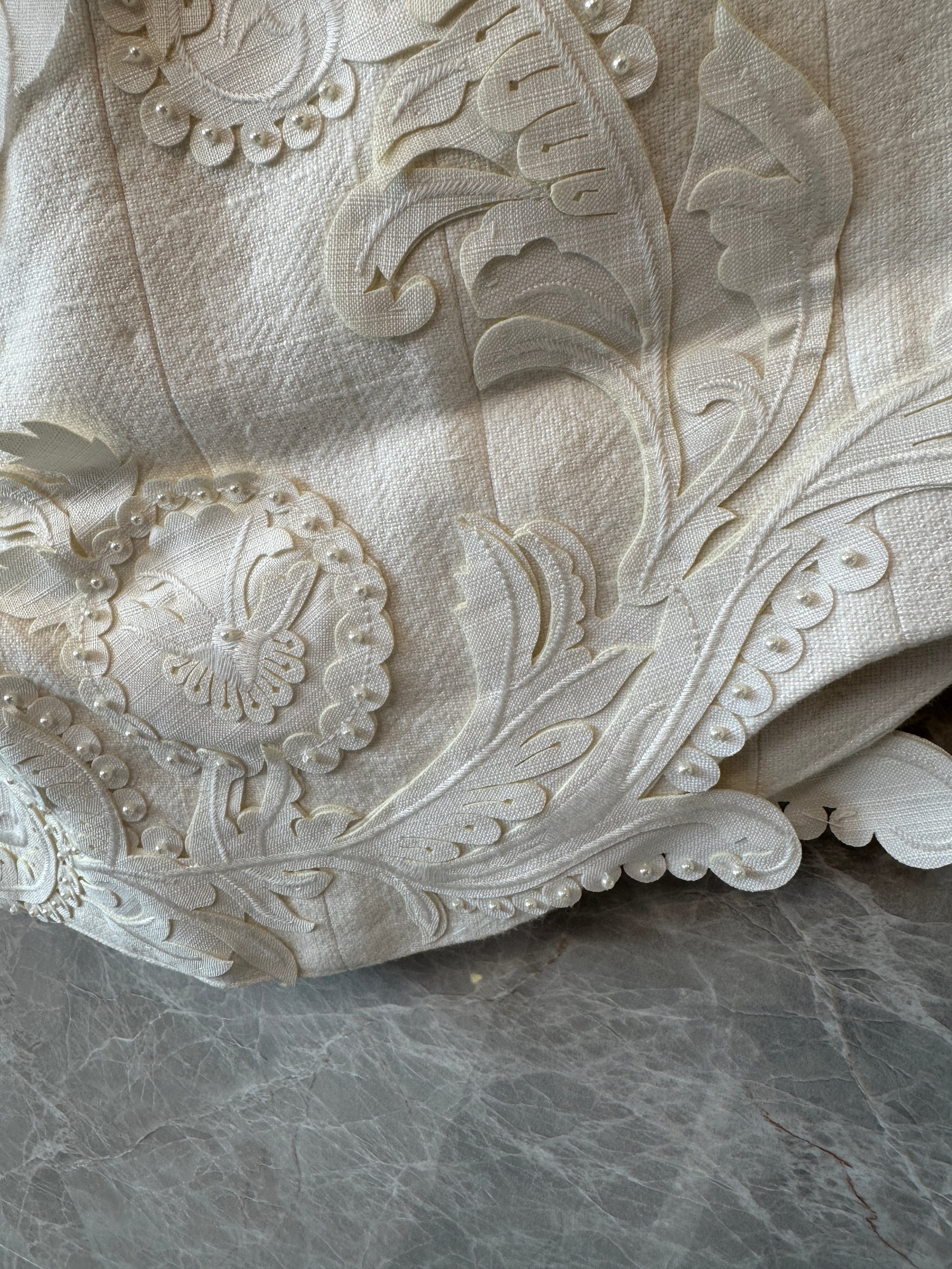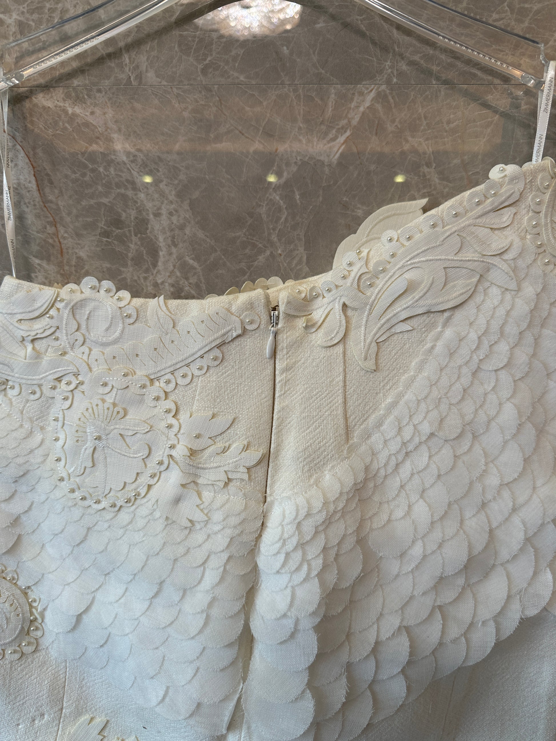 This Zimmermann mini skirt features a high-waisted silhouette with an asymmetric layered design, creating a sculptural and dimensional finish. The surface is detailed with intricate raised appliqué patterns that add depth and refined visual texture throughout.