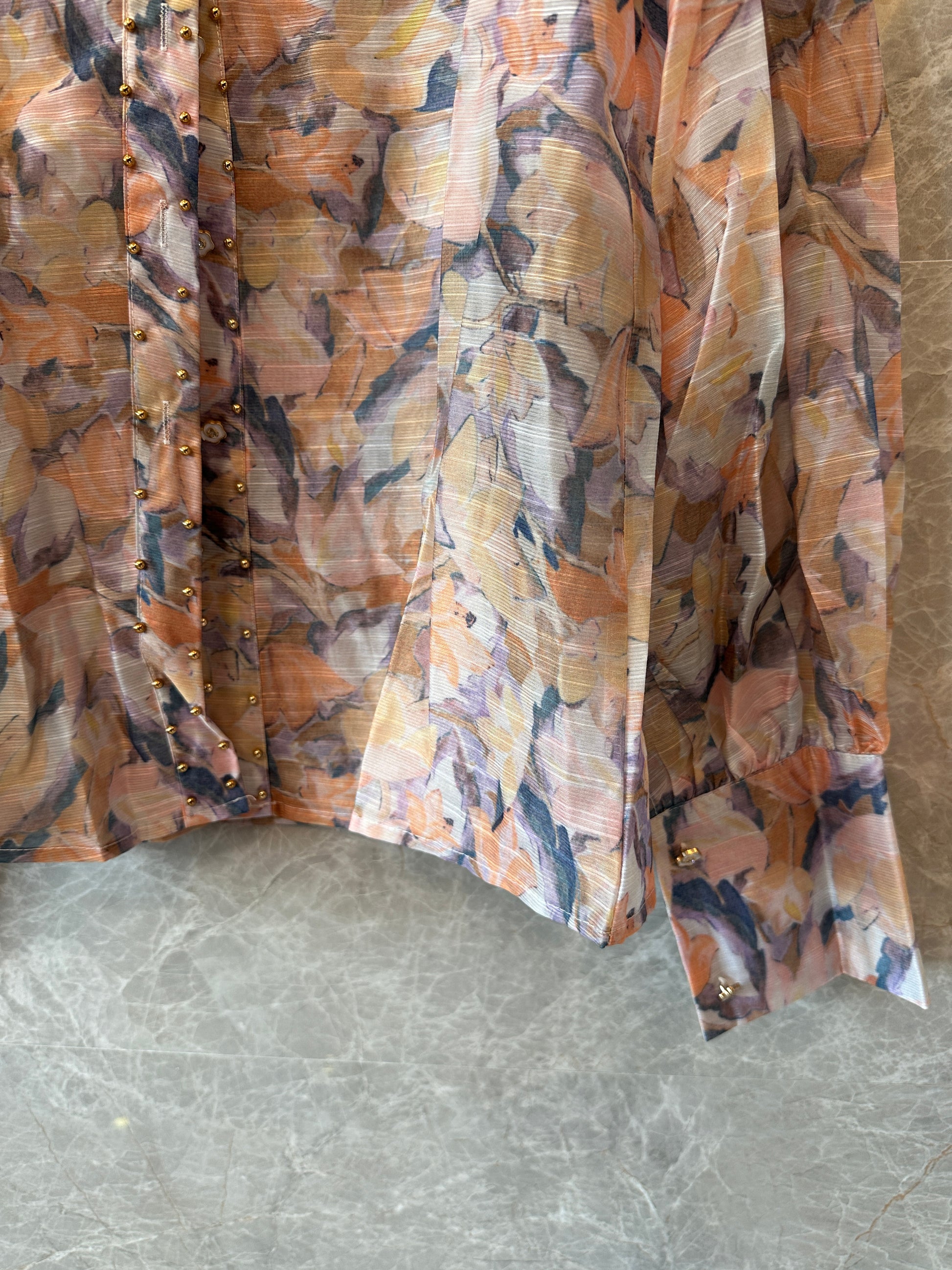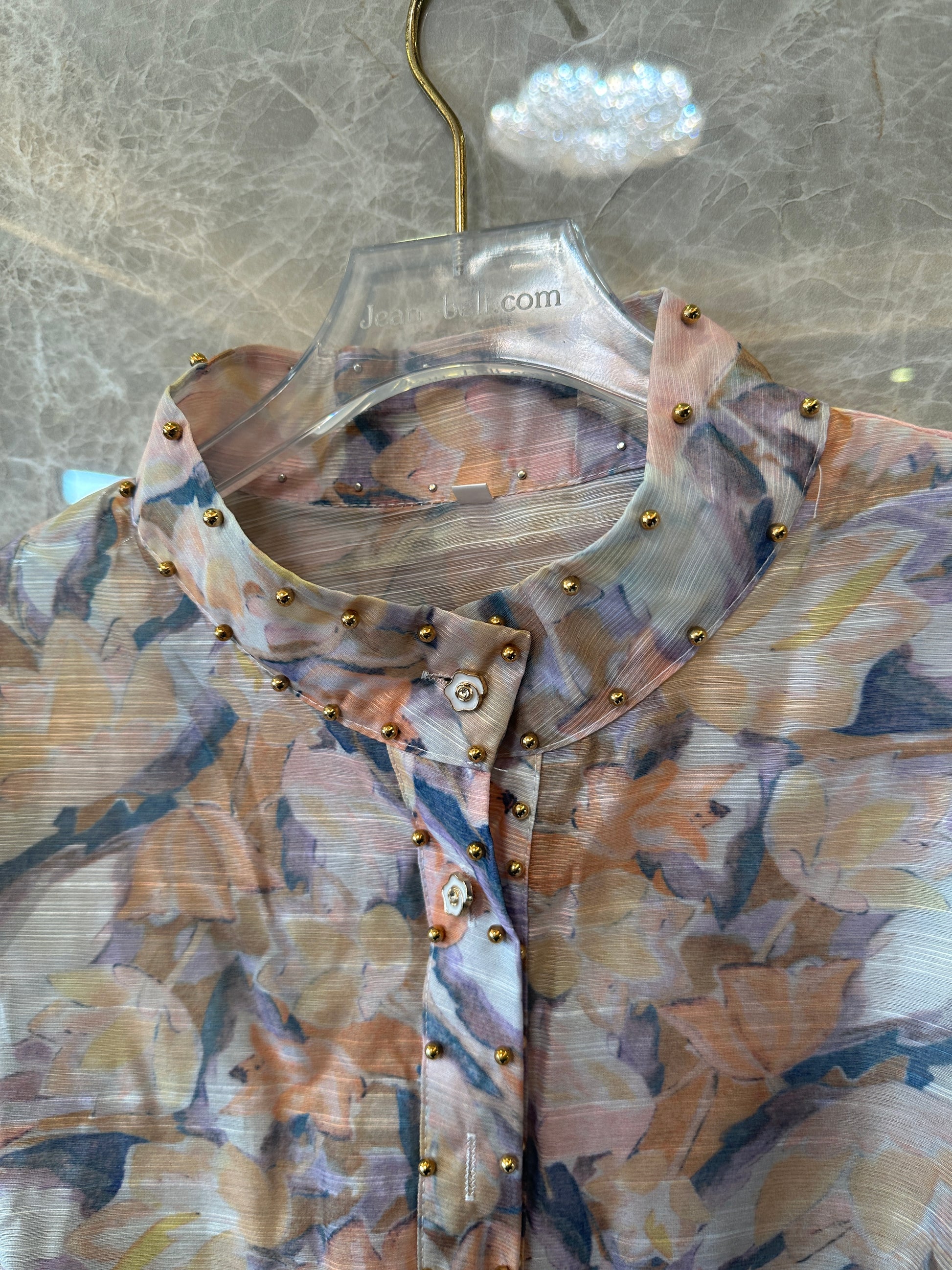 This Zimmermann two-piece set features a lightweight printed blouse paired with a matching mini skirt, designed to be worn together or styled separately. The blouse is detailed with a refined collar, front button closure, and long sleeves, creating a soft yet structured silhouette.