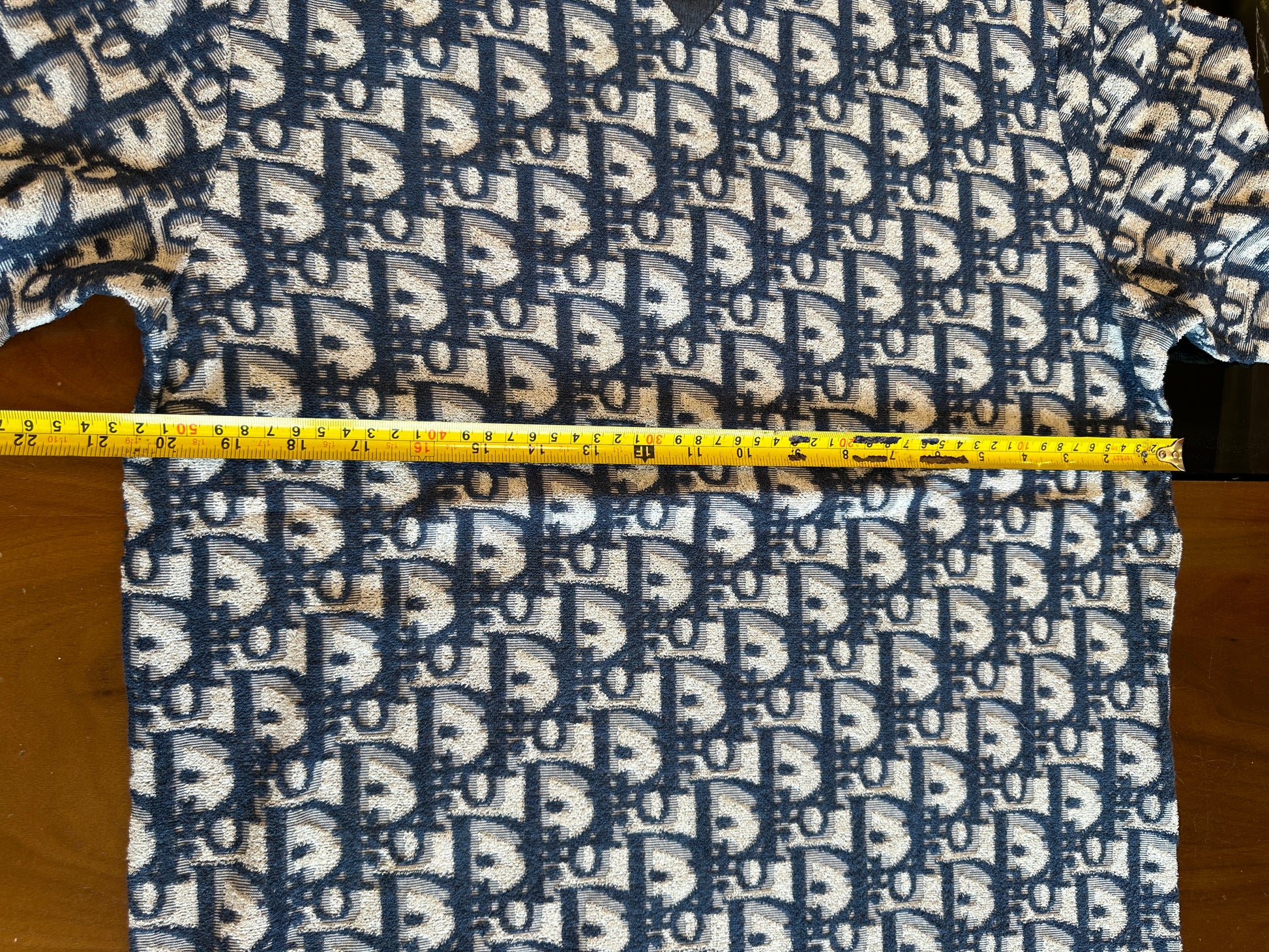 Esta t-shirt de jacquard Dior Oblique é uma peça marcante e elegante que exibe o monograma exclusivo da casa num padrão tricotado completo. Feita a partir de um tecido de jacquard de mistura de algodão macio e respirável, a t-shirt apresenta um decote redondo, mangas curtas e um corte descontraído para um conforto moderno. A combinação de cores azul-marinho e branco confere-lhe um apelo intemporal, tornando-a perfeita tanto para looks casuais como mais sofisticados.